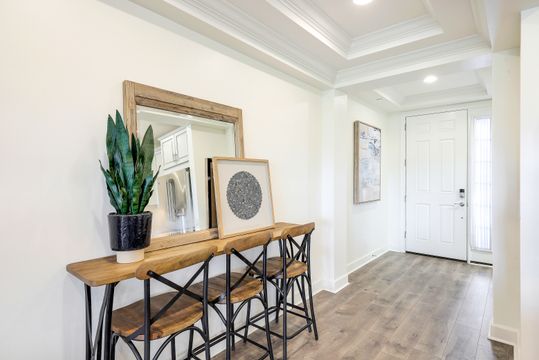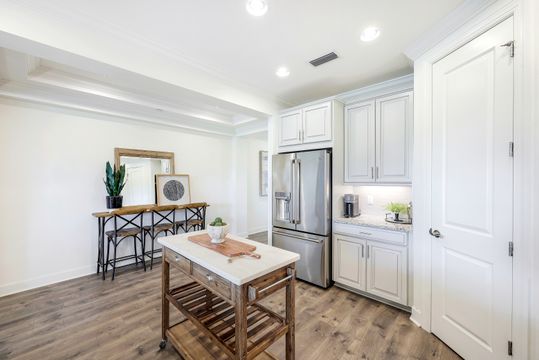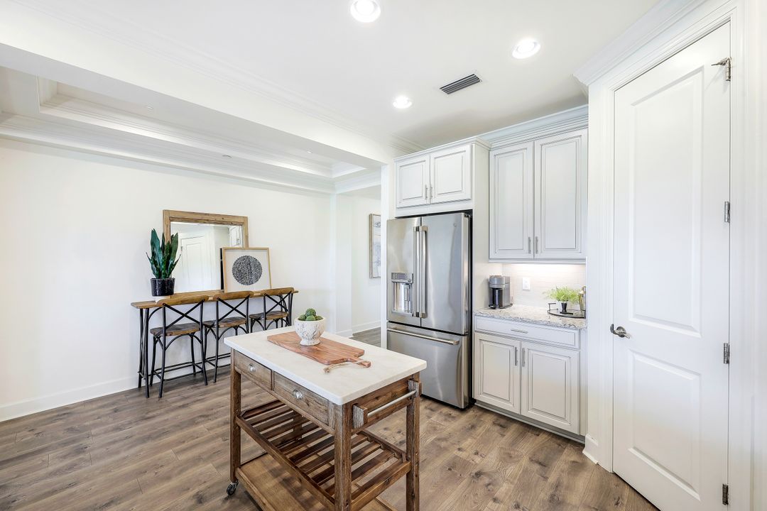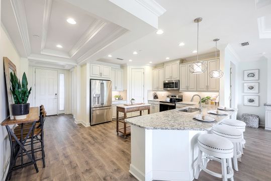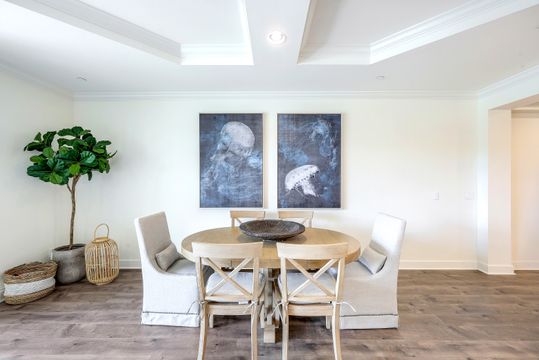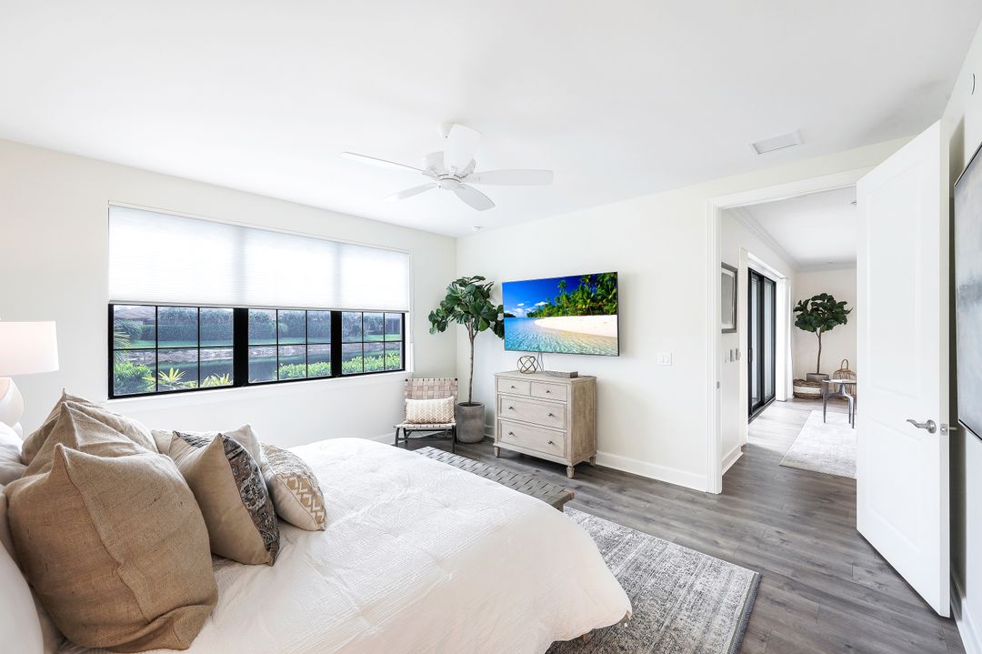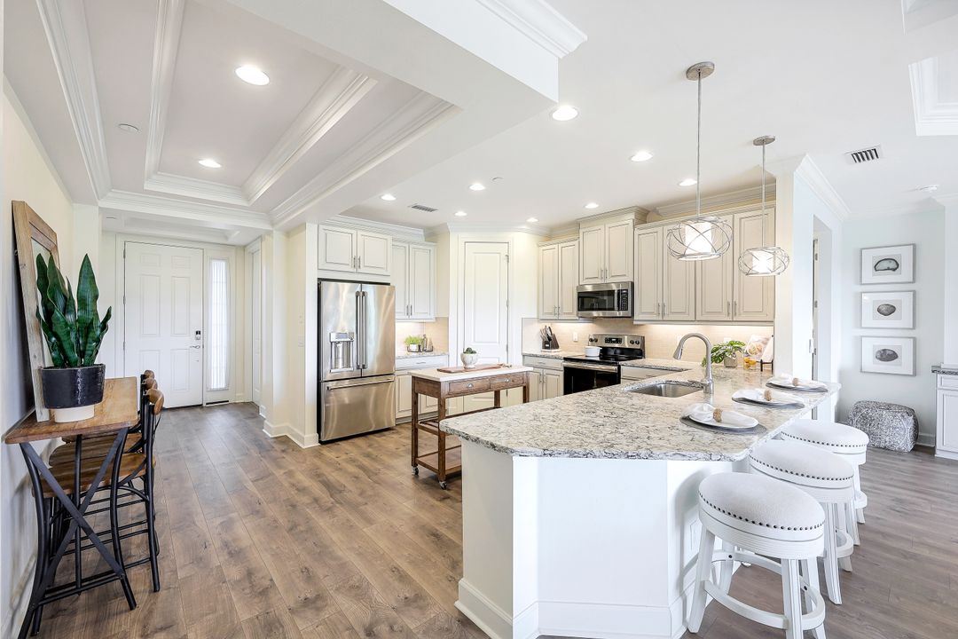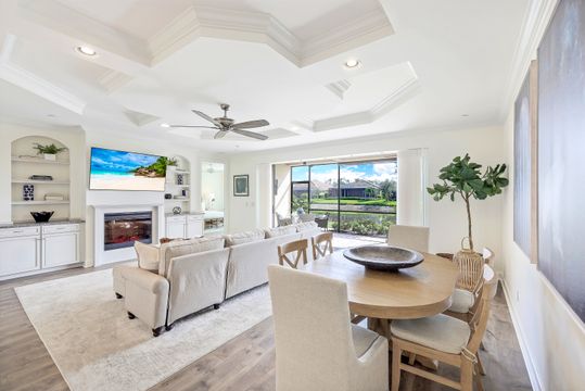 LIVE A VACATION LIFESTYLE IN ESPLANADE! This 2 bed/2 bath/1 car attached garage condo lives big with an open great room style floorplan, 16' pocket sliding glass door to a 23'x10' covered & screened lanai overlooking a tranquil lake. Fine appointments include: luxury laminate flooring throughout (no carpeting); electric blinds; closet built-ins; quartz countertops throughout; electric fireplace; frameless shower doors; IMPACT WINDOWS/DOORS; and more! This condo includes a CLUB/SPORTS MEMBERSHIP which gives you access to all amenities with the exception of in-season golf! Esplanade G&CC is a true "Lifestyle Community" with something for everyone: Resort Pool complete with cabanas and beach entrance; 6 tennis courts; 4 bocce balls courts; 4 pickleball courts; Koquina Day Spa offering hair, nail, facial, and spa treatments; Techno Gym with Aerobics Room; Gated Dog Park; Poolside Bahama Bar; 14 miles of bike/walking trails; 18 hole private golf course; 15,000 Sq Ft Culinary Center featuring restaurant, bars, wine tasting room, wine lockers, & Starbucks style cafe! Total dues just $833/month and includes water/sewer, insurance, building maintenance, & ALL club amenities!