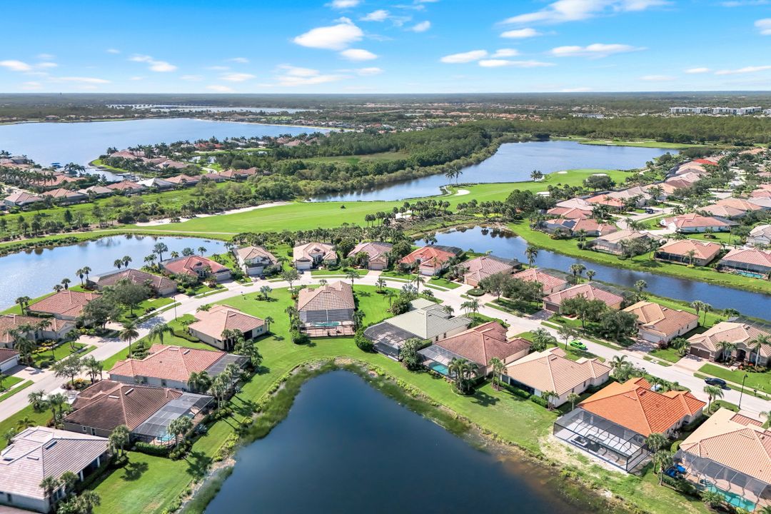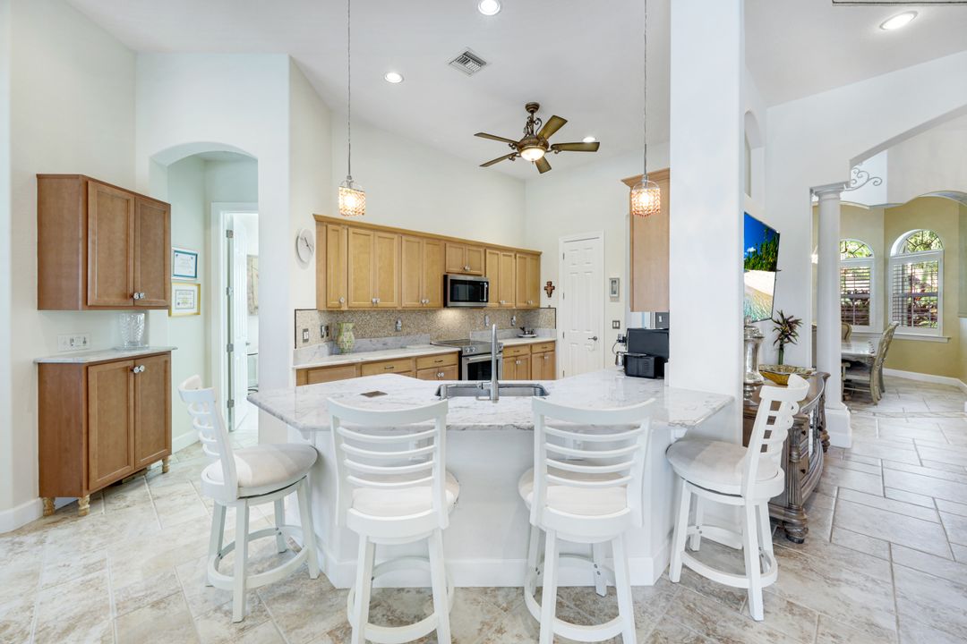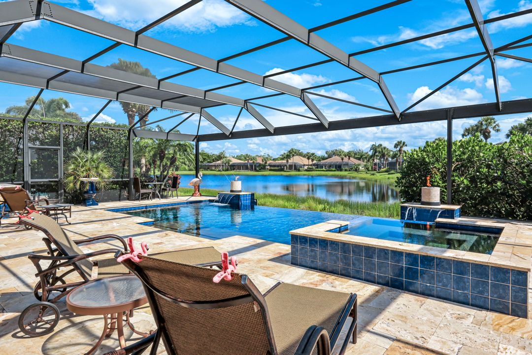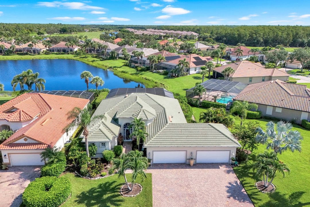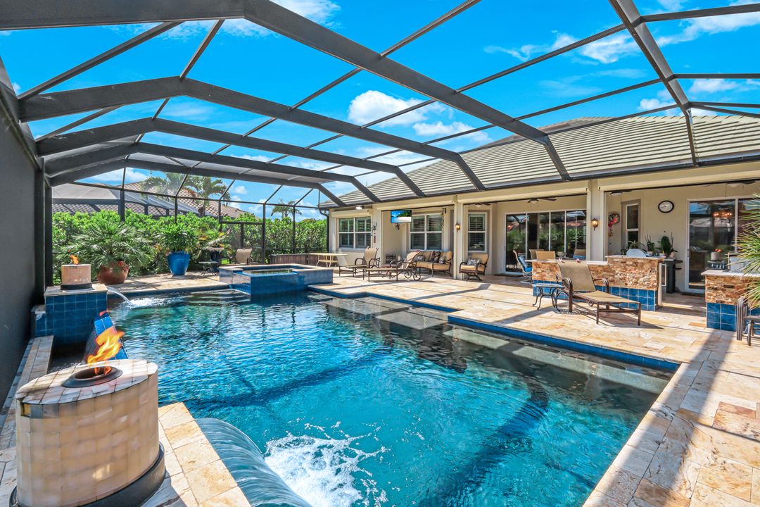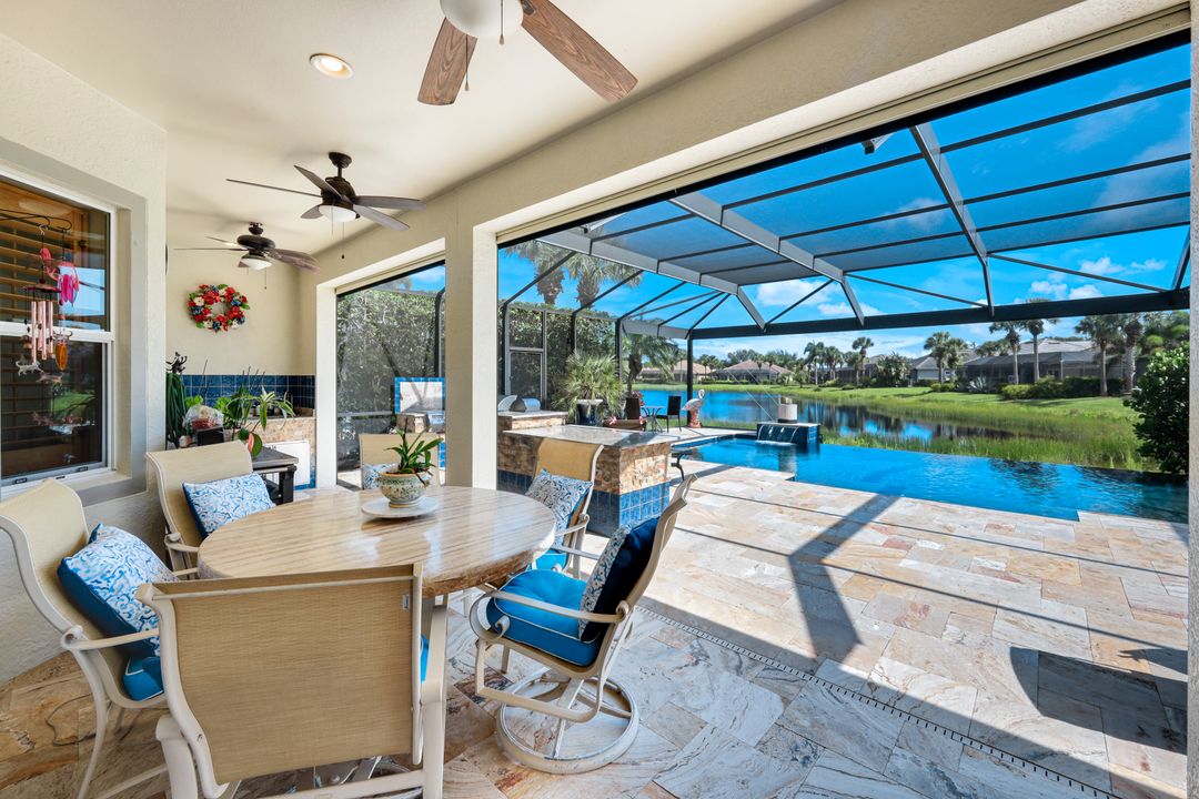 LIVE A VACATION LIFESTYLE IN A COUNTRY CLUB SETTING! This customized, spacious home features 3 BEDROOMS PLUS A DEN, 3 FULL BATHS, A RARE 4 CAR AIR CONDITIONED GARAGE and is situated on an oversized pie-shaped lot. This exceptional home is perfect for entertaining friends and family. Step outside to your private resort-style lanai, where a saltwater infinity pool and spa await - enhanced with breathtaking fire and water features, a picture window screen for unobstructed water views, and elegant marble travertine tile. The custom outdoor kitchen is fully equipped with an oversized stove, grill, sink, dishwasher, refrigerator, blender and plenty of built in storage, while the outdoor shower, nebula lighting, and lush landscaping add the perfect finishing touches to your outdoor oasis. Inside, enjoy a bright layout with porcelain tile and hardwood flooring throughout (no carpet), quartz countertops, a farm-style sink and custom tray ceilings. A long list of special features and upgrades include an air conditioned 4 car garage ideal for car collectors, boats, or a home gym, newer tile roof (2019), newer water heater (2024), newer HVAC (2021), custom outdoor landscaping and lighting throughout, freshly painted inside and out, electric storm and accordian shutters throughout, 500 gallon propane tank for heating the pool and spa plus more! This home is a "must see" to appreciate the finishing touches. Discover The Quarry—an exceptional lakefront community sprawled across over 500 acres of pristine lakes. This gated, amenity-rich environment is perfect for boating, water skiing, jet skiing, kayaking, and fishing enthusiasts. Enjoy the Beach Club, which features a resort pool, lap pool, hot tub, tennis, pickleball, and bocce courts, a Tiki bar with poolside food and beverage service, a state-of-the-art wellness center, and a full-time activities director who organizes a variety of social events. For golf lovers, The Quarry Golf Lodge offers an optional membership to its PGA-level Hurdzan-Frye 18-hole golf course. Experience the resort-style living you’ve always dreamed of in this extraordinary home!
