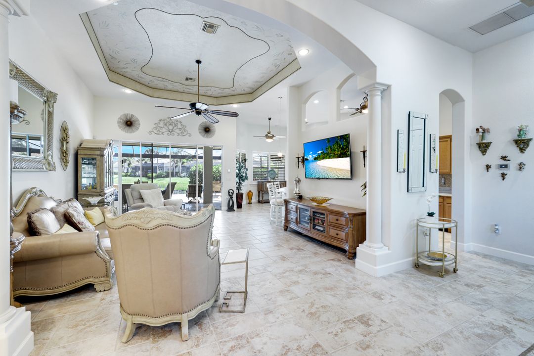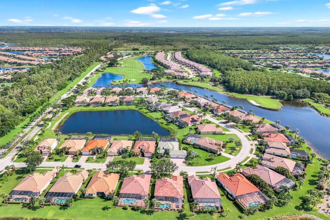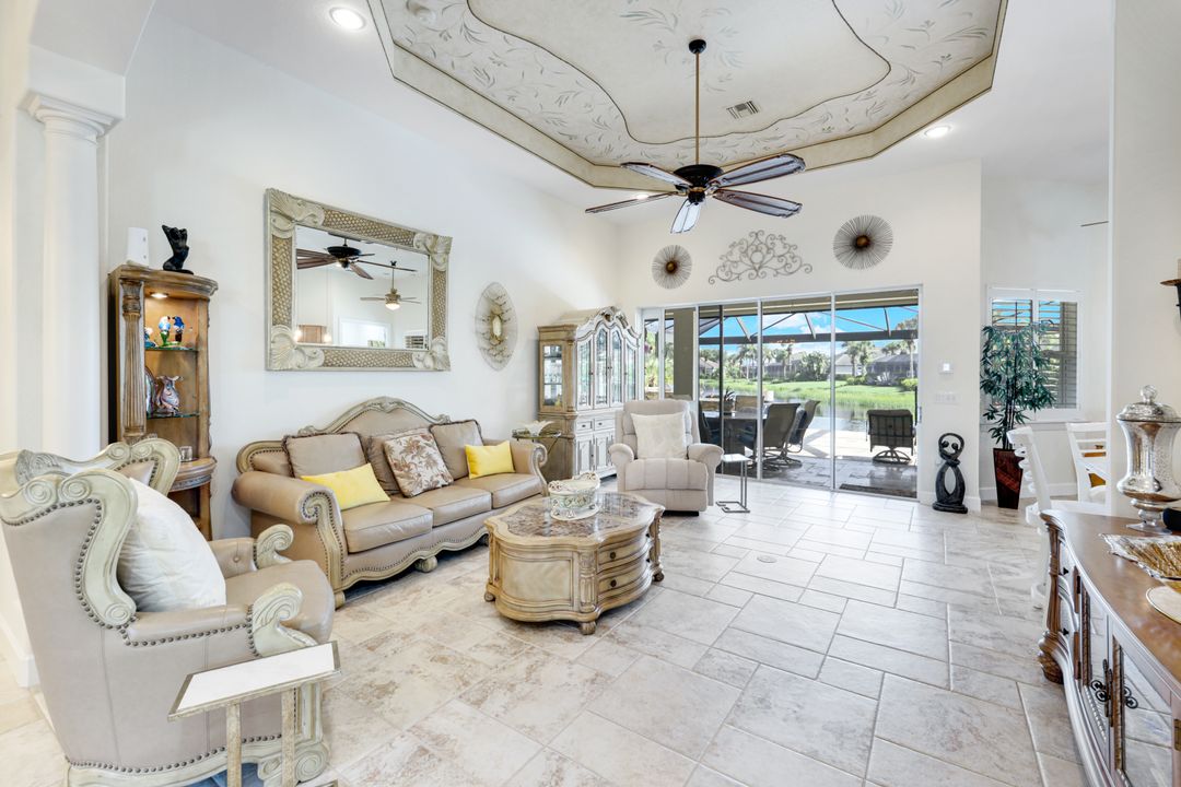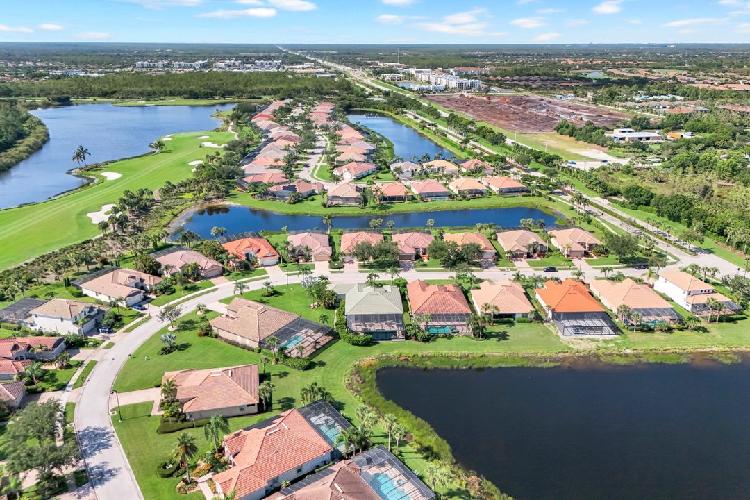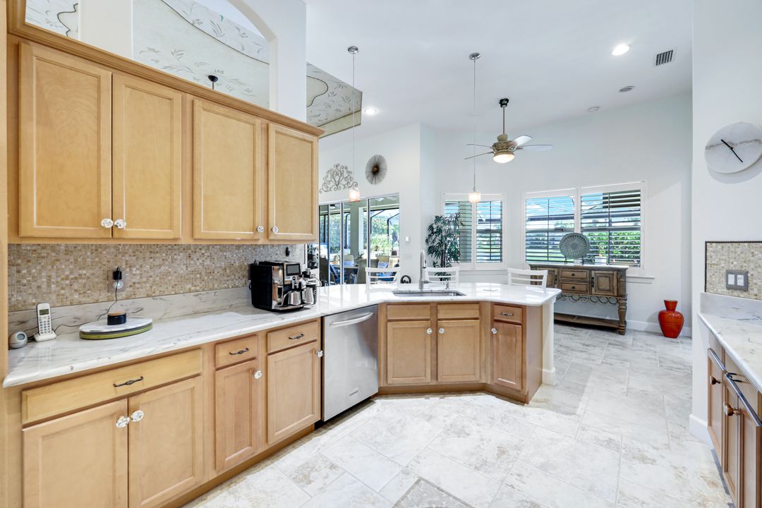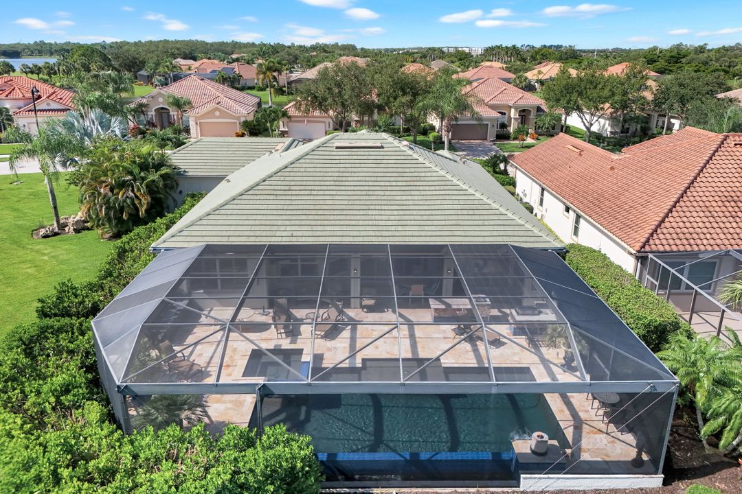LIVE A VACATION LIFESTYLE IN A COUNTRY CLUB SETTING! This customized, spacious home features 3 BEDROOMS PLUS A DEN, 3 FULL BATHS, A RARE 4 CAR AIR CONDITIONED GARAGE and is situated on an oversized pie-shaped lot. This exceptional home is perfect for entertaining friends and family. Step outside to your private resort-style lanai, where a saltwater infinity pool and spa await - enhanced with breathtaking fire and water features, a picture window screen for unobstructed water views, and elegant marble travertine tile. The custom outdoor kitchen is fully equipped with an oversized stove, grill, sink, dishwasher, refrigerator, blender and plenty of built in storage, while the outdoor shower, nebula lighting, and lush landscaping add the perfect finishing touches to your outdoor oasis. Inside, enjoy a bright layout with porcelain tile and hardwood flooring throughout (no carpet), quartz countertops, a farm-style sink and custom tray ceilings. A long list of special features and upgrades include an air conditioned 4 car garage ideal for car collectors, boats, or a home gym, newer tile roof (2019), newer water heater (2024), newer HVAC (2021), custom outdoor landscaping and lighting throughout, freshly painted inside and out, electric storm and accordian shutters throughout, 500 gallon propane tank for heating the pool and spa plus more! This home is a "must see" to appreciate the finishing touches. Discover The Quarry—an exceptional lakefront community sprawled across over 500 acres of pristine lakes. This gated, amenity-rich environment is perfect for boating, water skiing, jet skiing, kayaking, and fishing enthusiasts. Enjoy the Beach Club, which features a resort pool, lap pool, hot tub, tennis, pickleball, and bocce courts, a Tiki bar with poolside food and beverage service, a state-of-the-art wellness center, and a full-time activities director who organizes a variety of social events. For golf lovers, The Quarry Golf Lodge offers an optional membership to its PGA-level Hurdzan-Frye 18-hole golf course. Experience the resort-style living you’ve always dreamed of in this extraordinary home!