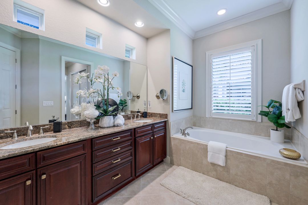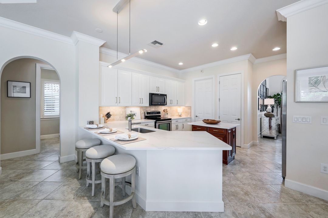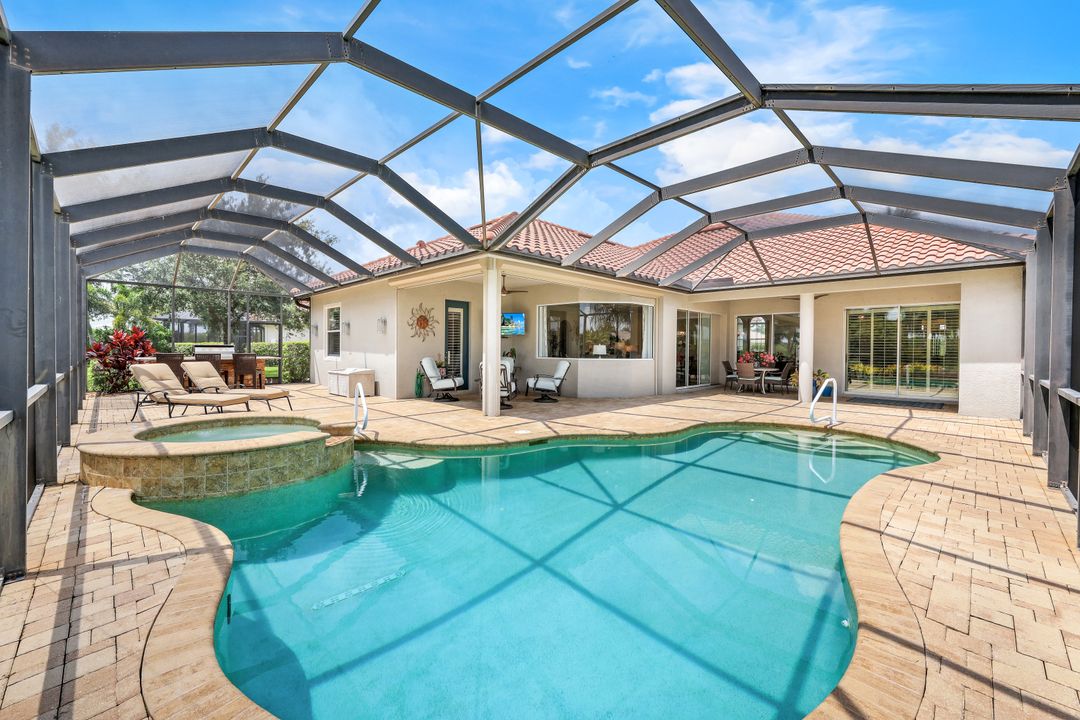 LIVE A VACATION LIFESTYLE IN THE QUARRY! This immaculate home is situated on an oversized pie shaped lot offering privacy, water, and golf course views. Step inside and be greeted with a light & bright floorplan, 12' ceilings, diagonal and wood look tile floors throughout (no carpet), 7" crown molding, plantation shutters, and more! The kitchen features brand new quartz countertops, white painted cabinets, new dishwasher, and stone backsplash. Enjoy the Florida sun around the salt water pool & spa, two separate covered areas, outdoor kitchen, and electric storm shutters. The Quarry is a lakefront community offering something for everyone: Boating, Golf, Tennis, Pickleball, Bocce Ball, Tiki Bar, Restaurant, Pool-Side Food/Drink Service, Gym, Social Activities including Full Time Social Director, and more! The Quarry offers a lifestyle like no other, including an impressive "Lake Lodge" and over 500 acres of navigable lakes and a private 18 hole Golf Club (Not Mandatory). An impressive $18M renovation & expansion of the Lake Lodge & Beach Club is under way and is to be completed fall 2023. HOA dues include access to ALL community amenities (with the exception of The Golf Lodge/Golf)/No memberships required!