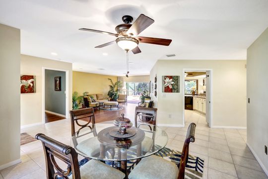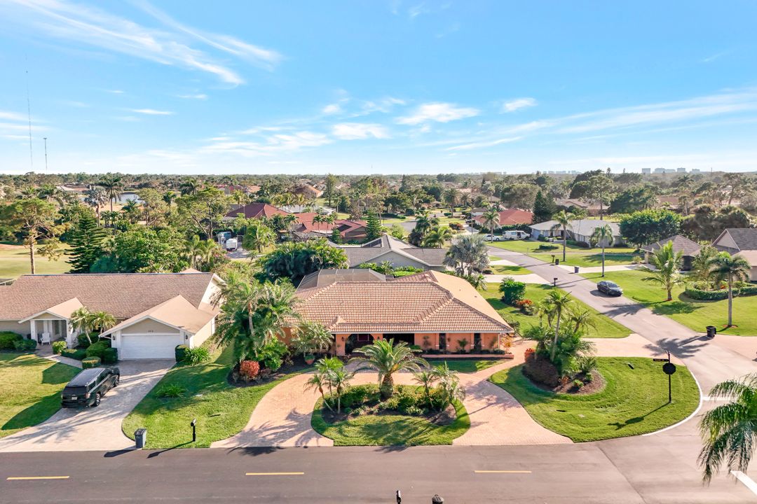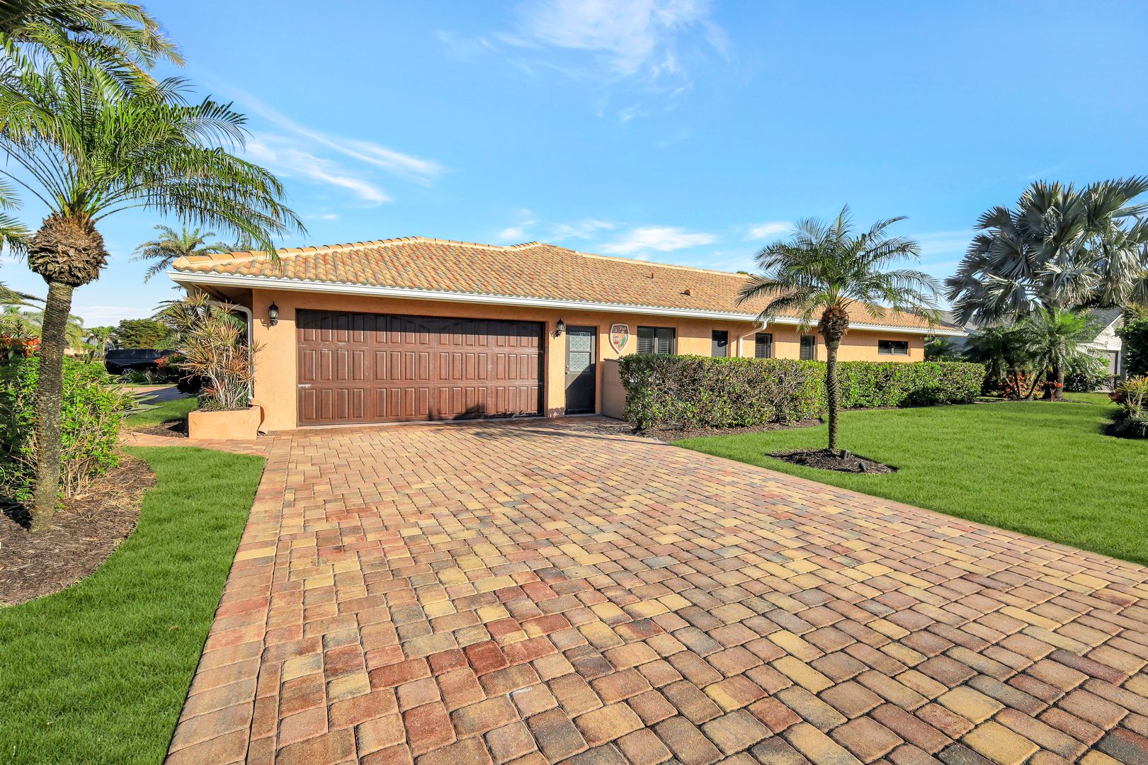 Welcome to Spanish Wells Golf & Country Club where low HOA fees and Golf opportunities live. This is a must see spacious L-Shaped ranch style home with abundant outdoor spaces, a huge covered lanai and a beautiful sparkling heated saltwater swimming pool. This home features ceramic tile and wood floors throughout the living areas, vaulted ceiling in the family room with built-in TV console and bar area, formal dining room and sunken living room with a huge pocketing slider that leads to the spacious private pool area. The owners have added a large paver driveway plus a circular driveway offering tons of parking. Many recent updates throughout.