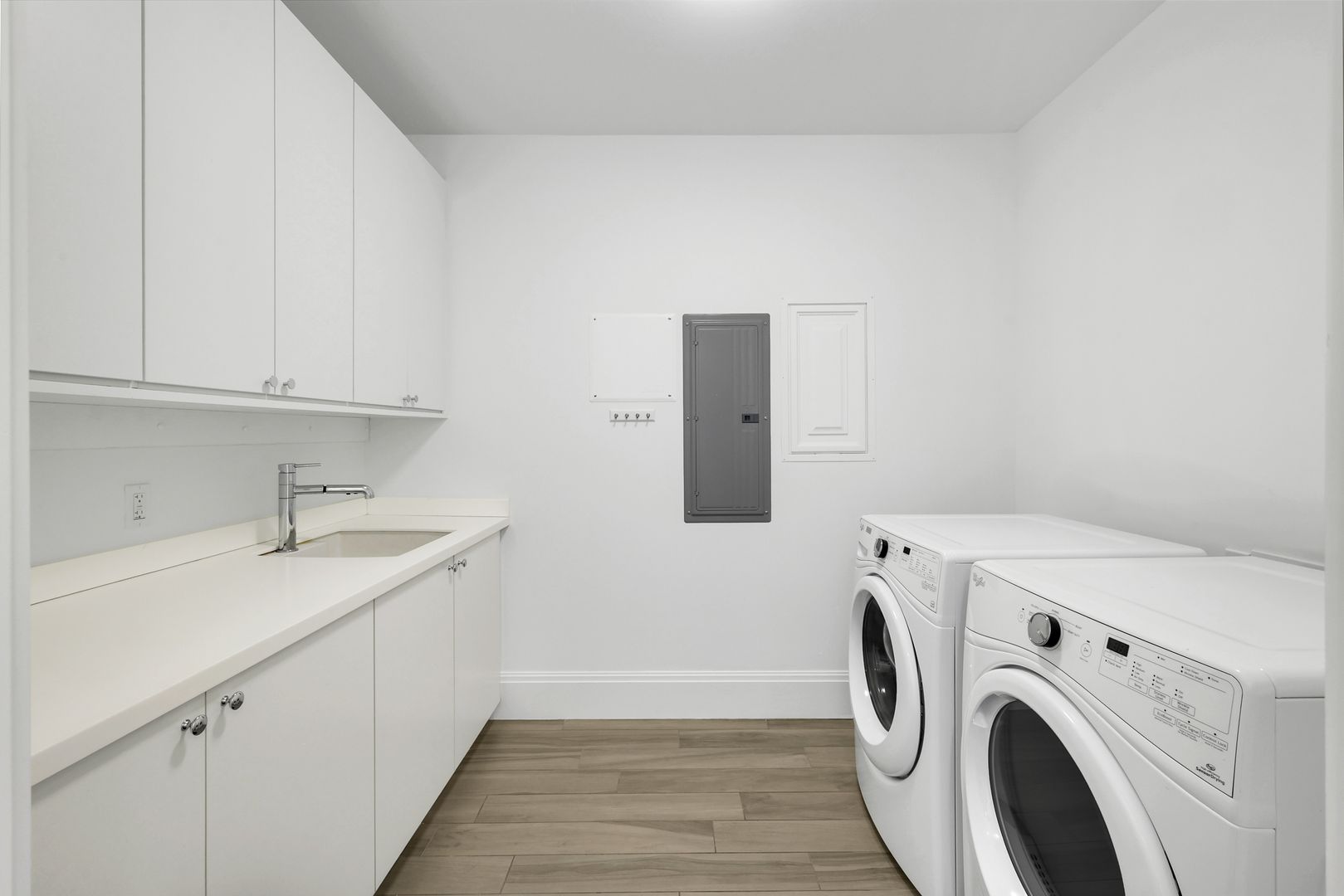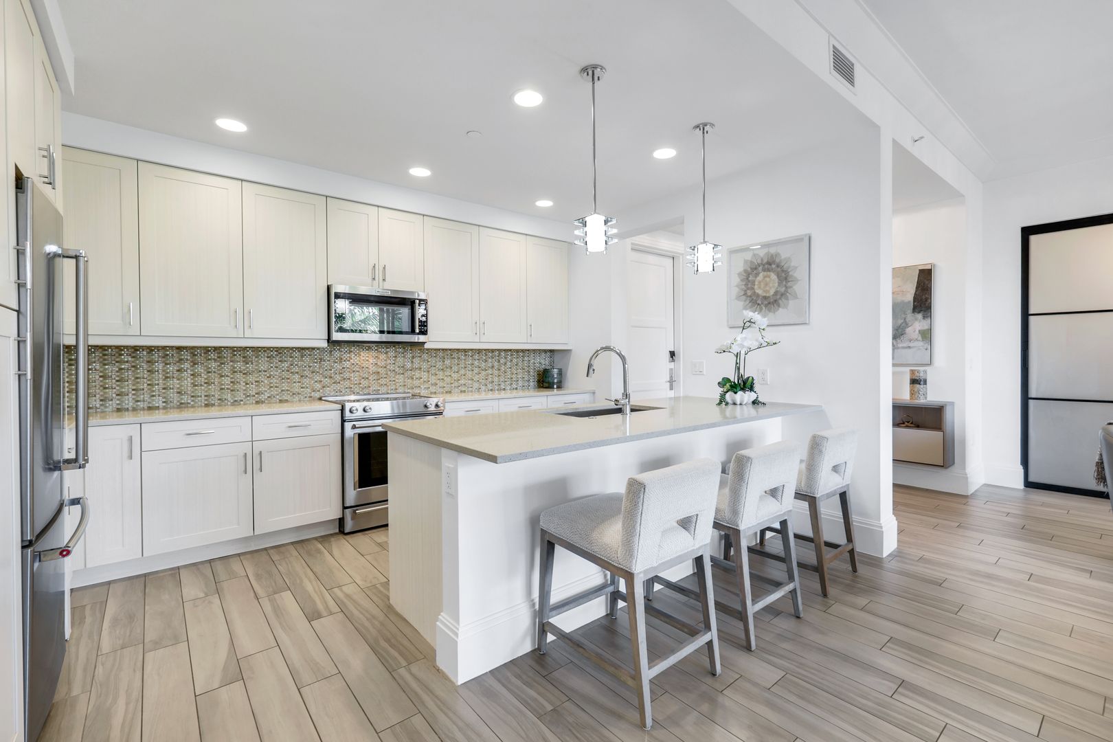 Inside, the spacious great room provides the perfect place to relax on the sofa or enjoy delicious meals with family & friends. A custom den is accessed through striking metal and frosted glass doors, offering an elegant space for a home office or relaxation. A thoughtfully designed California Closets built-in wall features a queen-size Murphy bed and integrated dresser, allowing the den to easily convert into an additional guest bedroom. The bathrooms have been tastefully upgraded with custom tile finishes and glass door enclosures, enhancing both style and functionality.