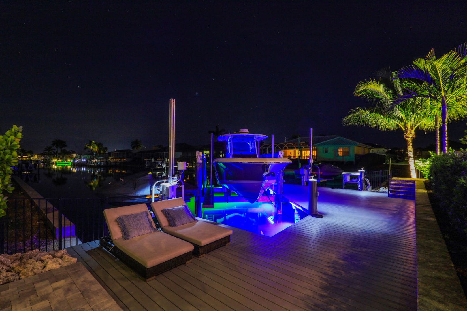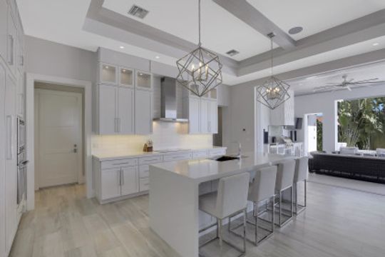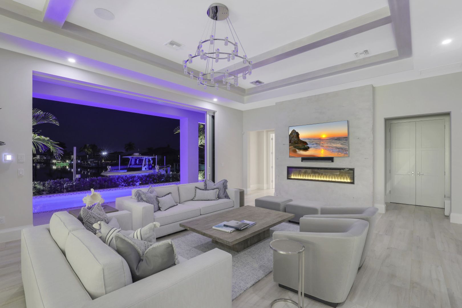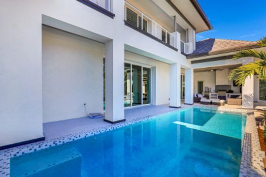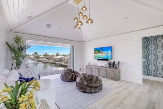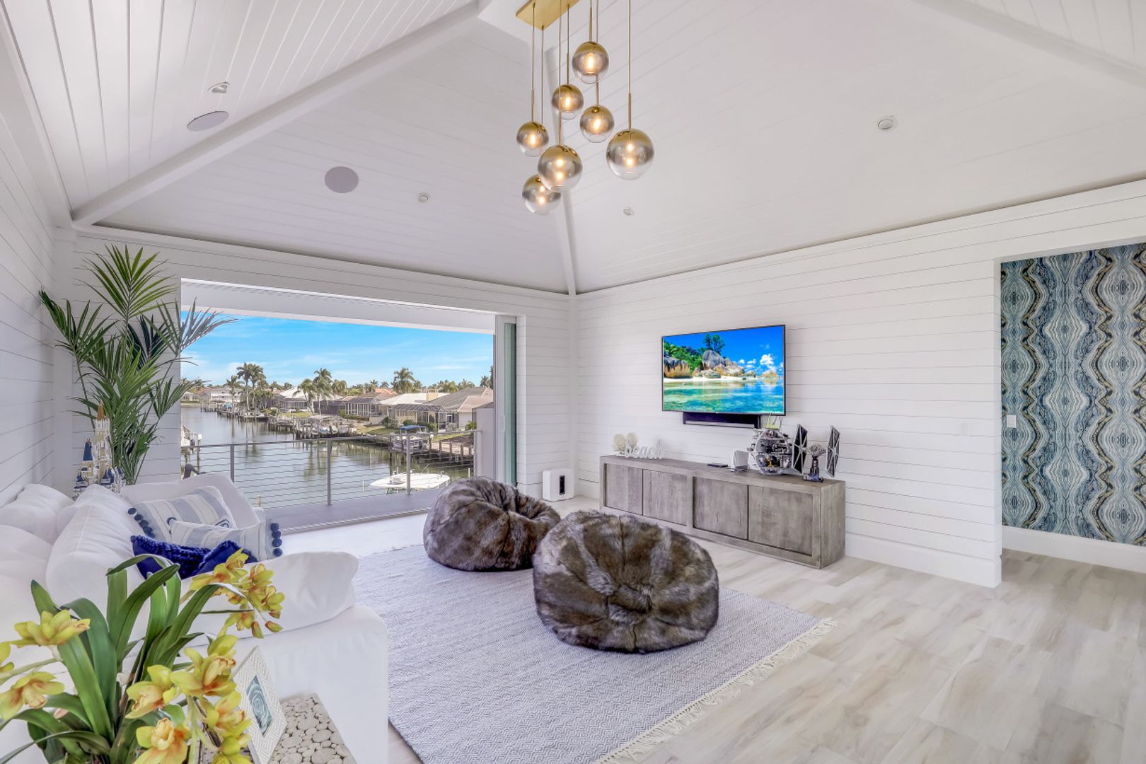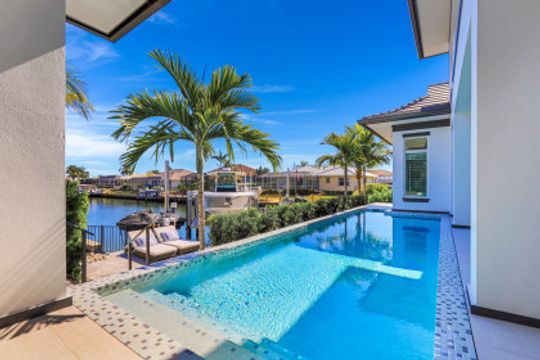 BETTER THAN NEW WATERFRONT CONSTRUCTION with long water views. This exceptionally well built all concrete 5 bedroom 5 & half bath home boasts super high end finishes. It features wood look tile throughout, exotic Quartz countertops, shaker cabinetry, Thermador appliances, soaring ceilings, 10 ft tall pocketing sliders, custom closets and an elevator. A full home Sonos system and security system can all be controlled from the smart home iPad. There is a separate in-law suite on the main floor with a private entrance for longer quest stays with its own private lanai. Upstairs features 2 bedroom suites, a wet bar, and a surround sound home theater loft area that is flanked by two balconies. The custom pool is long enough for laps and the completely private in ground spa is perfect for relaxing after a long day on the boat or at the beach. A custom dock has been installed for up to a 38 foot boat with a 13+ foot beam on a 24k lift, 2 jet ski lifts, underwater lights and shore power. Quick Gulf access and super close proximity to Resident’s Beach access are sure to please boaters and beachgoers! The home is being sold fully furnished with all Restoration Hardware furniture throughout.