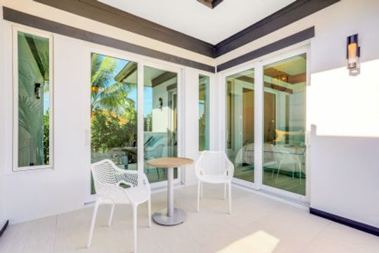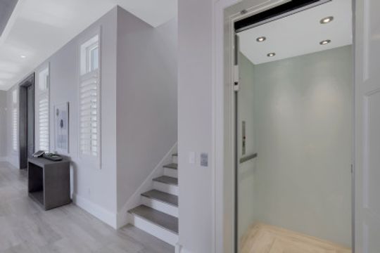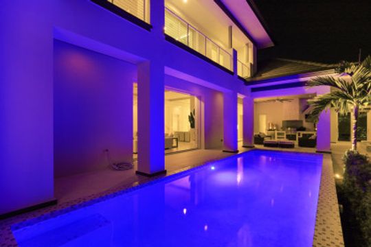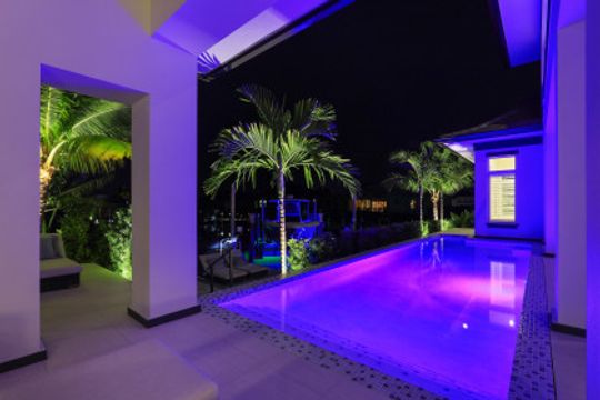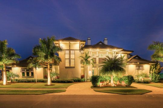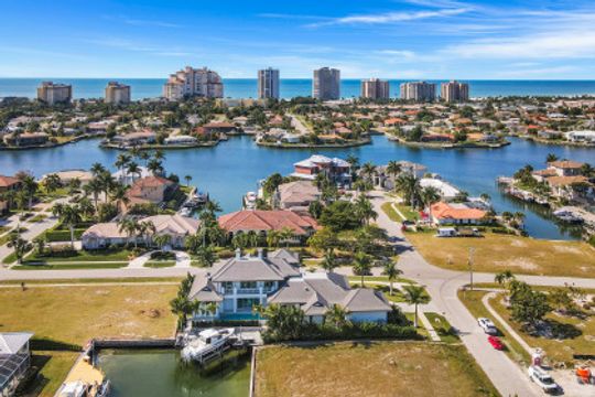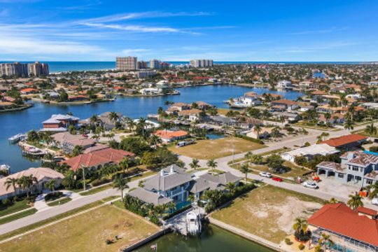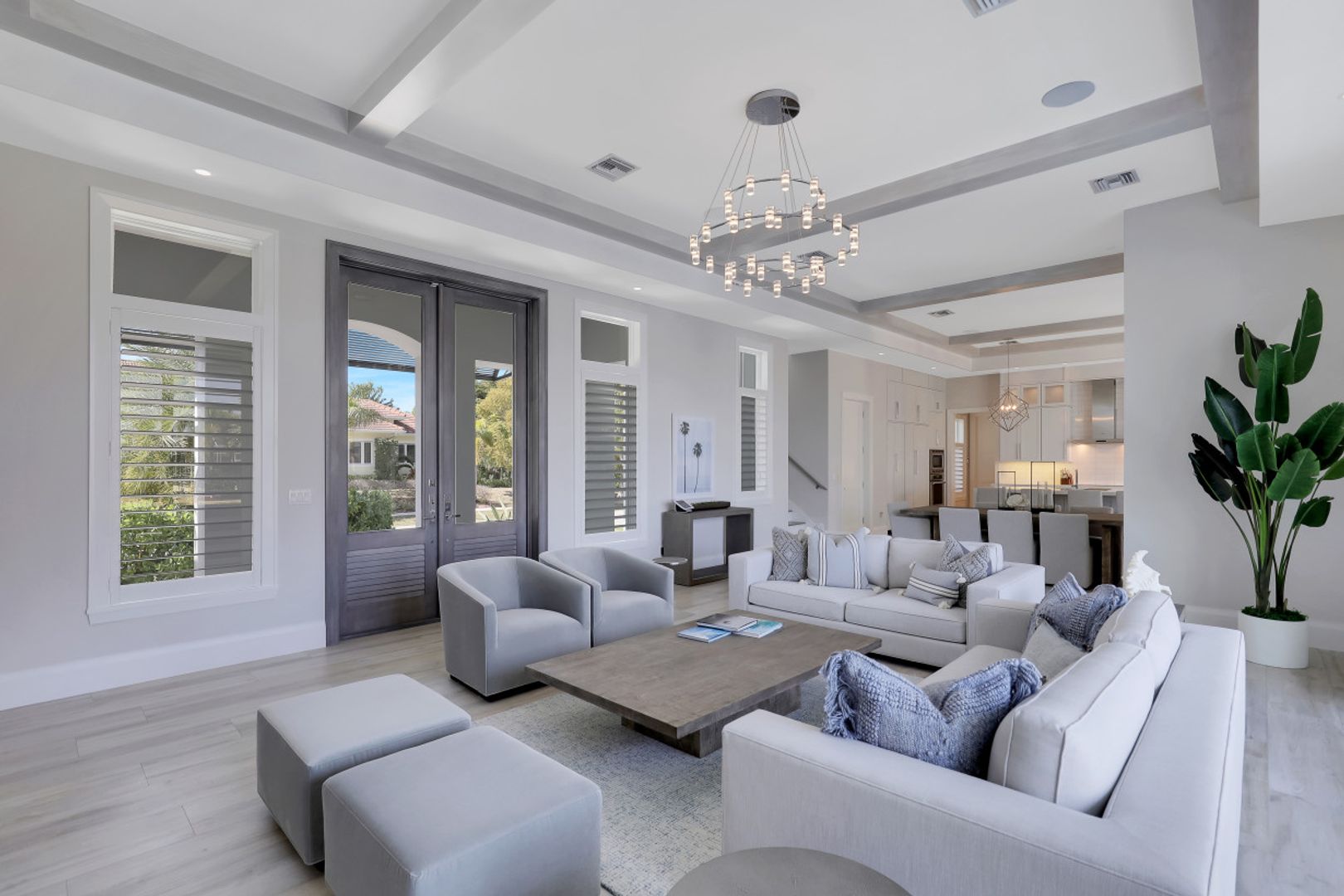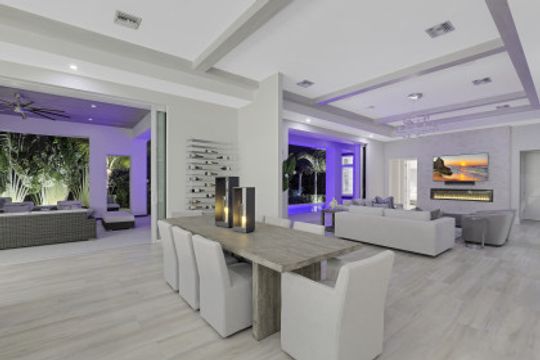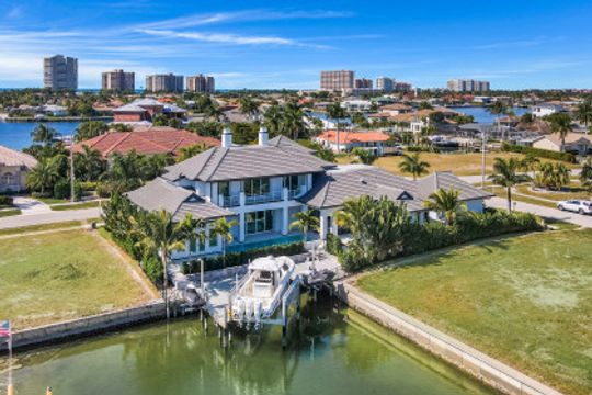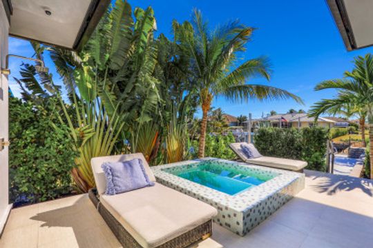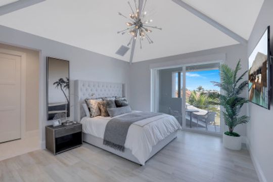 BETTER THAN NEW WATERFRONT CONSTRUCTION with long water views. This exceptionally well built all concrete 5 bedroom 5 & half bath home boasts super high end finishes. It features wood look tile throughout, exotic Quartz countertops, shaker cabinetry, Thermador appliances, soaring ceilings, 10 ft tall pocketing sliders, custom closets and an elevator. A full home Sonos system and security system can all be controlled from the smart home iPad. There is a separate in-law suite on the main floor with a private entrance for longer quest stays with its own private lanai. Upstairs features 2 bedroom suites, a wet bar, and a surround sound home theater loft area that is flanked by two balconies. The custom pool is long enough for laps and the completely private in ground spa is perfect for relaxing after a long day on the boat or at the beach. A custom dock has been installed for up to a 38 foot boat with a 13+ foot beam on a 24k lift, 2 jet ski lifts, underwater lights and shore power. Quick Gulf access and super close proximity to Resident’s Beach access are sure to please boaters and beachgoers! The home is being sold fully furnished with all Restoration Hardware furniture throughout.