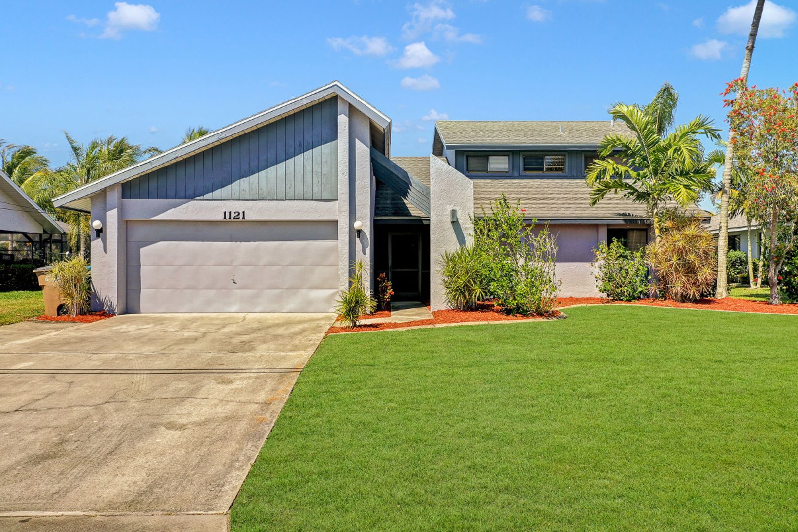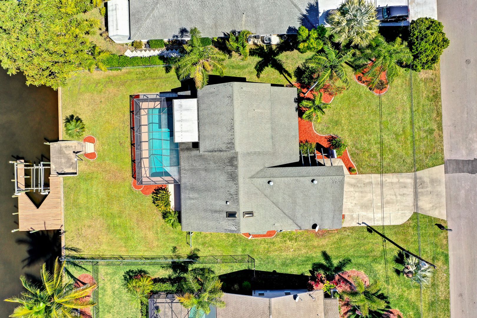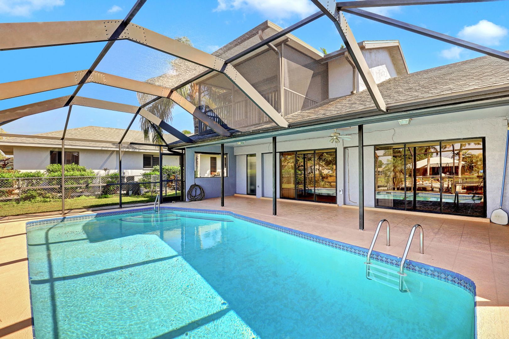 Amazing location with Gulf access and minutes to the river. This spacious three-bedroom, three-bath plus den offers a floor plan with over 2,200 square feet of living space, a boat dock and a lift. The second-floor room could serve as a master bedroom with a walk-in closet, balcony and full bath. While it needs few updates, this home features skylights in the kitchen, tiles in the main area, a spacious lanai and a generous-sized pool facing the canal. Palm trees around the house and a secluded location—this home is just minutes to some of the great shopping and dining of Cape Coral and a short boat ride to the Gulf.