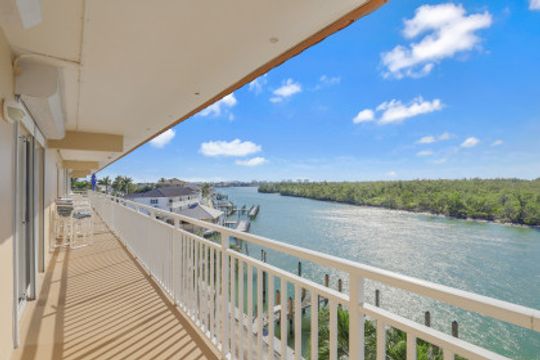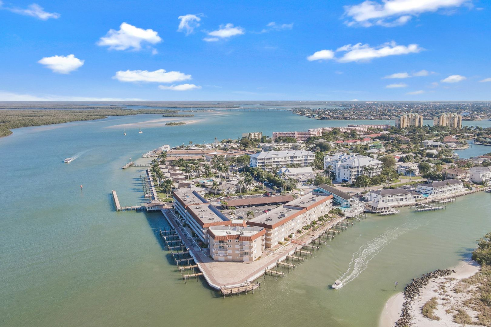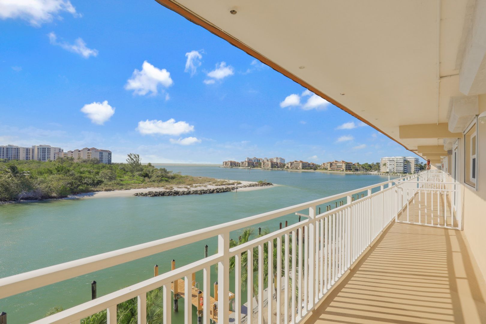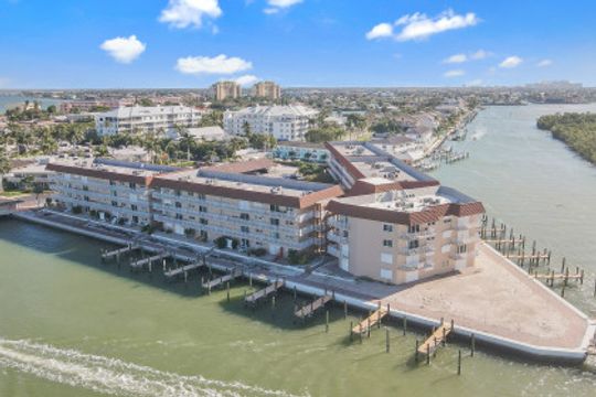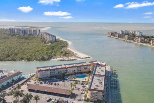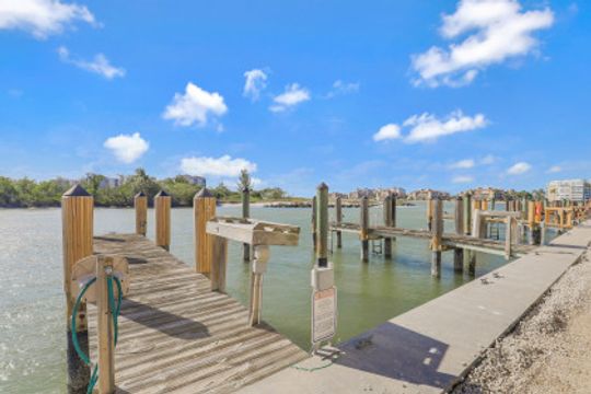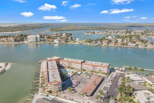 Top floor two-bedroom, two-full-bath condominium with westerly exposure offering magnificent and stunning views of the Gulf of Mexico, Collier Bay, Marco River, The Channel and Hideaway Beach. Enjoy spectacular sunsets, watch the dolphins play or boats passing by from your spacious open lanai. Updated with new appliances, furnace, air conditioner, water heater, front door, screen door, ceiling fans, kitchen lighting, faucets, wood shutters on interior windows, carpet in bedrooms, and hurricane windows and doors. Includes deeded boat dock #2 and additional storage. Turnkey furnished and ready for you to move-in. Large common washer and dryer close by. Great community pool, barbecue area and fishing pier. Located in Old Marco and close to shops and restaurants.