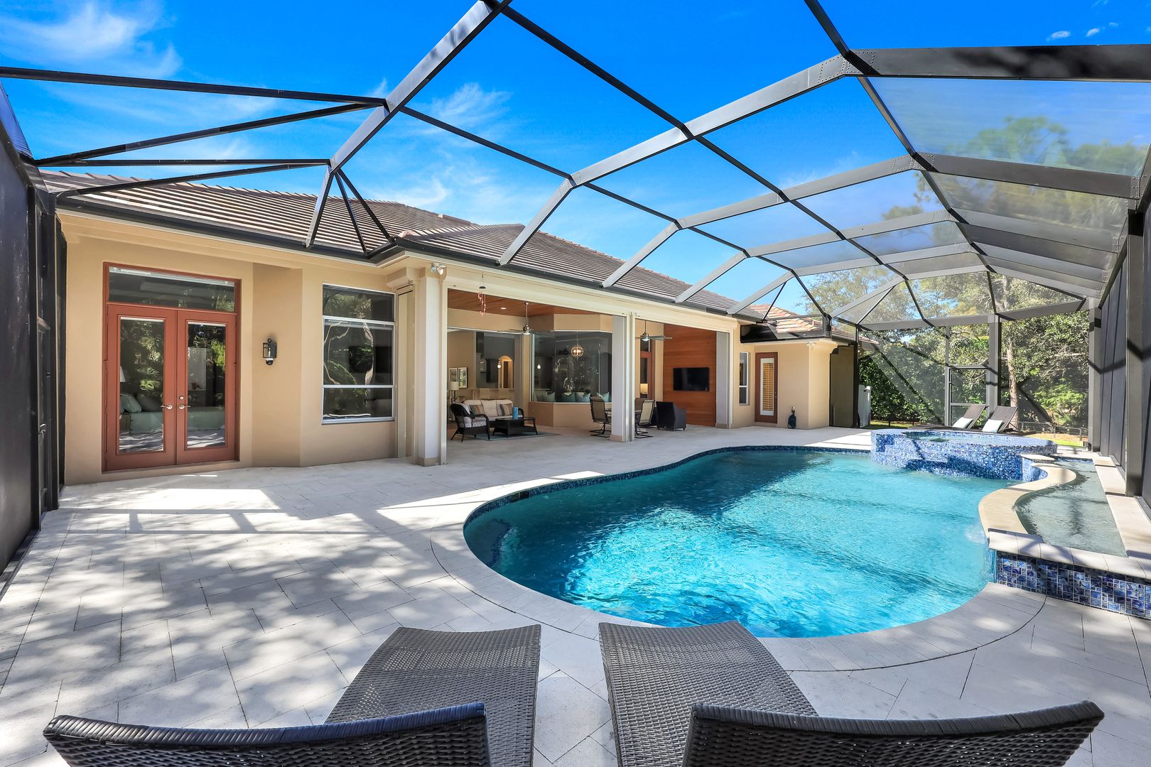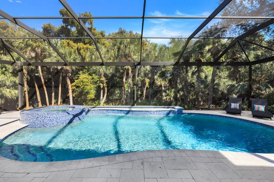 Where Indoor-Outdoor Living Takes Center Stage. Sited on an oversized 24,000-square-foot lot, this sprawling ranch-style residence is designed to erase the boundaries between indoors and out. Light-bathed interiors rise to 12–14 ft ceilings, while a 22-ft great room dissolves completely via telescoping sliders—opening the home to uninterrupted views of lush tropical foliage beyond the expansive lanai. A sophisticated reimagining has transformed the open-concept plan, blending a chef-inspired kitchen with walk-in pantry, morning-room banquette, and wine bar into seamless living and dining spaces—perfectly attuned to an indoor–outdoor lifestyle. Warm wood floors, custom ceiling details and refined wall treatments along with stylish remodeled bathrooms create a modern yet welcoming ambiance. Offering 4,132 AC sq ft on one level, the home features four ensuite bedrooms, two half baths, and an office with walk-in closet that flexes effortlessly into a fifth bedroom. XL walk-in wardrobes with custom systems and generous closets throughout elevate everyday luxury. Outdoors, a renovated saltwater pool and spa—both gas-heated—anchor a travertine lanai deck framed by a new panorama-panel screen enclosure. New landscaping blends naturally with the preserve backdrop, adding to the home’s beautiful surroundings and peaceful privacy. With no homes across the street, serene lake and golf views unfold to the south, while a long paver drive, double-wide motor court, and side-entry three-bay garage enhance the home’s impressive curb appeal—punctuated by a new tile roof. Recent upgrades include motorized Storm Smart screens, new Pentair pool equipment, new HVAC and water heating systems, an Aquakleen reverse osmosis system, new window treatments incl. motorized Hunter Douglas shades, and more. Located within Collier’s Reserve—less than 2 miles to Vanderbilt Beach at Wiggins Pass—residents enjoy a gated, highly coveted Audubon Sanctuary community with world-class golf, active tennis and pickleball programs, fitness & wellness, bocce and kayaking, multiple dining venues and a vibrant social calendar, complemented by a distinctive commitment to environmental stewardship.