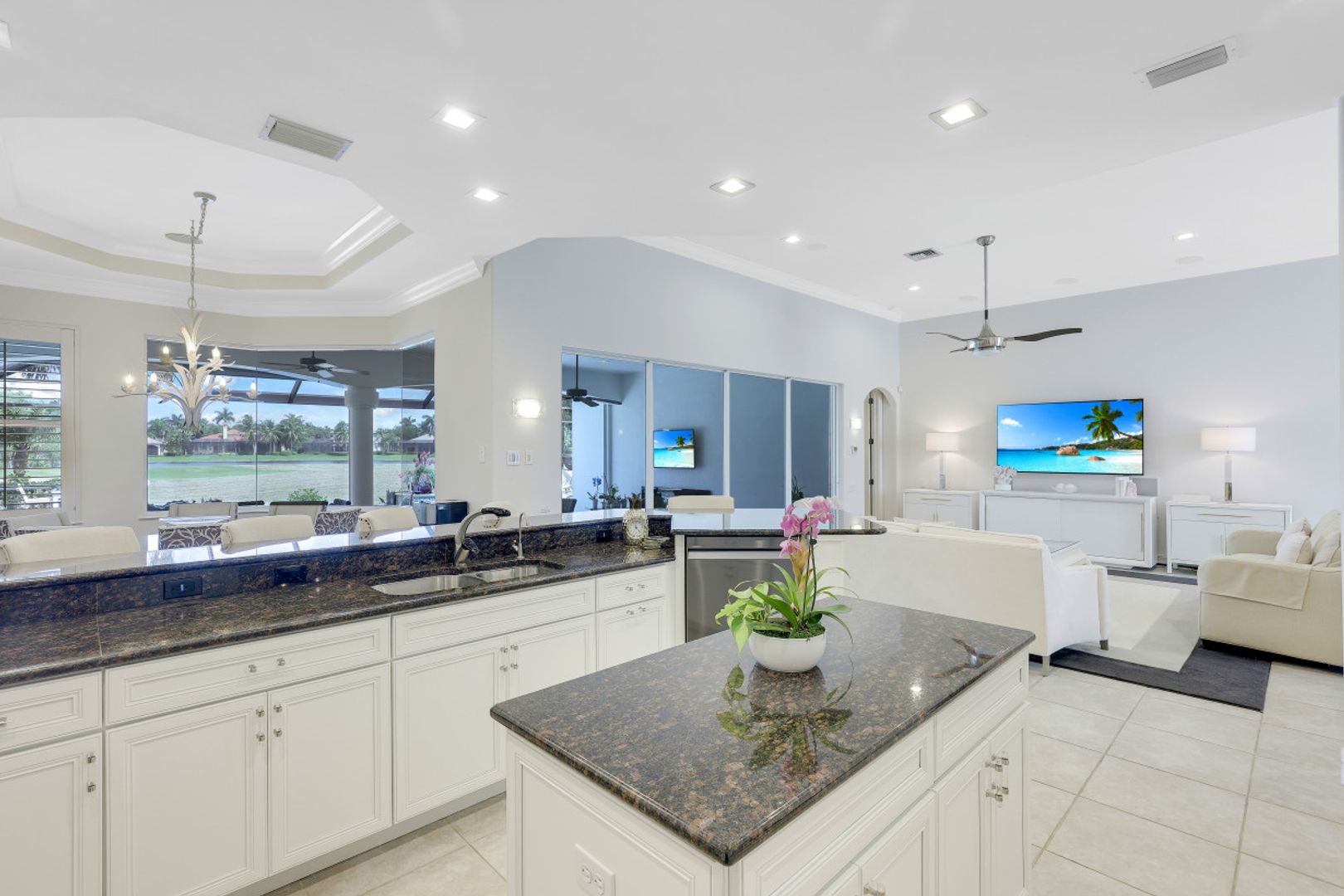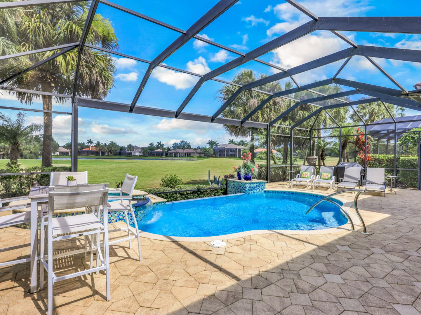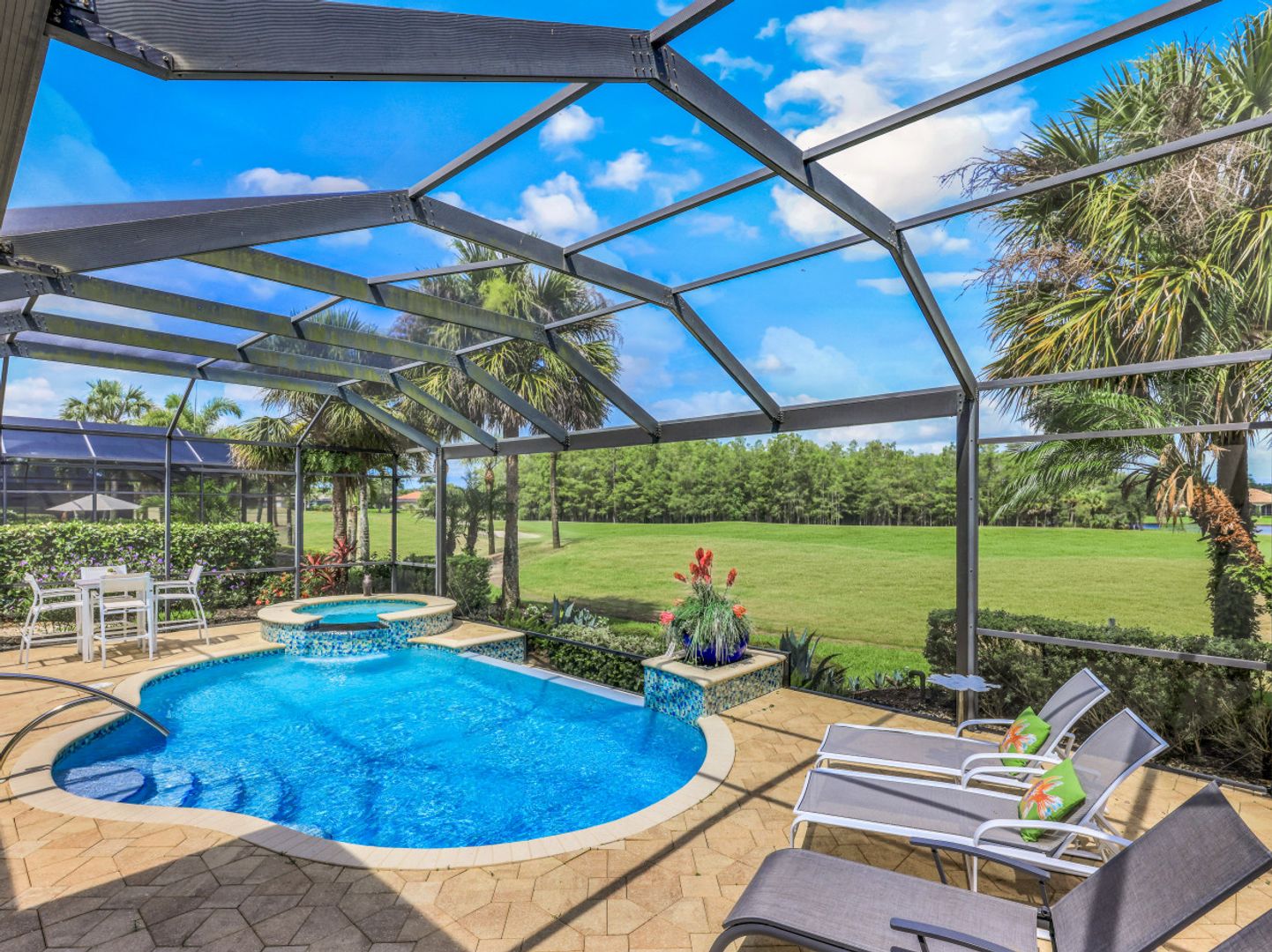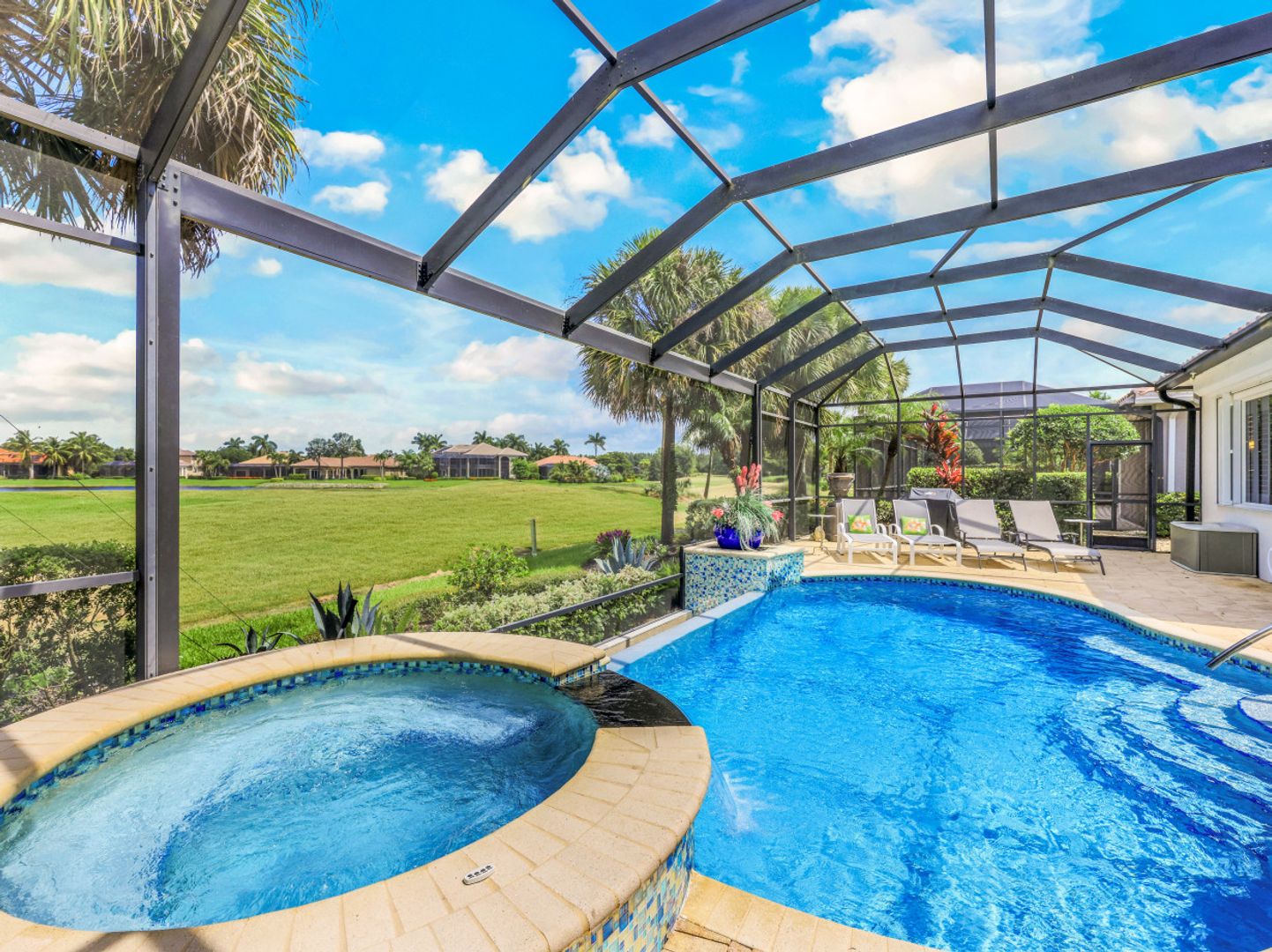 Welcome home to this incredible property, located in the Villagio neighborhood of Renaissance! Offered turnkey furnished (minus exclusions) and is exceptionally appointed with upscale furnishings. Enjoy upgraded appliances including Sub-Zero refrigerator, Wolf double oven and cooktop, and a brand new dishwasher. This home offers maximum space to entertain and host with large dining and bar area giving the ability to seat 12 — and a den space outfitted with a wet bar, oversized Sub-Zero wine cooler and Murphy Bed for overnight guests. You will love the spectacular lake and golf course views on Hole #7 as this west-facing home invites you to enjoy the sought after SWFL indoor/outdoor lifestyle and incredible sunsets. The outdoor screened-in living area showcases a gorgeous infinity pool & spa, and entertaining area with a TV and electric fireplace. Renaissance is a low density, luxury golf community located at the Daniels Corridor in Fort Myers, FL. The Renaissance lifestyle includes an Arthur Hills Championship Golf Course, resort style pool and pool pavilion, children’s play area, full service spa & fitness center, 6 red clay tennis courts, 2 pickle ball courts and 2 bocce courts.