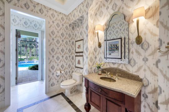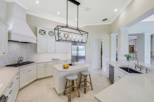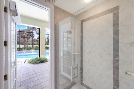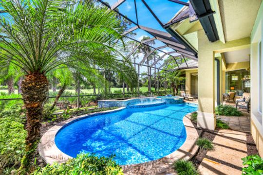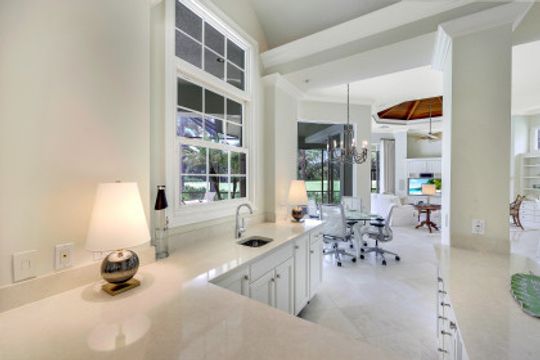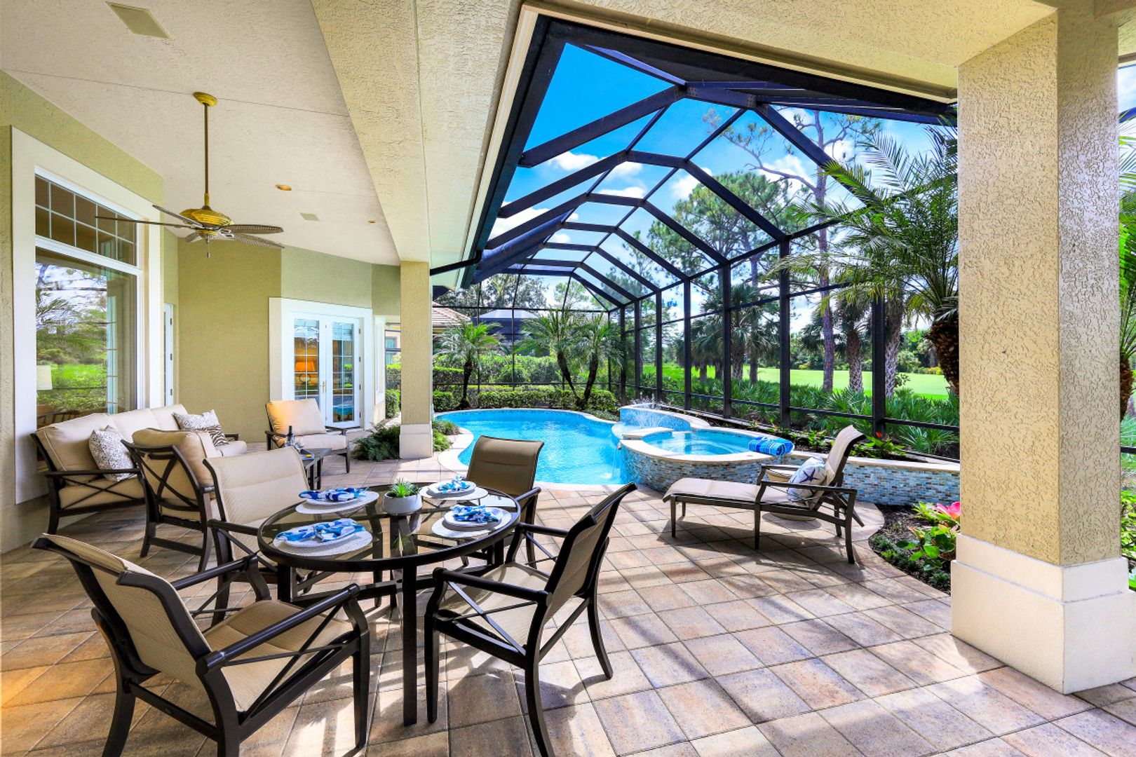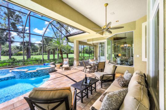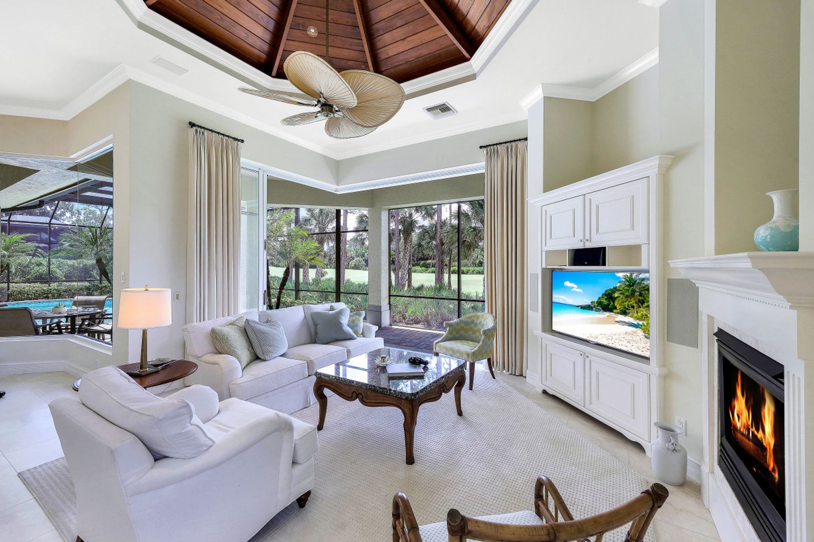 EXQUISITE LIVING EXPERIENCE. Panoramic fairway vistas framed by a natural preserve make this London Bay custom-built home as desirable as does its south orientation, for abundant sun on the gorgeously renovated pool and spa and expansive lanai. The single-story layout flows seamlessly, with natural light flooding open spaces topped by soaring ceilings. Zero-corner disappearing sliding glass doors enhance your indoor-outdoor living. Designer features range from precious marble floors to a tongue and groove wood ceiling in the family room, where a gas fireplace is a focal point. The stunningly renovated island kitchen becomes the heart of the home, complete with custom wood cabinetry, quartz counters, Wolf gas cooktop, double ovens, and an XL walk-in pantry. Ideal for entertaining, the wet bar is outfitted with two Sub-Zero wine coolers, beverage fridge, plus ice maker. All three bedroom suites have private baths and spacious custom-fitted closets, so family and friends feel right at home too. A rare find in a coveted country club community!