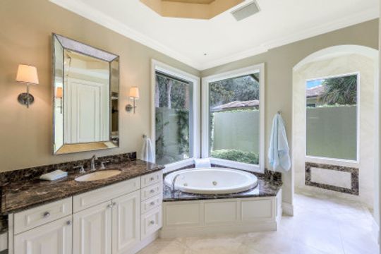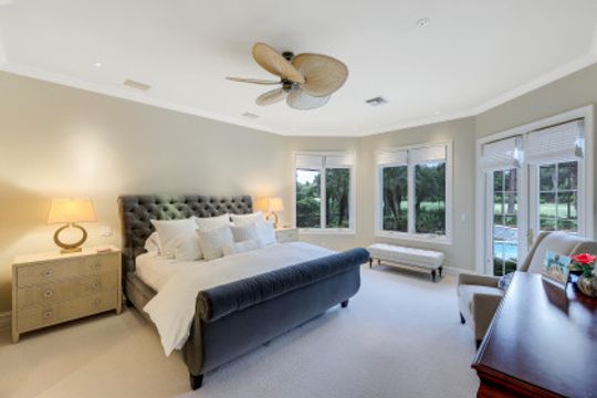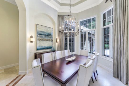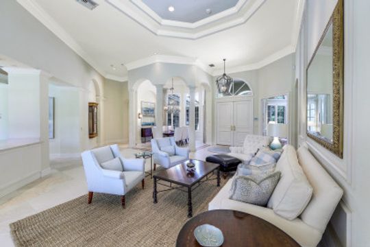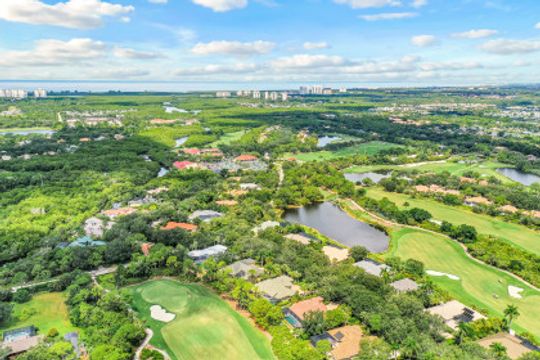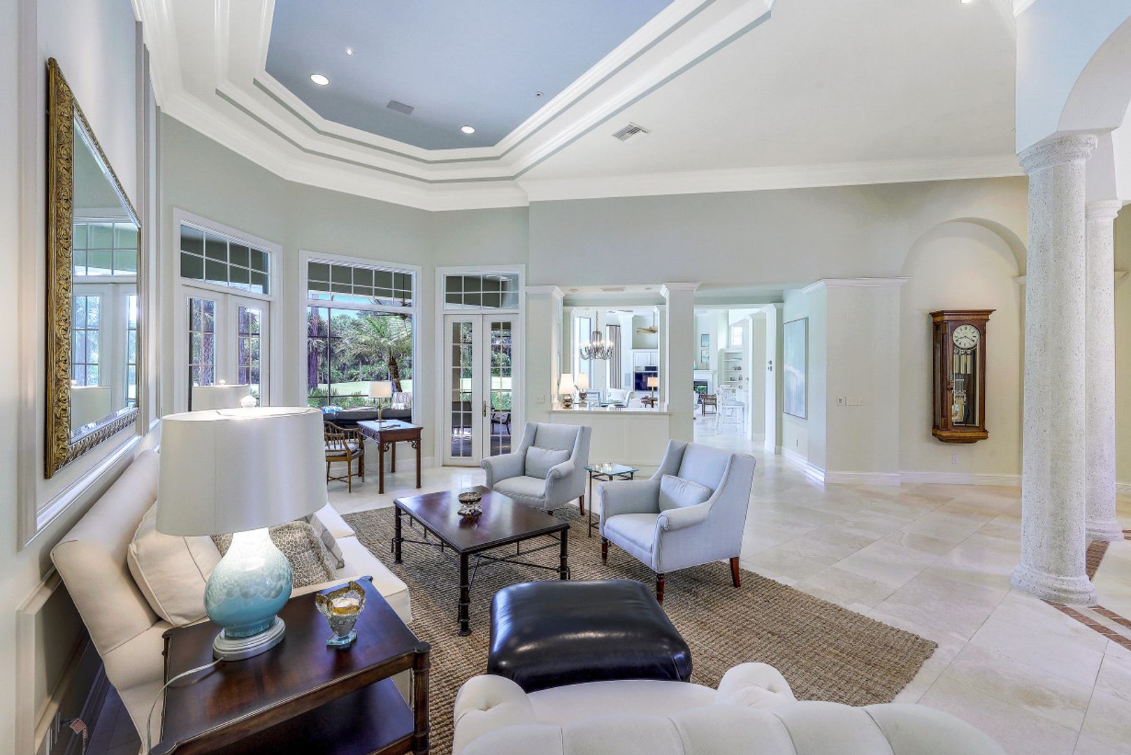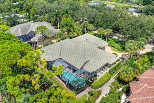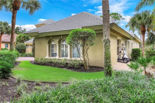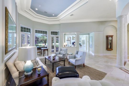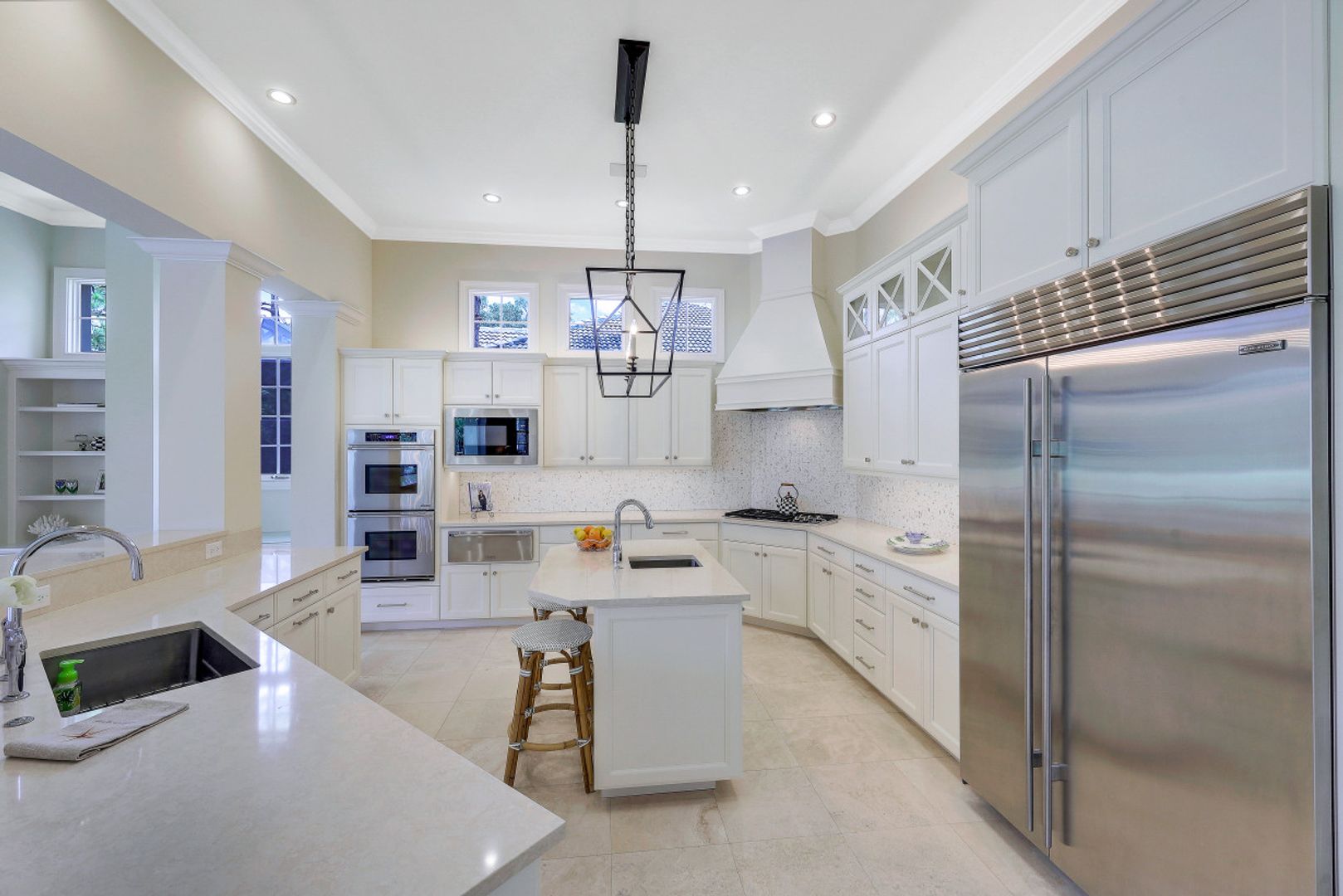 EXQUISITE LIVING EXPERIENCE. Panoramic fairway vistas framed by a natural preserve make this London Bay custom-built home as desirable as does its south orientation, for abundant sun on the gorgeously renovated pool and spa and expansive lanai. The single-story layout flows seamlessly, with natural light flooding open spaces topped by soaring ceilings. Zero-corner disappearing sliding glass doors enhance your indoor-outdoor living. Designer features range from precious marble floors to a tongue and groove wood ceiling in the family room, where a gas fireplace is a focal point. The stunningly renovated island kitchen becomes the heart of the home, complete with custom wood cabinetry, quartz counters, Wolf gas cooktop, double ovens, and an XL walk-in pantry. Ideal for entertaining, the wet bar is outfitted with two Sub-Zero wine coolers, beverage fridge, plus ice maker. All three bedroom suites have private baths and spacious custom-fitted closets, so family and friends feel right at home too. A rare find in a coveted country club community!