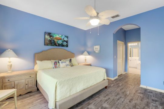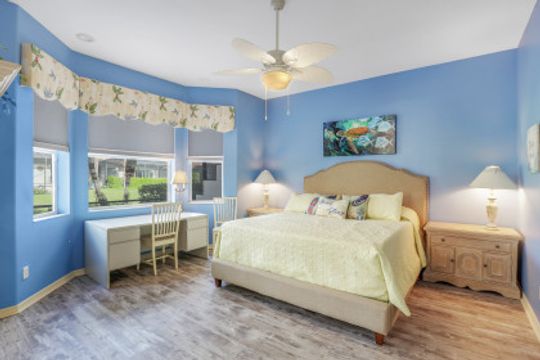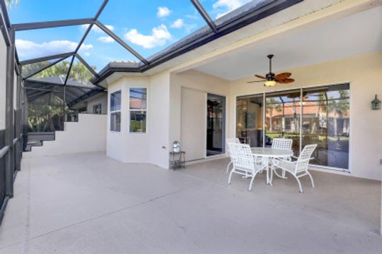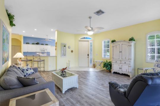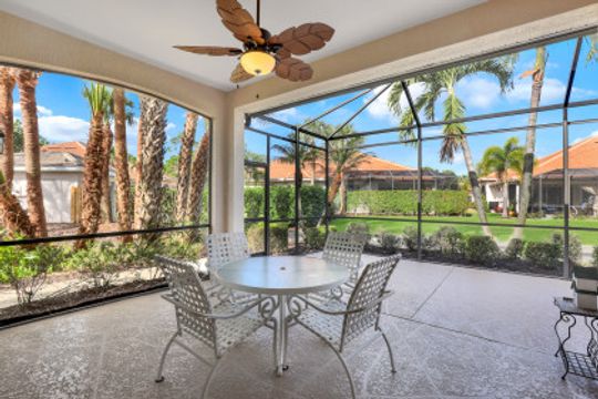 Adorable Villa Home! This 2 bed, 2 bath villa has a bright open great room floorplan! Very nicely furnished ready for move in! Large kitchen opens into the great room and out to the extended lanai, excellent for entertaining! Nice size master suite with beautiful bay windows! 2 car attached garage great for golf cart and extra storage! Beautiful landscaping is maintained by the association. Hunters Ridge is very friendly, casual, and offers a large variety of social activities. Hunters Ridge is financially stable and no CDD's!! Enjoy all a private golf country club has to offer including large community swimming pool with poolside cafe, club patio bar, fitness center, clubhouse, dining room and grill room, tennis courts, pickleball courts, bocce ball, golf simulators and much more!