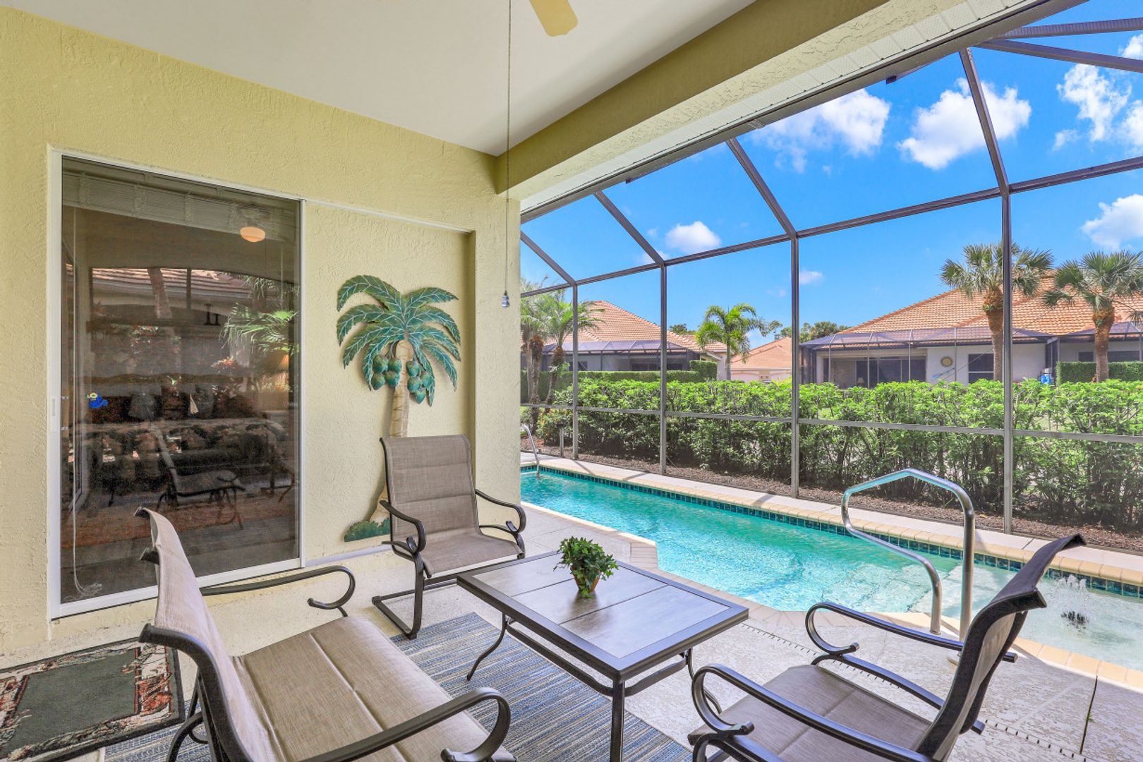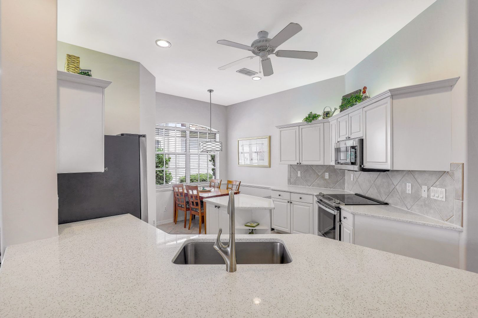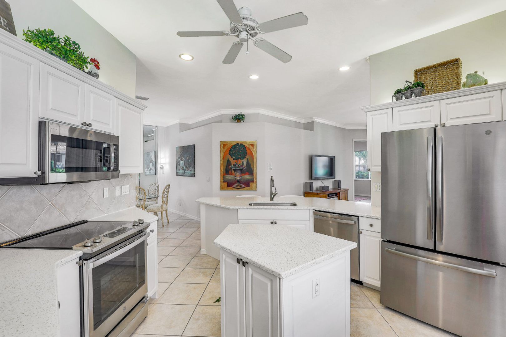 GORGEOUS VILLA POOL HOME! Updated and nicely furnished! The bright open floorplan has the spacious feel of a single family home! Beautiful crown molding and large tile in living area that opens to the lanai and heated pool, perfect for relaxing and entertaining! Large eat in kitchen with white cabinets and beautiful new granite counters and new stainless appliances! New faux wood flooring in bedrooms and den! Split bedroom floor plan offers complete privacy! Master bedroom and bathroom are both large and offer a walk-in designed closet, dual sinks, a separate tub and shower, and a water closet. The oversized den has a built-in murphy bed making it perfect for an office and guests! New Roof 2017! The 2-car garage has a Mini split a/c that is excellent for climate-controlled storage! Hunters Ridge is very friendly, casual, and offers a large variety of social activities. Hunters Ridge is financially stable with low fees and no CDD's!! Enjoy all a private golf country club has to offer including large community swimming pool with poolside cafe, club patio bar, fitness center, clubhouse, dining room and grill room, poolside cafe, tennis courts, pickleball courts, bocce ball and much more!