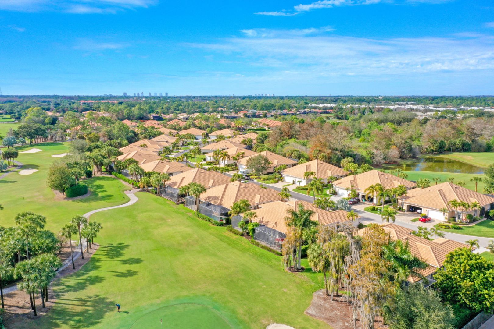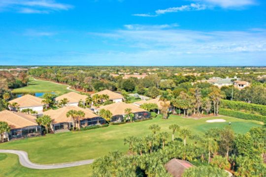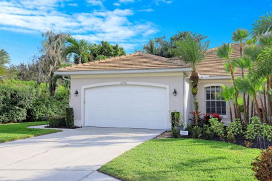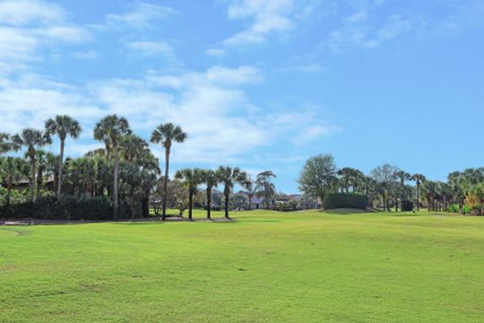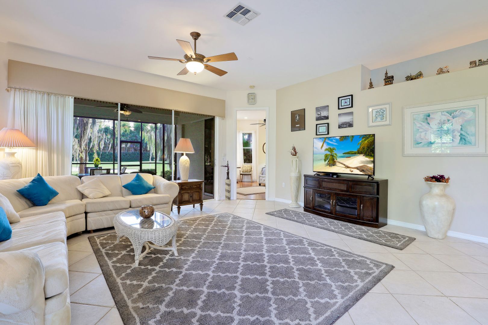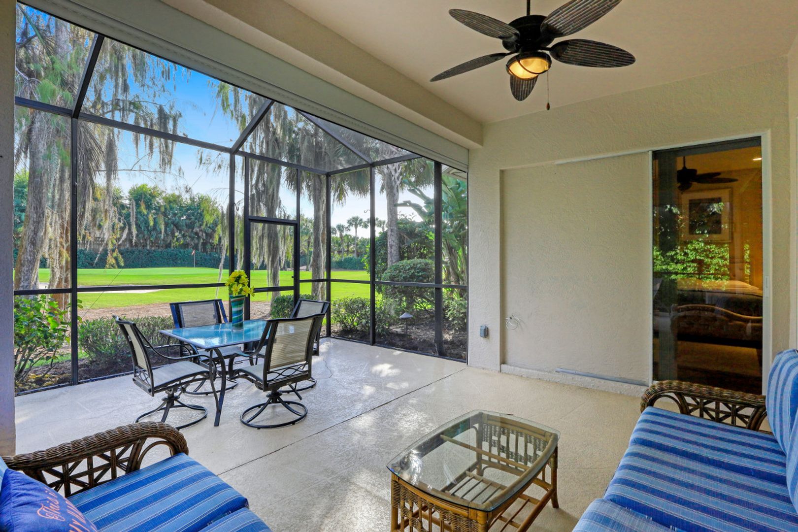 Must See Villa Home! Very Spacious, Bright Open Floorplan and Gorgeous Golf Course and Lush Landscaped View! New Roof 2017! This villa is an end residence which gives it a very private side yard and great views of the 16th hole and fairway! Great room floorplan that opens to the extended lanai, great for entertaining or relaxing and enjoying the tranquility and views. The lanai is equipped with electric hurricane shutters for storm protection and added security. The master suite offers a bay window and large master bath with a beautiful glass enclosed double shower. Both bedrooms and den feature Brazilian cherry floors with the main areas having large tile on the diagonal. The guest bedroom and den have "Murphy" beds allowing extreme flexibility in utilizing the spaces for multi-purpose needs such as office, den, media room etc. This premium lot is beautifully landscaped and beautifully maintained by the association. Hunters Ridge is very friendly, casual, and offers a large variety of social activities. Hunters Ridge is financially stable and no CDD's!! Enjoy all a private golf country club has to offer including large community swimming pool with poolside cafe, club patio bar, fitness center, clubhouse, dining room and grill room, tennis courts, pickleball courts, bocce ball, golf simulators and much more!