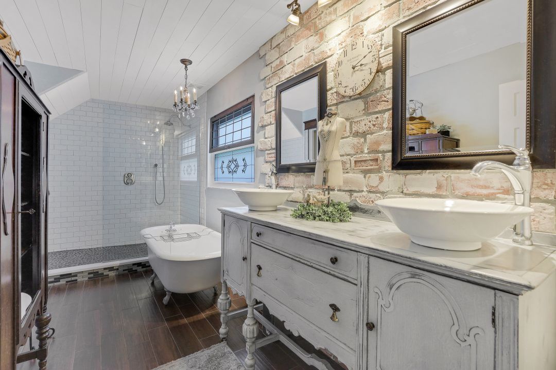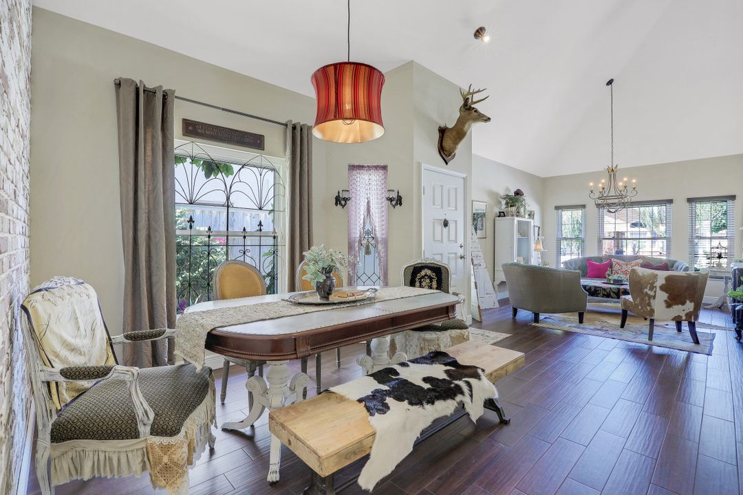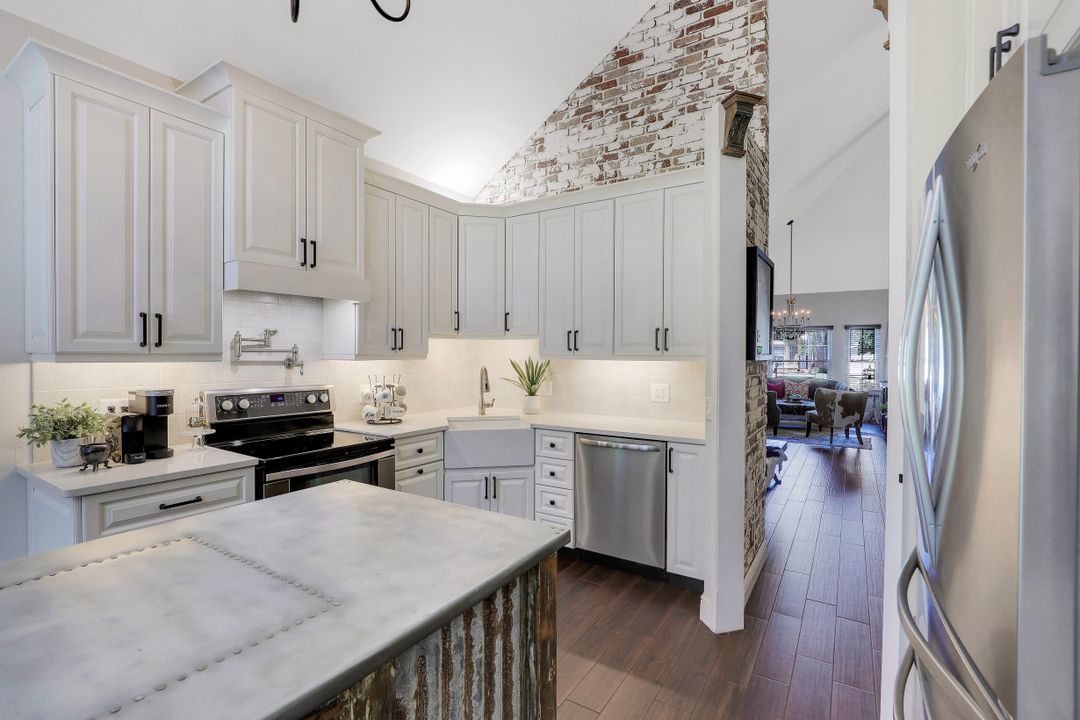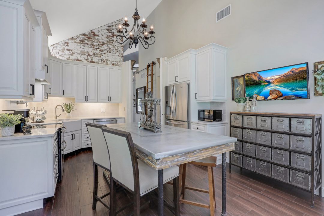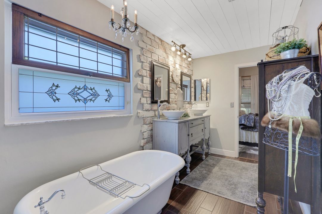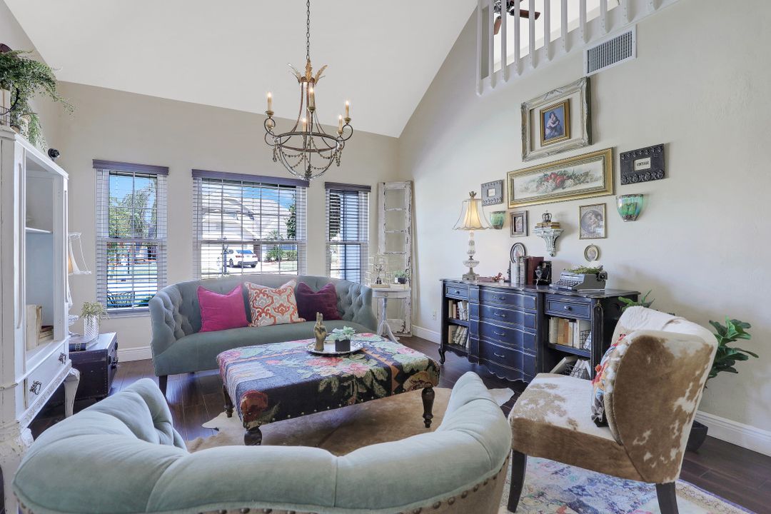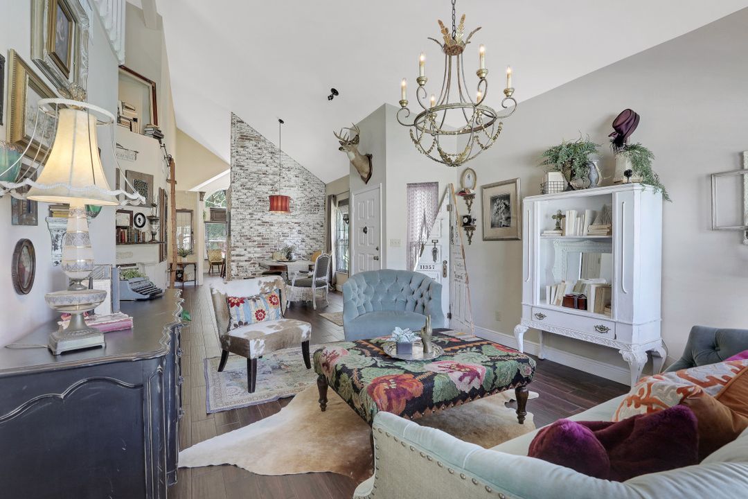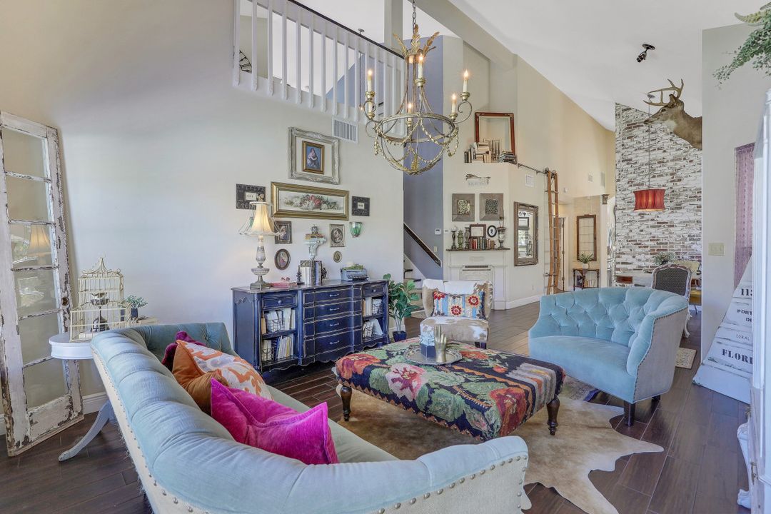 Elegantly updated with vintage detail throughout. This move in ready 2 bedroom 2.5 bathroom home is centrally located in Williamsburg at The Colony close to everything in Ft Myers, restaurants, shopping, Whole Foods, RSW, and Spring Training. Enter into a 2 story living room w/ porcelain plank floors, cathedral ceilings, formal dining, stunning décor, & custom brick accent wall. Recently updated kitchen white hardwood cabinets, Quartz counters, Kingston brass pot filler, and large custom vintage island & seating area. Beautiful First Floor owners suite w/ lots of natural light, walk-in closet, & recently remodeled bath w/ vintage cabinet vessel sinks, clawfoot tub, shiplap, and large walk-in shower. The loft is ideal for relaxing by the TV or work/study on the computer. Loft can be enclosed for 3rd bed. Upstairs features a large spare bedroom w/ full bathroom and easy attic access for storage. Laundry room with newer Whirlpool W/D and reclaimed wood ceiling. Relax in the enclosed FL room with 260 SF living space & windows throughout overlooking the peaceful Oak Trees, Staghorn, and grounds. Impact Glass, beautiful landscaping & night-lighting - Features list attached