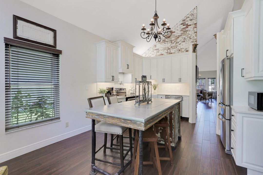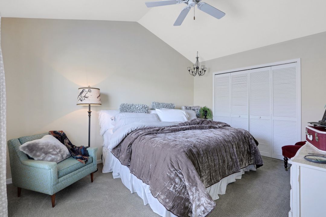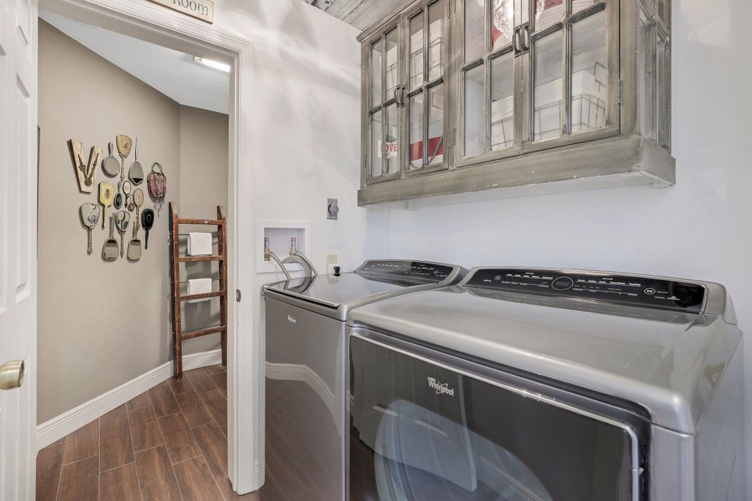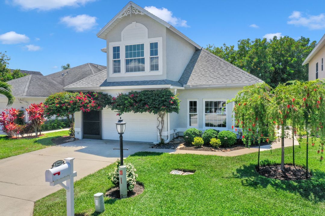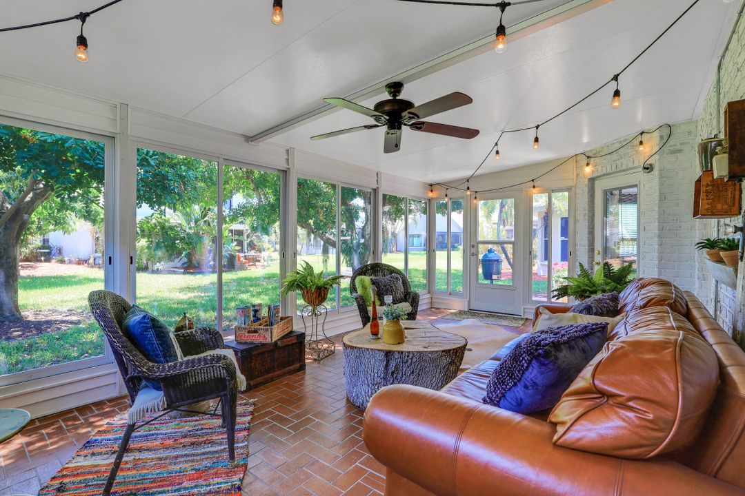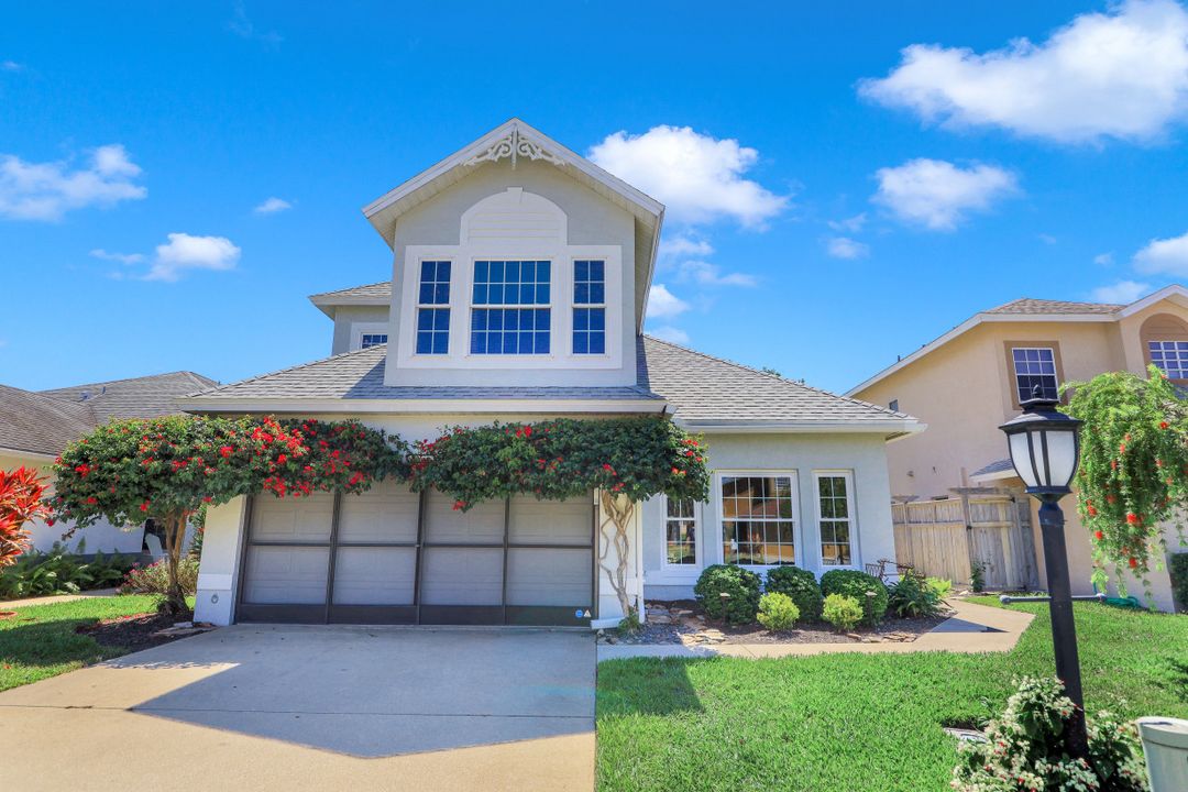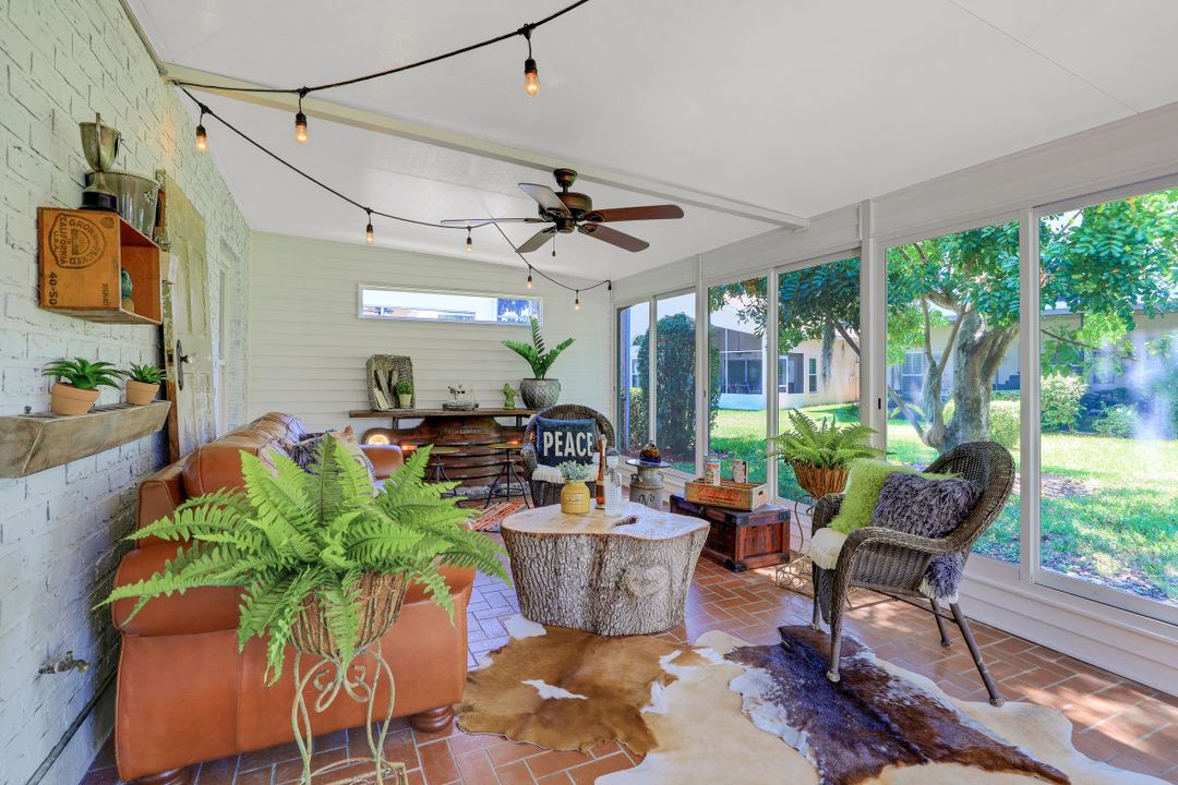 Elegantly updated with vintage detail throughout. This move in ready 2 bedroom 2.5 bathroom home is centrally located in Williamsburg at The Colony close to everything in Ft Myers, restaurants, shopping, Whole Foods, RSW, and Spring Training. Enter into a 2 story living room w/ porcelain plank floors, cathedral ceilings, formal dining, stunning décor, & custom brick accent wall. Recently updated kitchen white hardwood cabinets, Quartz counters, Kingston brass pot filler, and large custom vintage island & seating area. Beautiful First Floor owners suite w/ lots of natural light, walk-in closet, & recently remodeled bath w/ vintage cabinet vessel sinks, clawfoot tub, shiplap, and large walk-in shower. The loft is ideal for relaxing by the TV or work/study on the computer. Loft can be enclosed for 3rd bed. Upstairs features a large spare bedroom w/ full bathroom and easy attic access for storage. Laundry room with newer Whirlpool W/D and reclaimed wood ceiling. Relax in the enclosed FL room with 260 SF living space & windows throughout overlooking the peaceful Oak Trees, Staghorn, and grounds. Impact Glass, beautiful landscaping & night-lighting - Features list attached