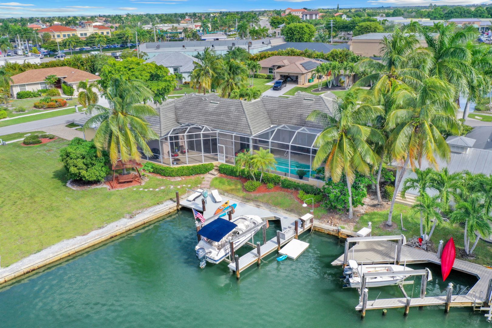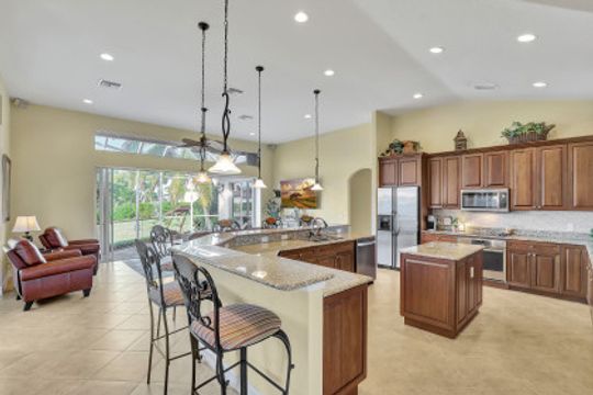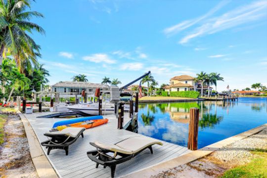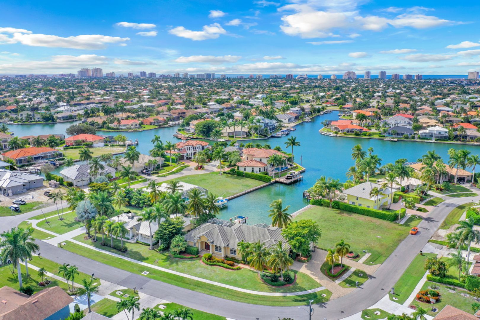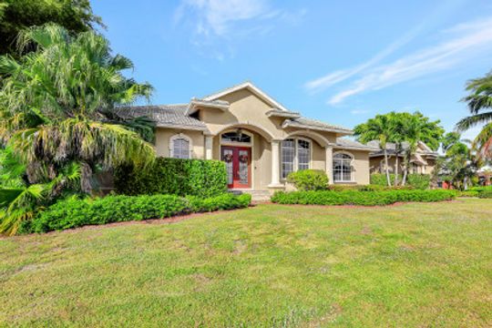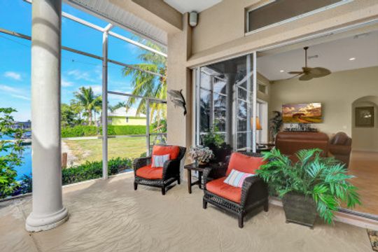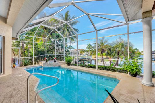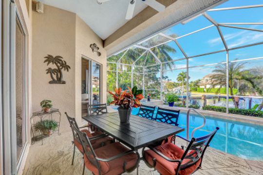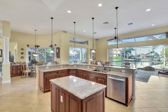 Custom-built, spacious four-bedroom home with a four-car garage located on a large, over-sized corner lot. Western exposure with mesmerizing converging wide-water views looking up the waterway. Great location and just a short cruise out through gorgeous Roberts Bay. Split bedroom floor plan with separate living, dining and family room. Custom kitchen comes with granite counter-tops, island, breakfast nook and counter-top seating. Master bedroom and bath include a walk-in closet, dual sinks, separate shower and tub. A large screened-in lanai with pool and spa is the perfect place for outdoor family gatherings or relaxing and enjoying Marco Island's spectacular sunsets. For the boater enthusiast, there is a dock and lift. Circular drive provides extra parking. Short distance to the Shops of Marco and just a few miles to Mackle Park, YMCA, library and beach.