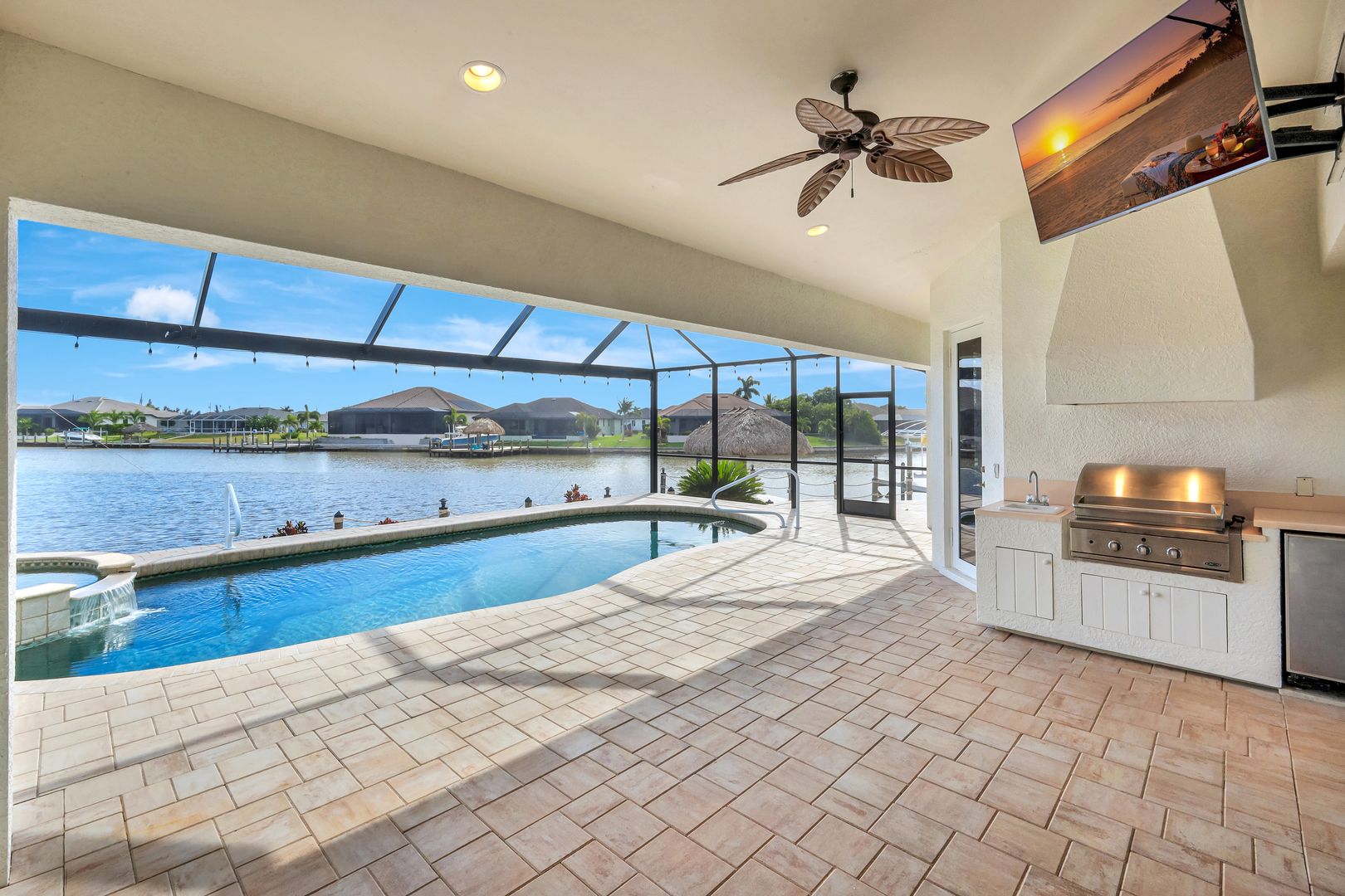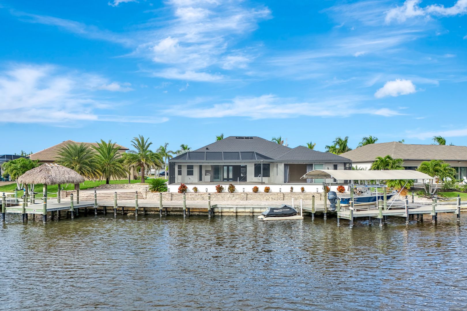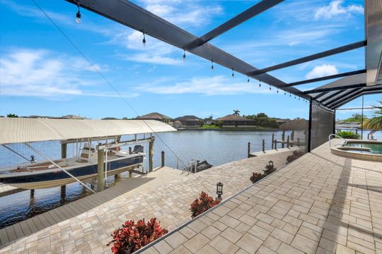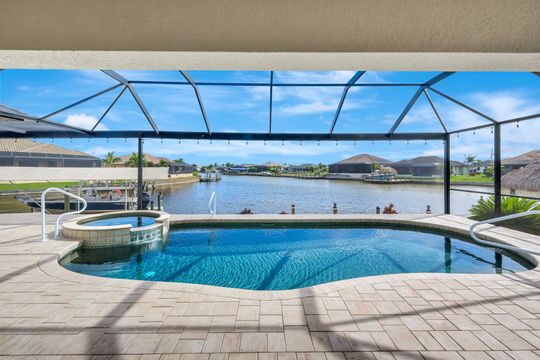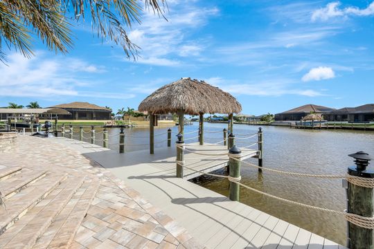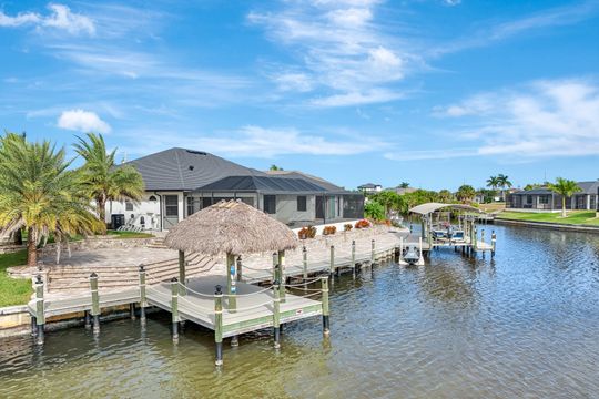 repare to be captivated by this stunning, 4-bedroom with 3-bathroom, 2900+ sq ft luxury residence; a testament to craftsmanship by local custom builder Aubuchon Homes. Situated on a highly desirable, *OVERSIZED SOUTH-EASTERN REAR EXPOSURE GULF-ACCESS LOT* with *146 FT OF WATER FRONTAGE*, this property offers the quintessential Southwest Florida lifestyle and a *BREATHTAKING VIEW THAT COMMANDS YOUR ATTENTION!*. Features include a great-room style floorplan with vaulted and volume ceilings, 90° sliding glass door, wood cabinetry in kitchen with stainless steel appliances and granite countertops, gas stove with hood, bar, large primary bedroom with sitting area, ample closet space, and tile flooring in the main living areas with plenty of natural light flowing through the home. Exterior features include metal roof (2022), paver walkways and gutters around entire perimeter, 30 AMP generator transfer switch, whole-house reverse osmosis system, and mature palm trees. Peace of mind comes standard with a remarkable 10-foot elevation! Step outside to an *ENTERTAINER'S PARADISE* featuring an *INCREDIBLE OUTDOOR LIVING SPACE* with a heated saltwater pool and spa, all enclosed by a pool cage (2022) boasting picture-frame screens to maximize your panoramic waterfront views. For the avid boater, the amenities are second to none, including a boat dock and lift (13k lbs installed in 2020) with a canopy and composite decking, and your own private tiki hut (2022)! The *EXPANSIVE HARDSCAPE AREA WRAPS THE ENTIRE REAR OF THE PROPERTY*, providing the *PERFECT* space for gatherings. This property is more than a home; it’s a statement of luxury, convenience, and unparalleled waterfront living!