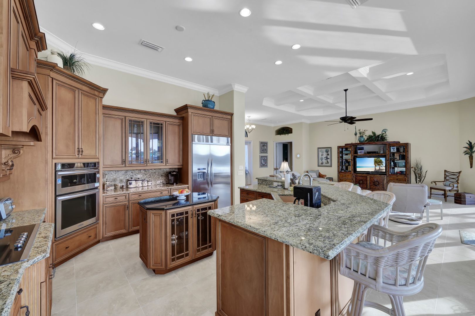 Wake up to breathtaking wide bay views. This waterfront Marco Island tip lot location affords privacy and features a 224 ft triple reinforced wrap-around seawall (2012) with 115 ft wood lined covered and screened lanai with additional grassy yard. Welcome to this water direct coastal contemporary home of 4 Bed | 4.5 Ba | 3617SF, located on a cul-de-sac of nearly 1/2 an acre (.49). Enjoy the shallow beach pool with waterfall spa, outdoor shower and summer kitchen with built-in grill and walls of telescopic sliders maximizing the views. Overlook the water from the great room open plan living, dining, kitchen and all 4 ensuite bedrooms. The kitchen includes a breakfast bar with seating for 6, pantry closet, built-in desk and dining area. Enter through French doors to the private primary ensuite with 2 walk-in closets and bath with separate vanities, soaking tub, and walkthrough in shower. A 2nd ground floor guest ensuite overlooking the water, is followed by 2 upper ensuite bedrooms joined by a common living room with wet bar & built-in entertainment center, all accessing a waterfront terrace. Architectural features include a roomy, airy feel to the home with high, volume, tray and box beam ceiling, recessed lighting, impact windows and doors, and 3 zoned A/C, with graceful arches through the interior and exterior. A large garage for 3 cars can fit a 4th, with loading space and parking in the drive. Tropical landscaping includes majestic Royal Palms. This is the ultimate light and bright entertainers' home; perfect for indoor/outdoor waterfront living and enjoying the Florida lifestyle. Contact Pat Wilkins, Broker Associate | 239-290-8593 | patwilkins@marcoexpert.com | https://marcoexpert.com
