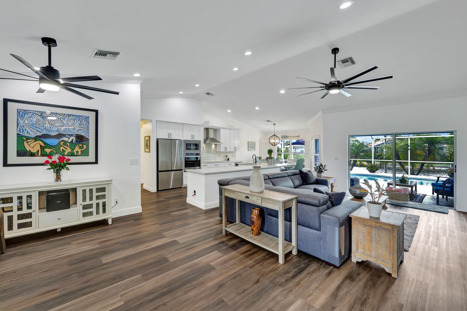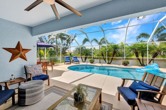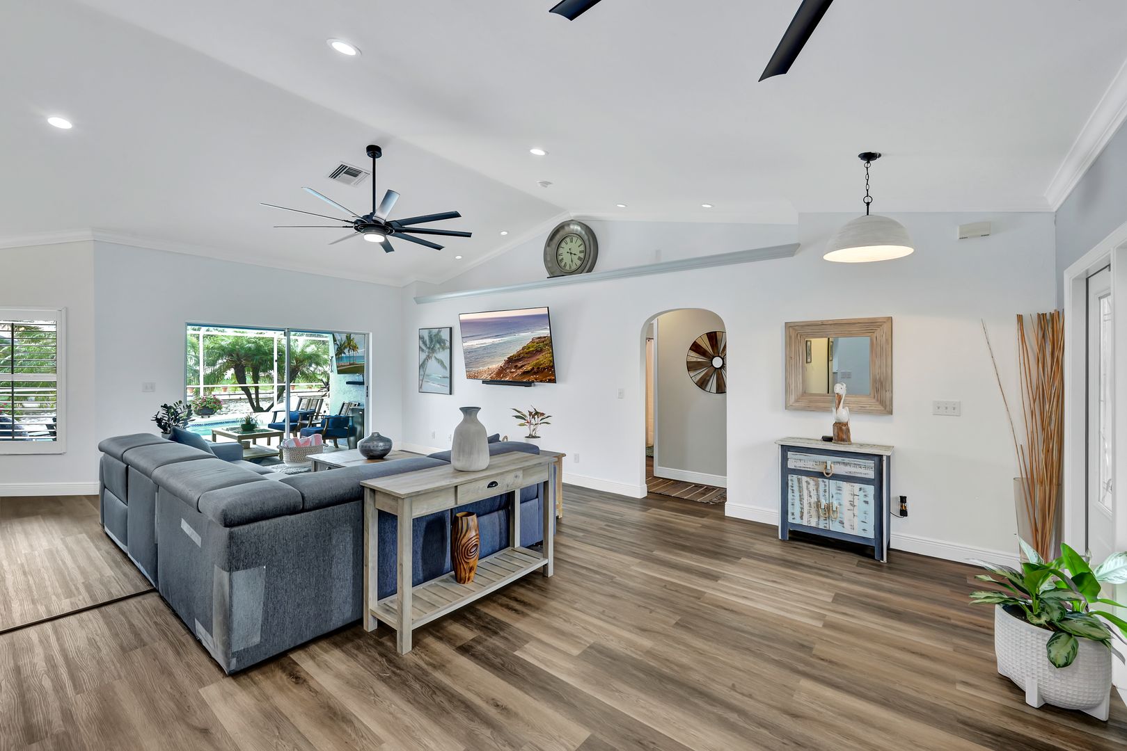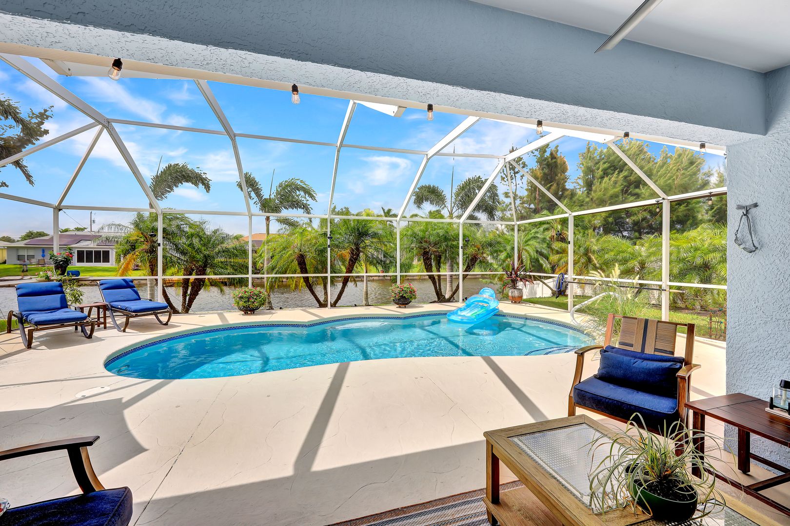 Welcome to Paradise and Your Gorgeous Waterfront Pool Home. Situated on a Freshwater Canal, this Updated Home has an Open Floor Plan and is Sure to Please the Most Discriminating Buyer. You will Love the NEW 2022 Kitchen with Stunning Quartz Counter Tops and Backsplash, Wood Cabinets with Pull-outs, Huge Island, Stainless Steel Appliances, 36-inch Induction Cooktop and Hood, Wine Cooler, Refrigerator, Dishwasher, Wall Oven and Microwave. The Spacious Owners Suite has a Large Walk-in Closet and Updated Bathroom with New Vanity and Quartz Counter, Dual Sinks, New Mirrors and Wall Tile, and a Beautiful Walk-in Shower. Additional Upgrades & Features include New Roof 2022, New LVP Flooring, New Fans and Light Fixtures, New Interior Paint, Plantation Shutters, Cathedral ceiling, Recessed lighting, Updated Guest Bath with Granite and Dual Glass Vessel Sinks, Laundry room with Utility Tub and New Washer & Dryer, New Privacy Fence, New Sprinkler Control, Pool Resurfaced 2020, AC 2019, Water Heater 2016, New Pool Screens, Heated Pool, and Newly Painted Decorative Concrete on the Lanai and Pool Deck. Close to Restaurants, Shopping, Schools and just a Short Drive to RSW International Airport.