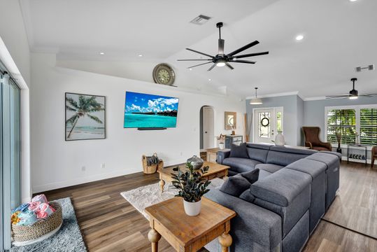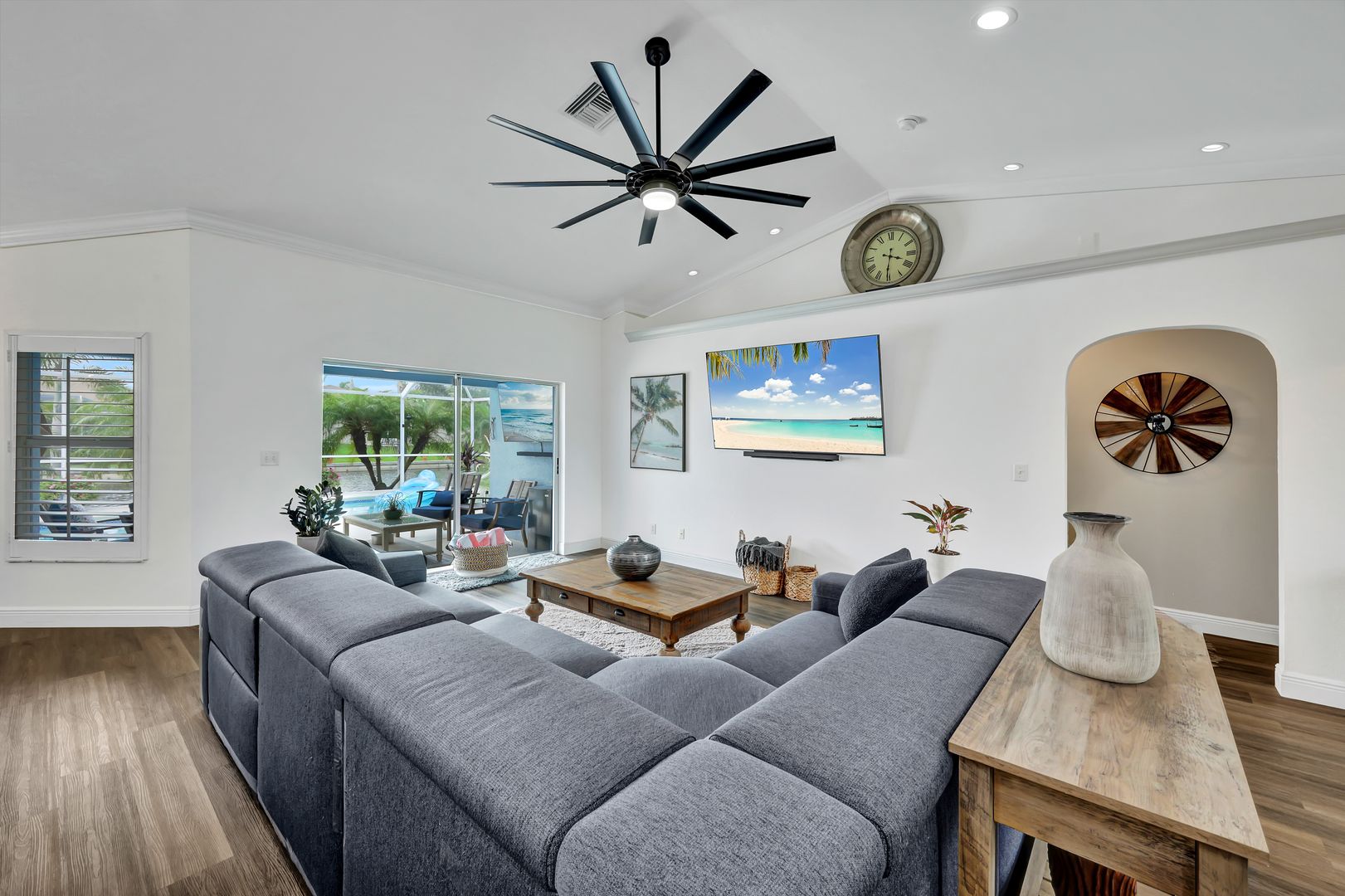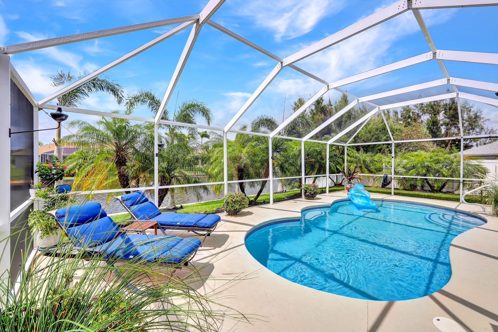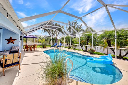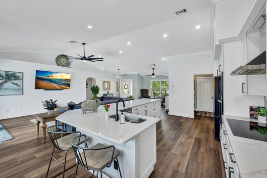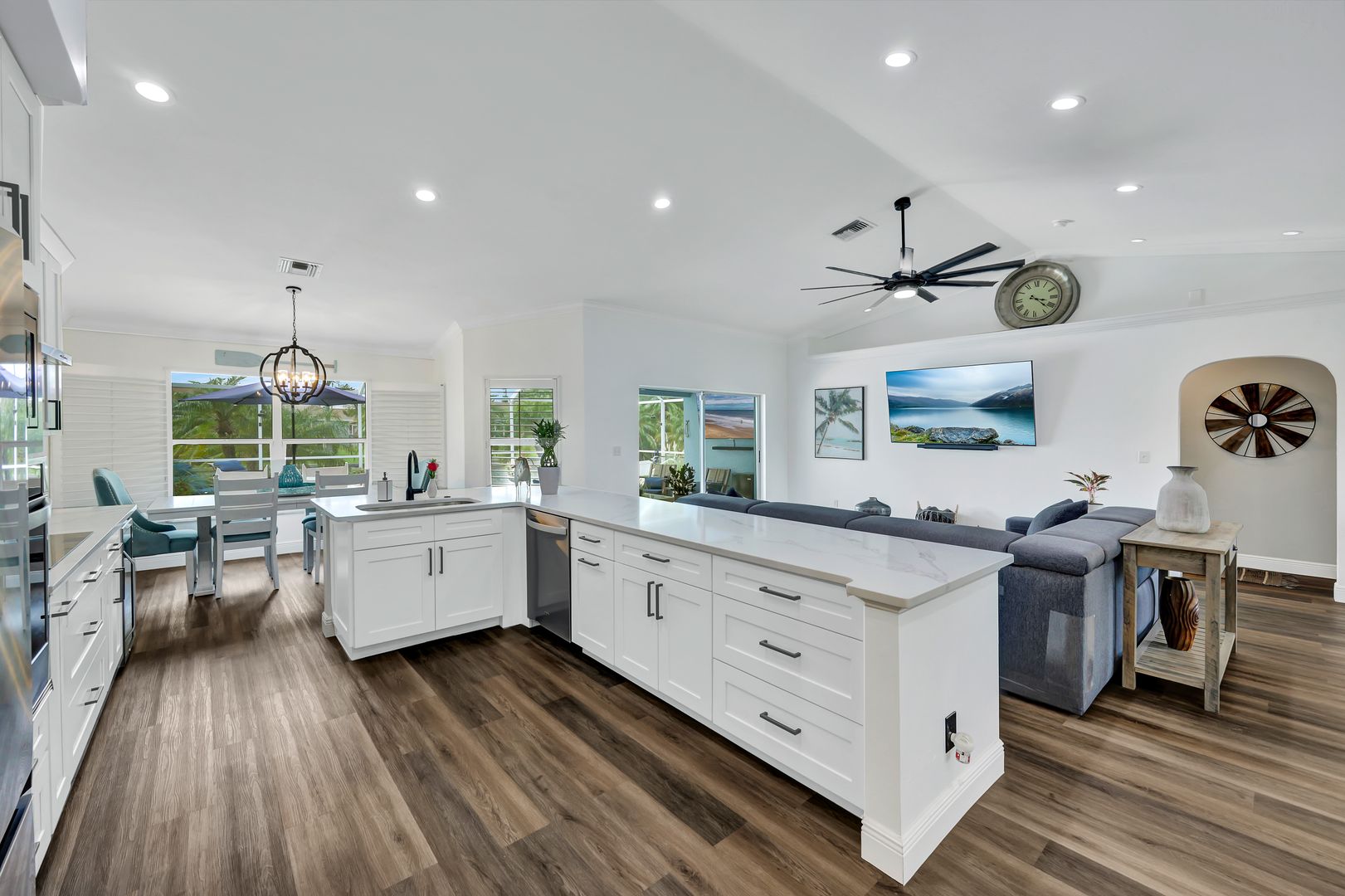 Welcome to Paradise and Your Gorgeous Waterfront Pool Home. Situated on a Freshwater Canal, this Updated Home has an Open Floor Plan and is Sure to Please the Most Discriminating Buyer. You will Love the NEW 2022 Kitchen with Stunning Quartz Counter Tops and Backsplash, Wood Cabinets with Pull-outs, Huge Island, Stainless Steel Appliances, 36-inch Induction Cooktop and Hood, Wine Cooler, Refrigerator, Dishwasher, Wall Oven and Microwave. The Spacious Owners Suite has a Large Walk-in Closet and Updated Bathroom with New Vanity and Quartz Counter, Dual Sinks, New Mirrors and Wall Tile, and a Beautiful Walk-in Shower. Additional Upgrades & Features include New Roof 2022, New LVP Flooring, New Fans and Light Fixtures, New Interior Paint, Plantation Shutters, Cathedral ceiling, Recessed lighting, Updated Guest Bath with Granite and Dual Glass Vessel Sinks, Laundry room with Utility Tub and New Washer & Dryer, New Privacy Fence, New Sprinkler Control, Pool Resurfaced 2020, AC 2019, Water Heater 2016, New Pool Screens, Heated Pool, and Newly Painted Decorative Concrete on the Lanai and Pool Deck. Close to Restaurants, Shopping, Schools and just a Short Drive to RSW International Airport.