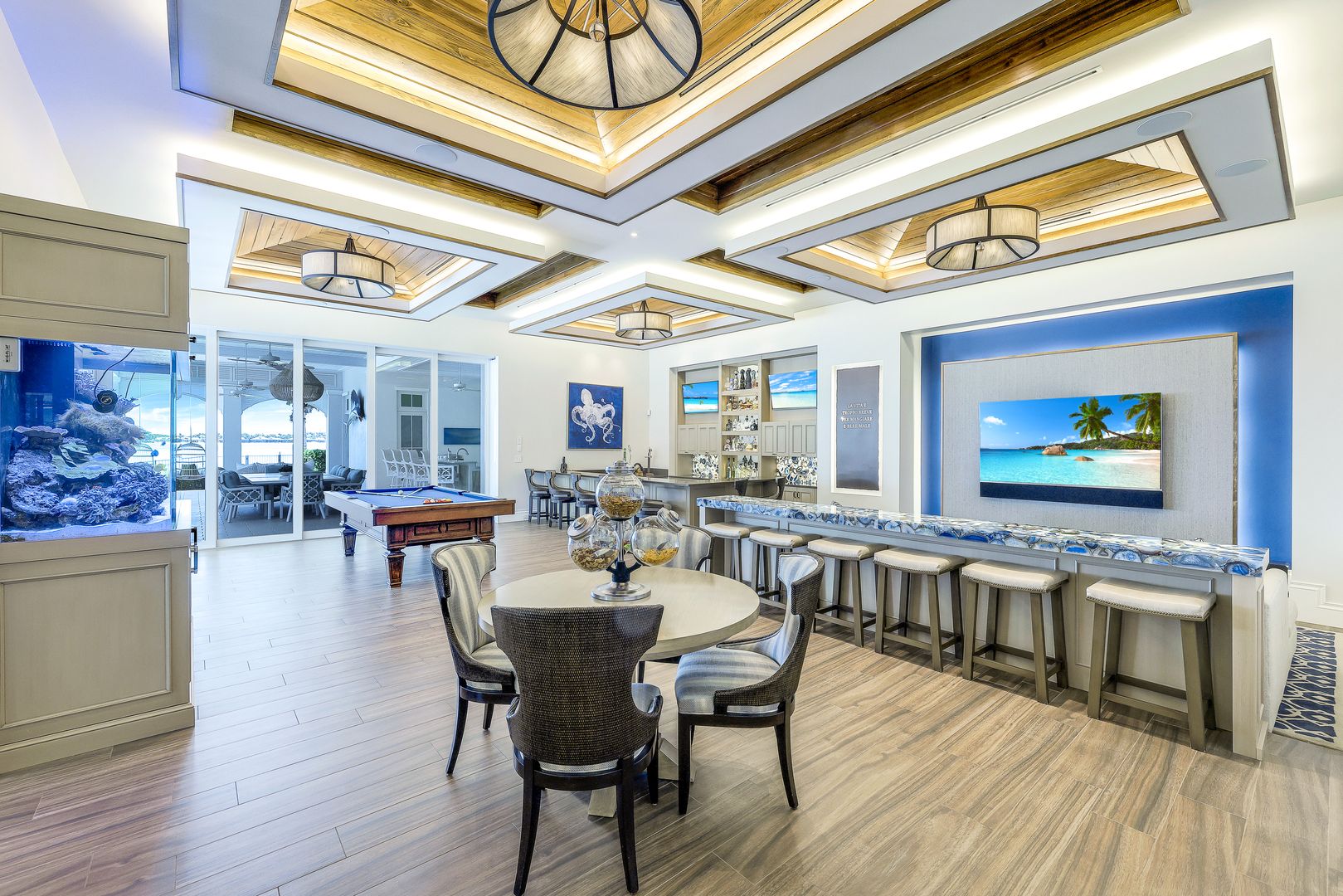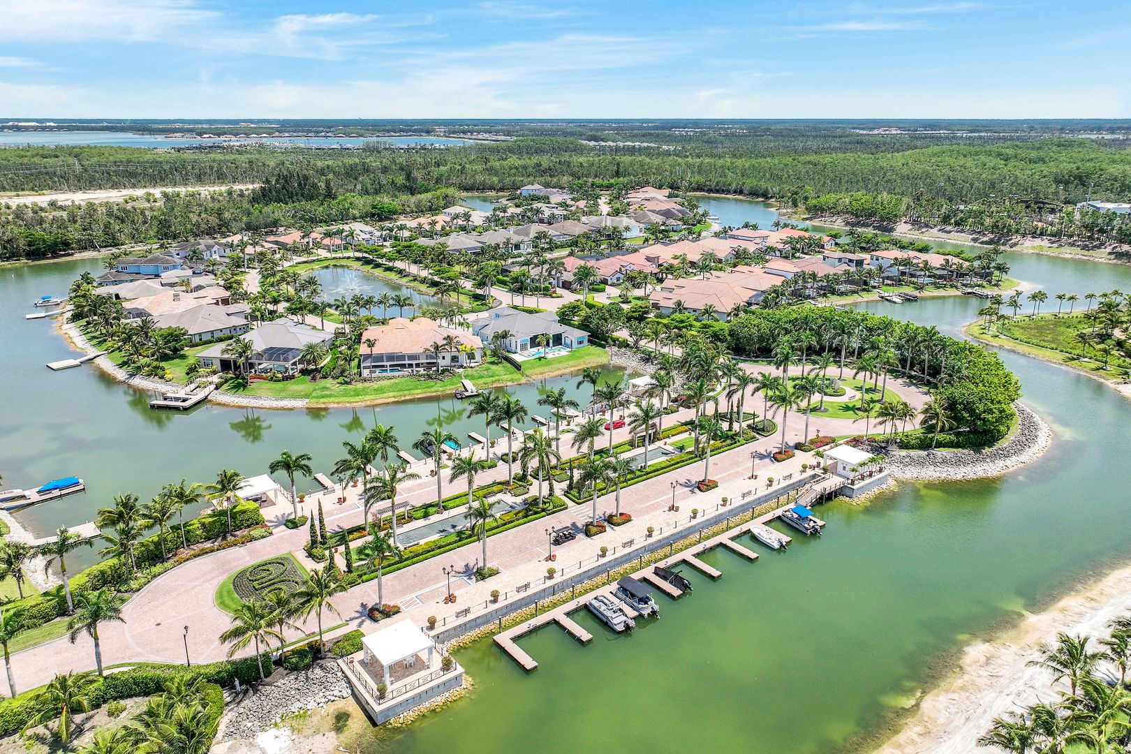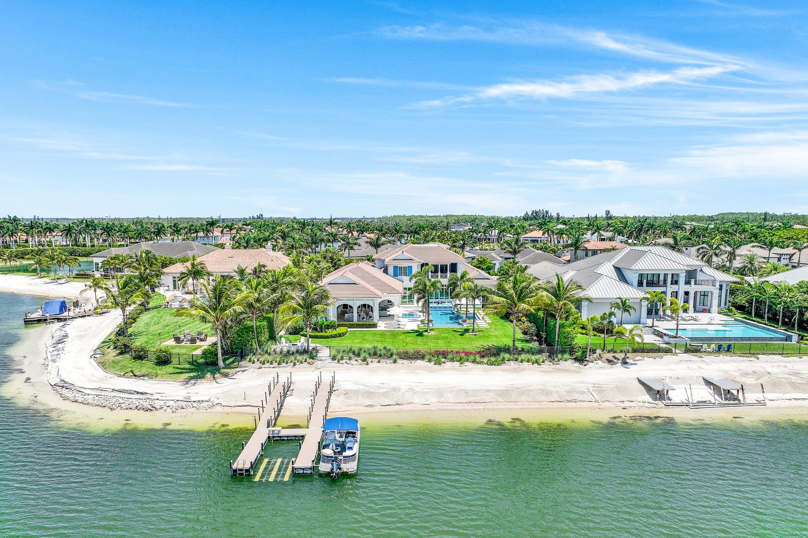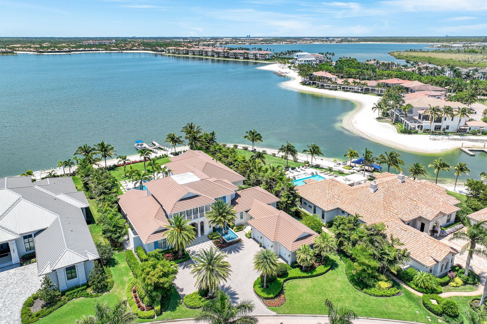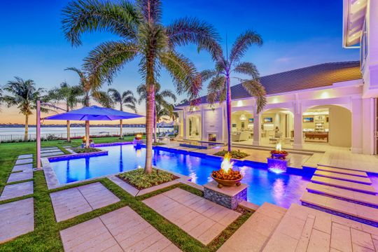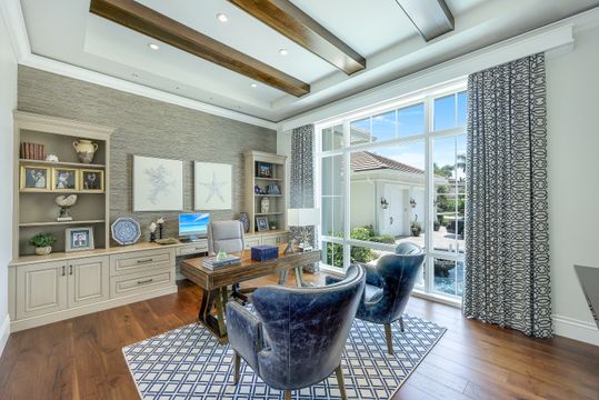 Located on a prime beachfront lot in Miromar Lakes, this exquisite estate home was designed for those who enjoy food, wine, entertaining, and spending time with family. Designed with sophistication and comfort in a blend of Key West and Coastal styles, the home features an open-concept floor plan with great room, gourmet kitchen, butler’s pantry, den/office and an additional second floor living area. The 800 bottle walk-in wine cellar leads to a remarkable 1,100 sq ft multi-function game room. Perfect for enjoying sports and movies, this ultimate entertaining space with multiple TVs, distributed video system, a stunning bar, a billiard table, a game table and home theater. The game room opens seamlessly onto an oversized lanai and large resort-style pool, and spa. The lanai features a complete outdoor kitchen including an Evo grill and imported Italian wood-burning pizza oven. The luxurious master suite is a private sanctuary featuring a spa-like bathroom, an outdoor shower with a marble waterfall, 2 spacious walk-in closets and an outdoor seating area. The home also boasts 3 additional oversized bedrooms each meticulously designed with their own en-suite bathrooms.