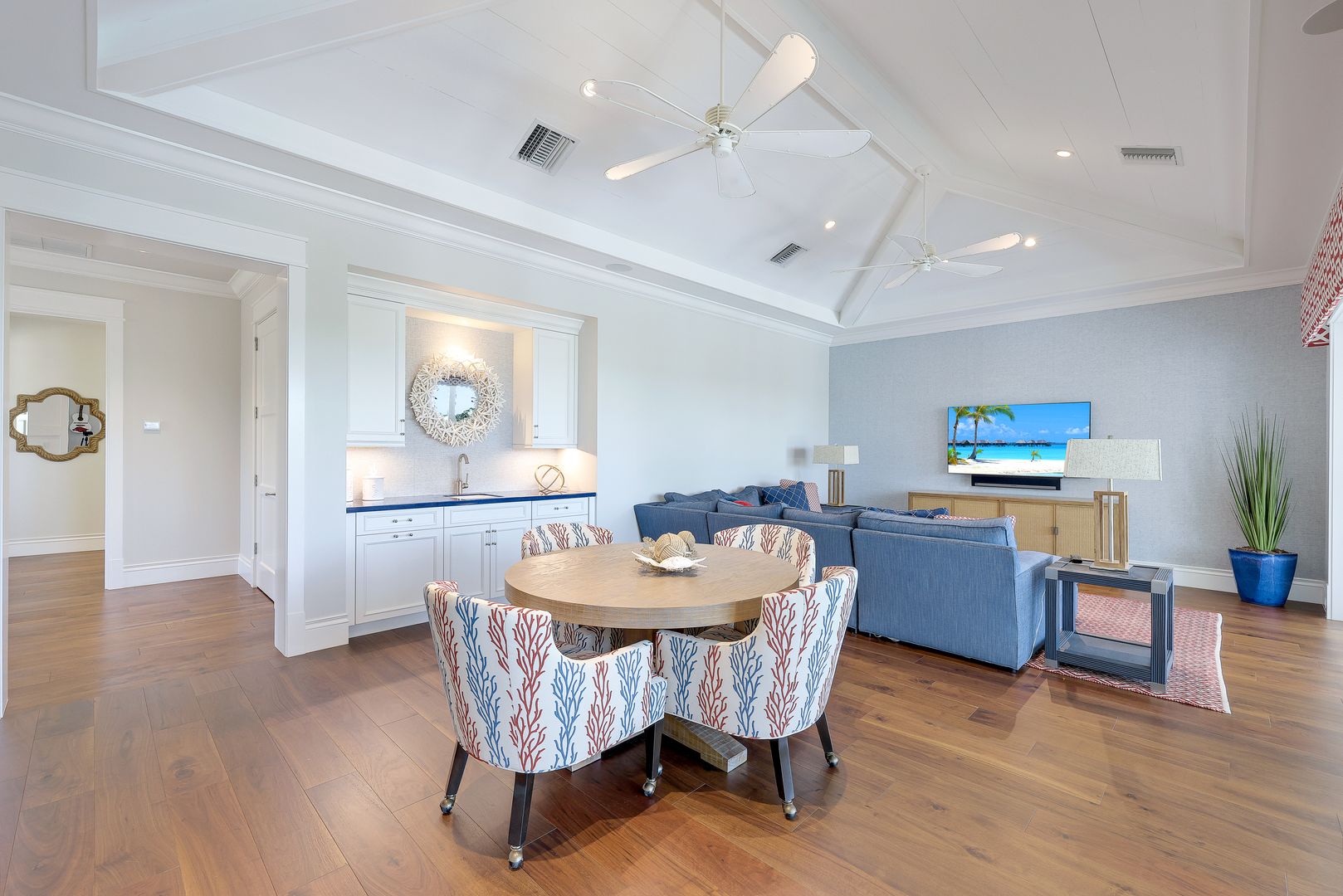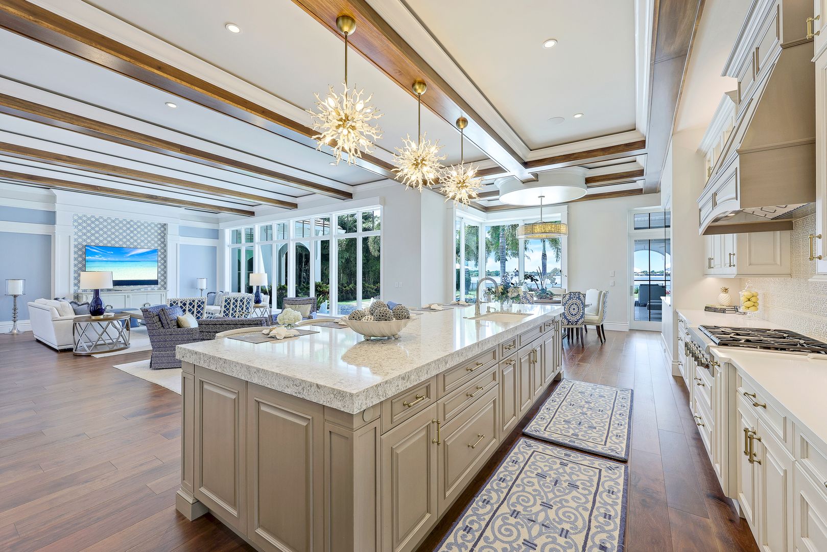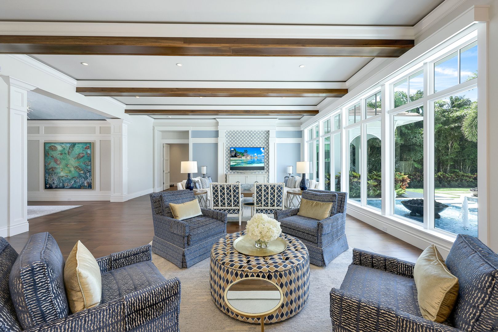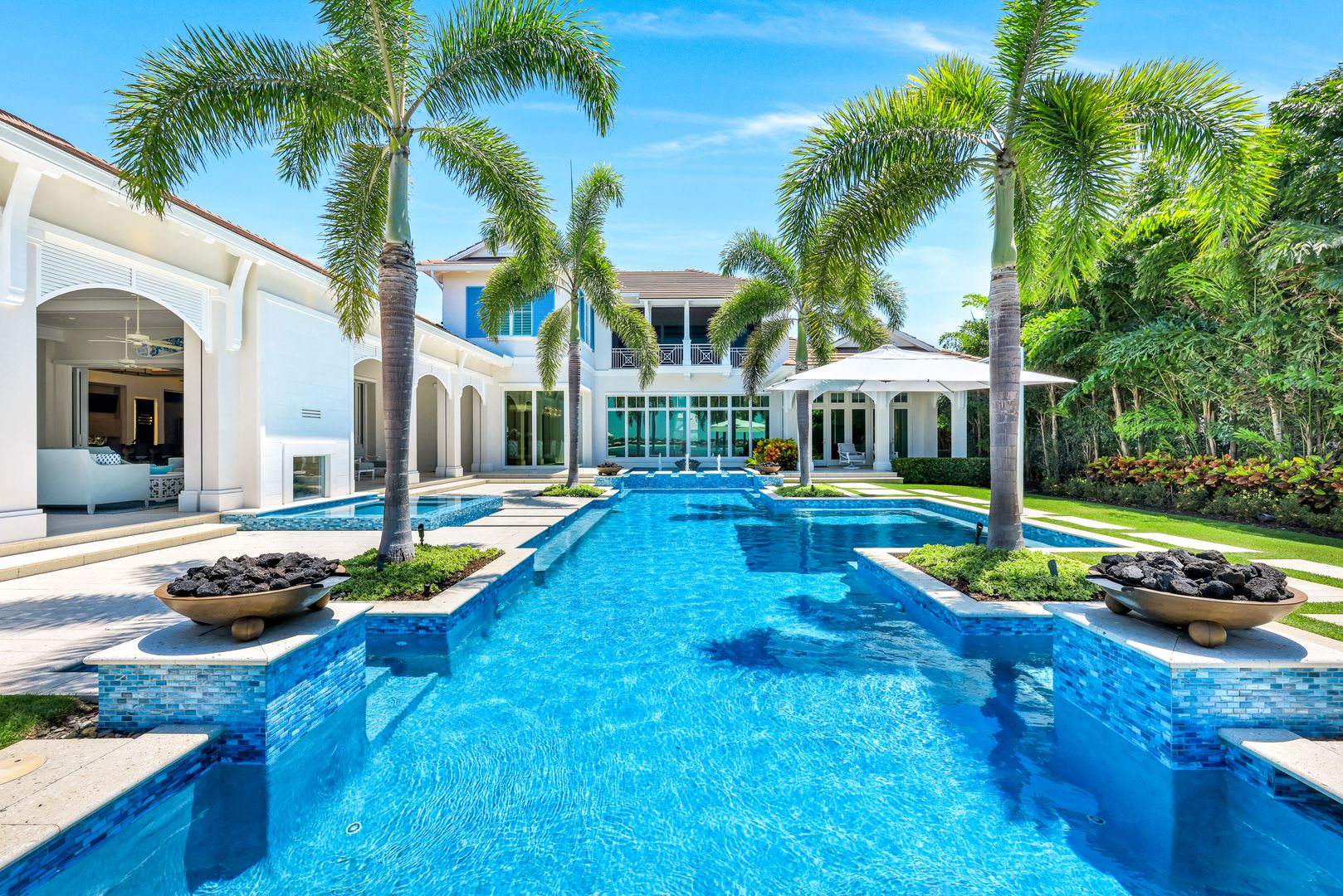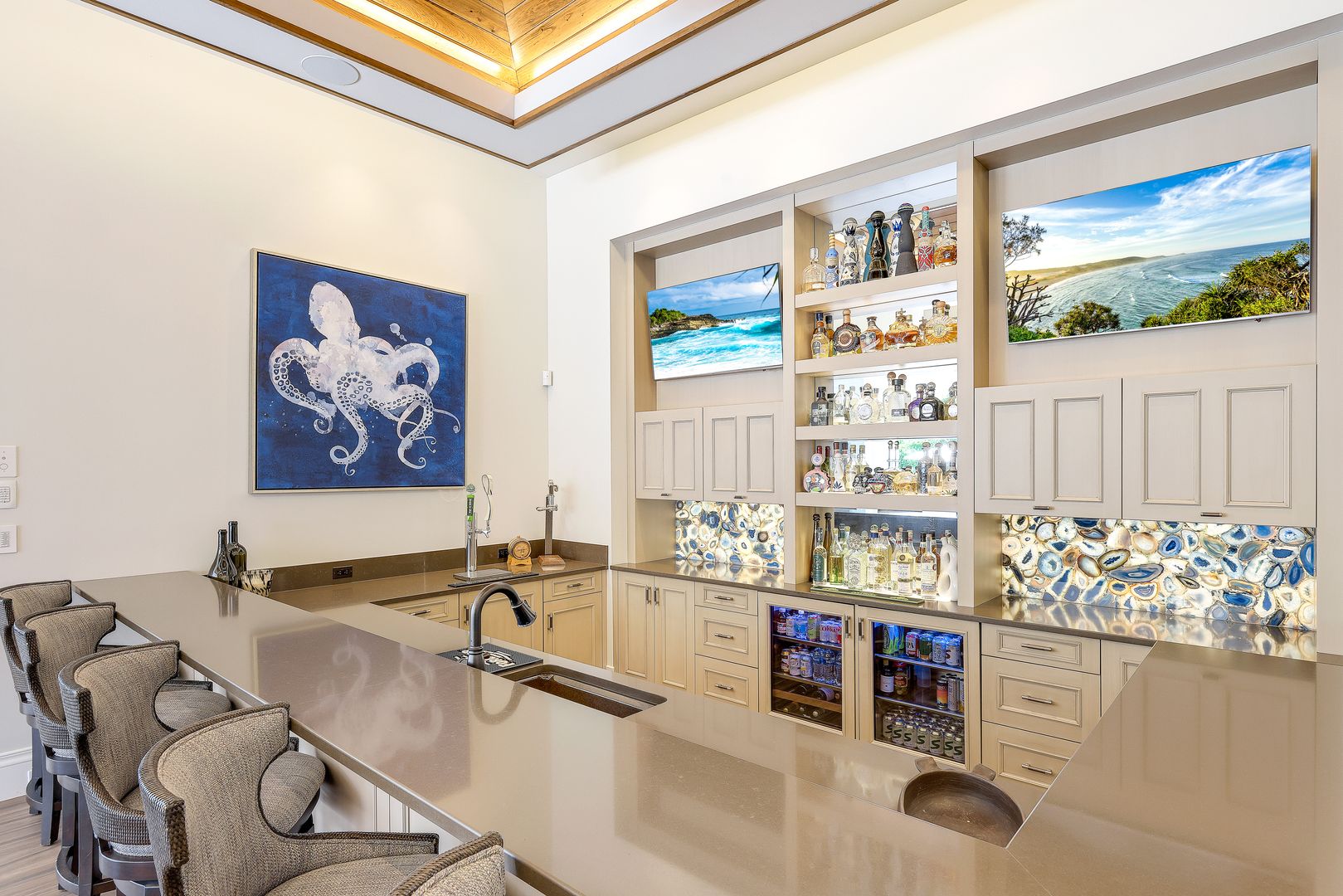 Located on a prime beachfront lot in Miromar Lakes, this exquisite estate home was designed for those who enjoy food, wine, entertaining, and spending time with family. Designed with sophistication and comfort in a blend of Key West and Coastal styles, the home features an open-concept floor plan with great room, gourmet kitchen, butler’s pantry, den/office and an additional second floor living area. The 800 bottle walk-in wine cellar leads to a remarkable 1,100 sq ft multi-function game room. Perfect for enjoying sports and movies, this ultimate entertaining space with multiple TVs, distributed video system, a stunning bar, a billiard table, a game table and home theater. The game room opens seamlessly onto an oversized lanai and large resort-style pool, and spa. The lanai features a complete outdoor kitchen including an Evo grill and imported Italian wood-burning pizza oven. The luxurious master suite is a private sanctuary featuring a spa-like bathroom, an outdoor shower with a marble waterfall, 2 spacious walk-in closets and an outdoor seating area. The home also boasts 3 additional oversized bedrooms each meticulously designed with their own en-suite bathrooms.