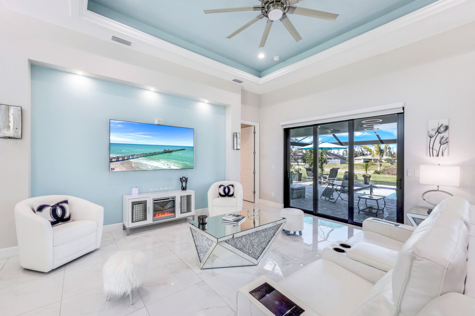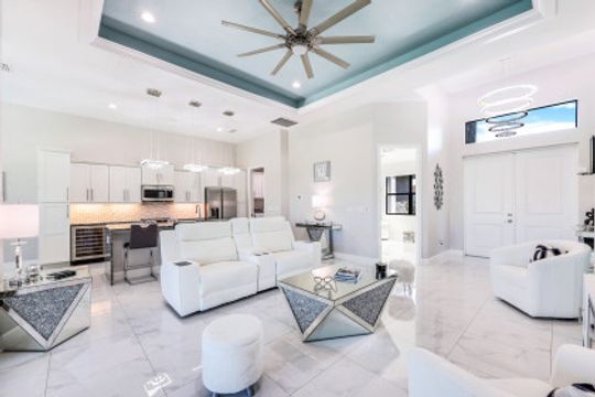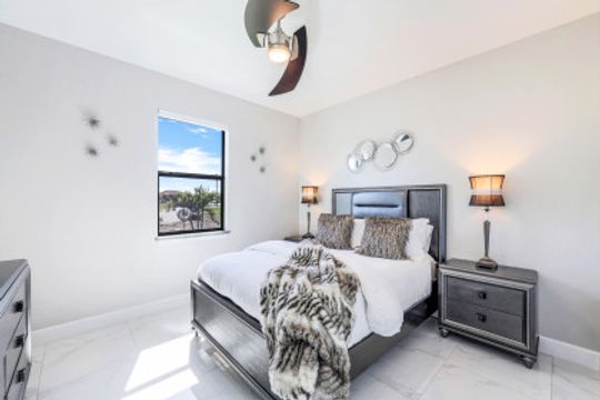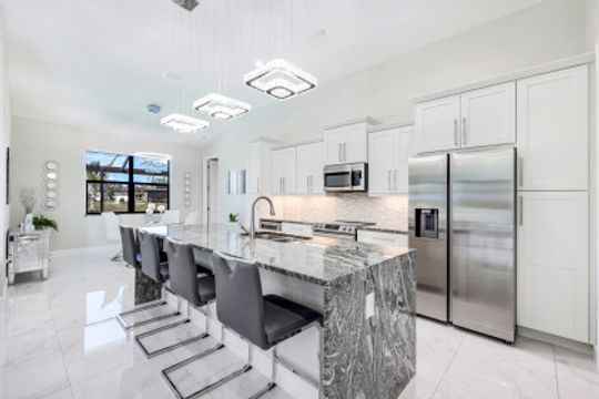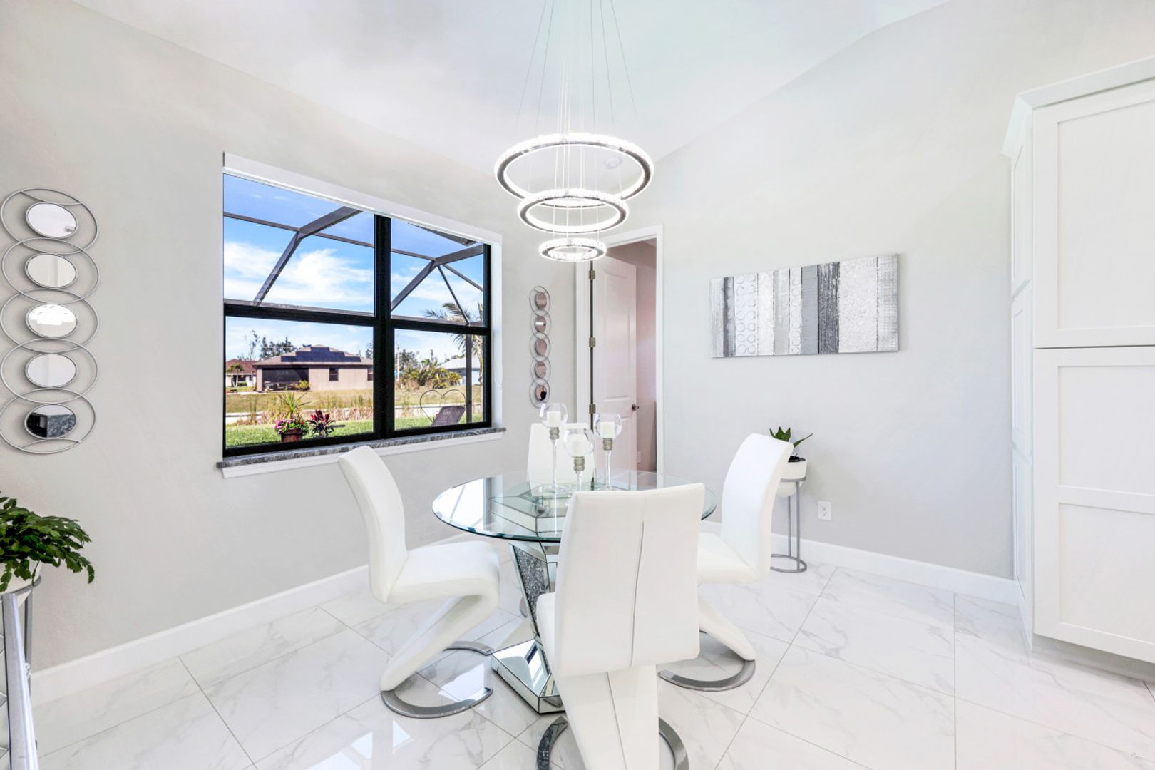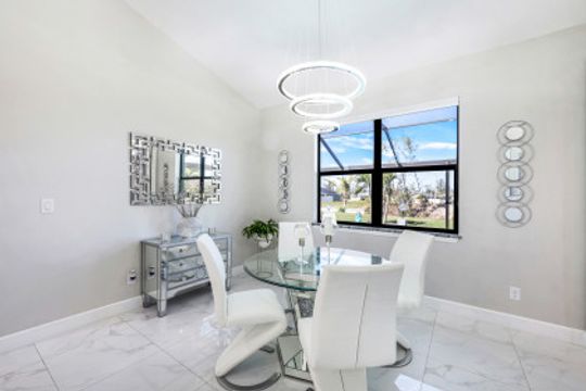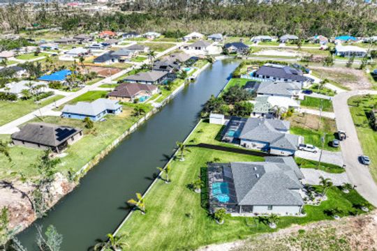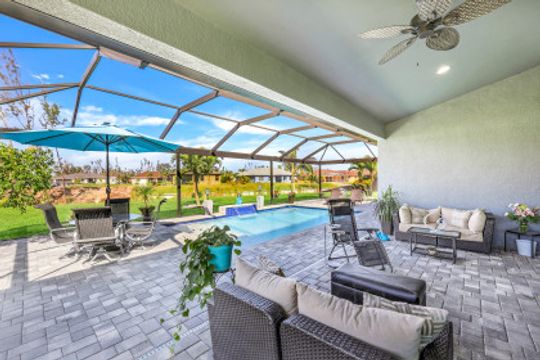 Absolutely impeccable! True pride of ownership is apparent in this immaculate, move-in-ready SW Cape Coral Pool home. Beautifully situated on an almost 0.4-acre lot with 173’ of freshwater canal surrounded by manicured landscaping. Well-appointed outdoor living includes an inviting saltwater pool with a sun shelf, double bubbler & underwater LED lighting overlooking the canal & complimented by a “must have” screened lanai spanning across the entire rear of the home. Upon entry into the home, you will immediately be captured by the open living concept cultivated for both entertaining & everyday living. Triple sliders with electric blinds create an easy flow between the stylish indoors & great outdoors. Large scale Italian porcelain flooring throughout the entire home. High ceilings with lighted tray ceilings in both living & primary suite promote the natural light. Custom zebra blinds manage the sun when you’re ready to unwind. Exquisite custom lighting & fixtures throughout. The stunning kitchen itself is appointed with an eye-catching waterfall edge granite counter, oversized island with pendant lighting, built in wine cooler, under cabinet lighting, integrated garbage pull out, upgraded SS appliances & white shaker cabinets with plenty of storage with soft close feature & dovetail construction. Conveniently located, the adjacent laundry room offers a large closet that can be used as a pantry. The split floorplan with a total of 4 bedrooms & 2 bathrooms, allows for a private primary suite with double, spacious walk-in-closets complimented by a tastefully designed ensuite bath with his and hers vanity, large walk-in shower, frameless glass shower door, pebble tile floor in shower, Italian glass mosaic tile waterfall & private water closet. Custom Paver entryway, pool deck/lanai and driveway leading to a full size 3 car garage. This home captures the essence of modern conveniences throughout, thoughtfully laid out and will not disappoint! Welcome to SW Florida living!