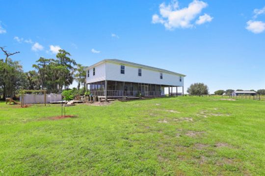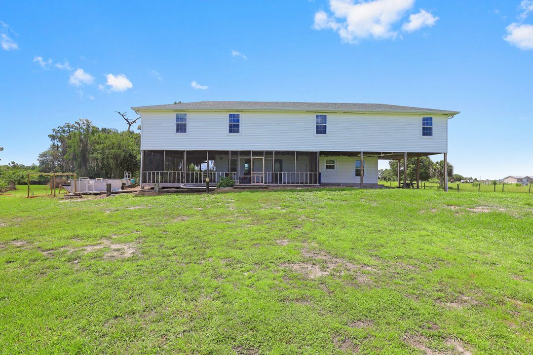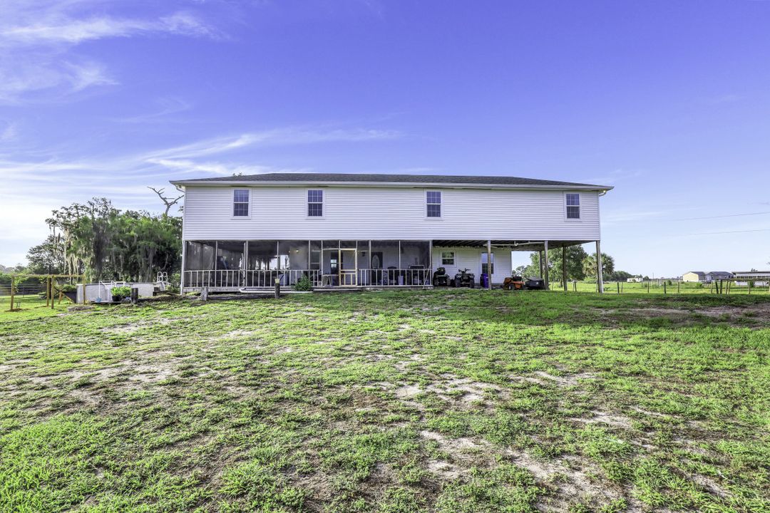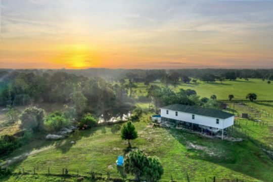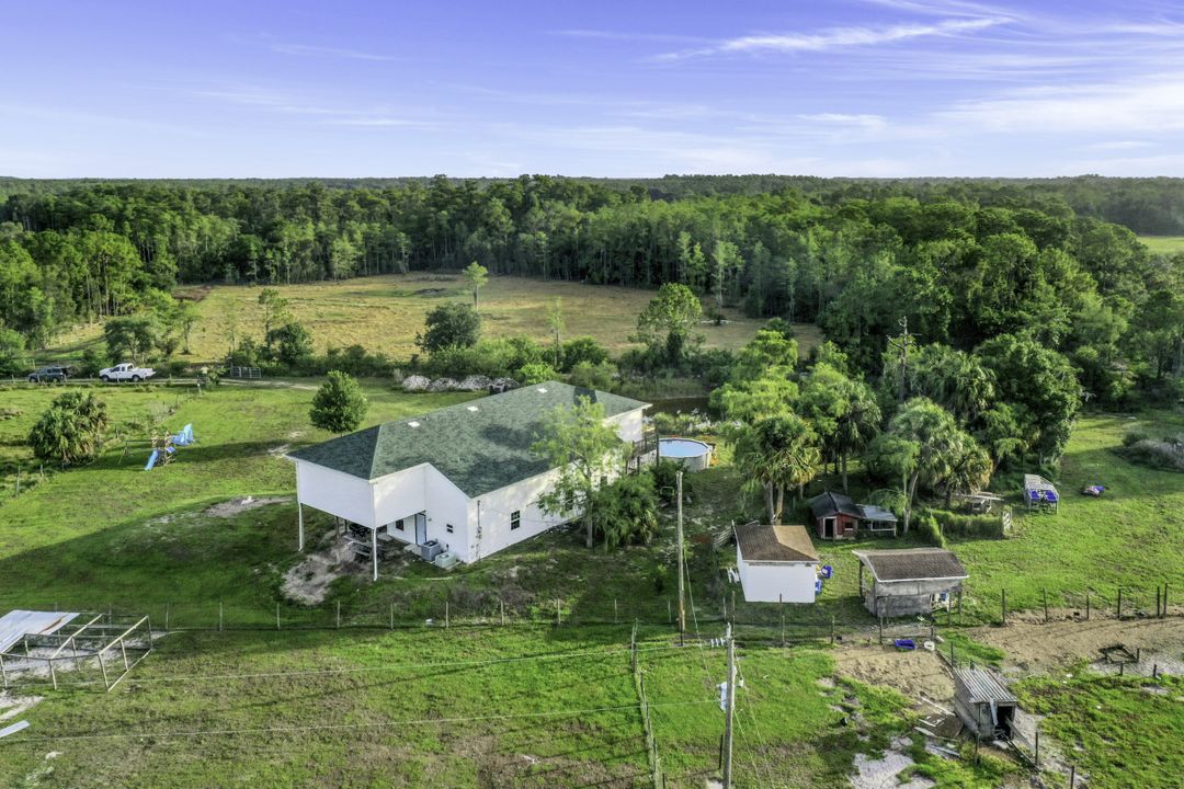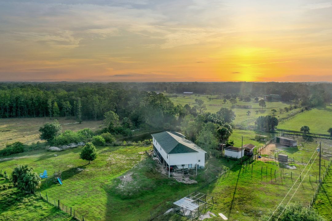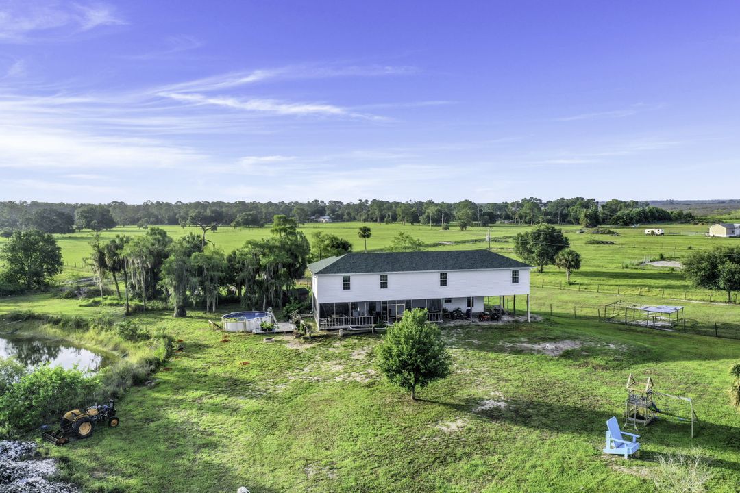 Enjoy breathtaking sunrise views on Misty Morning Lane from this 2 story 3 bed 4 bath home sitting on 8 acres of land in secluded, serene Wildcat Farms. Once known as a citrus grove the mornings sometimes presents an airy light mist capturing the beauty of country/rural living, hence the name Misty Morning. This creative two story floorplan features an expansive under building wrap around porch, half screened providing plenty of room for relaxing & half open, perfect for parking the RTV's or using as additional storage. First floor showcases second story cathedral ceilings, tile throughout the greatroom area & a freshly updated eat-in island kitchen which features plenty of cabinets, double wall ovens, electric cook top surface & double farmhouse sink. The second floor, open to the first, hosts a large newly painted owners suite with private balcony, his & her walk in closets & private bath with walk in shower & dual vanities. Two guest rooms also newly painted each with a private bath. Impact windows & sliders with lifetime warranty throughout. Your own private 10-15' deep pond, above ground pool & plenty of land for gardens, farm animals & the kids to play freely without worry.
