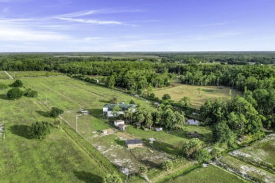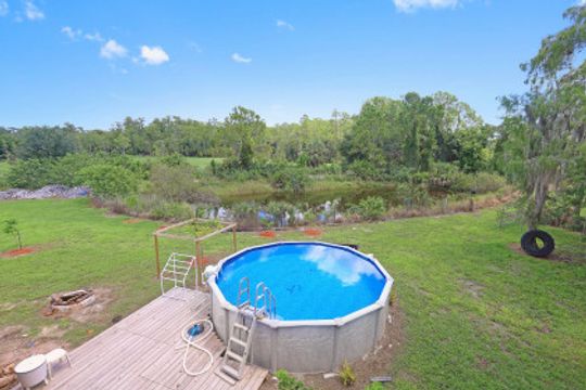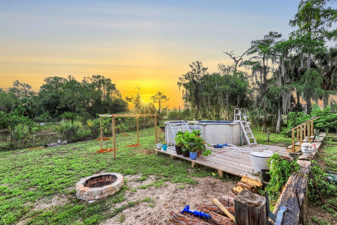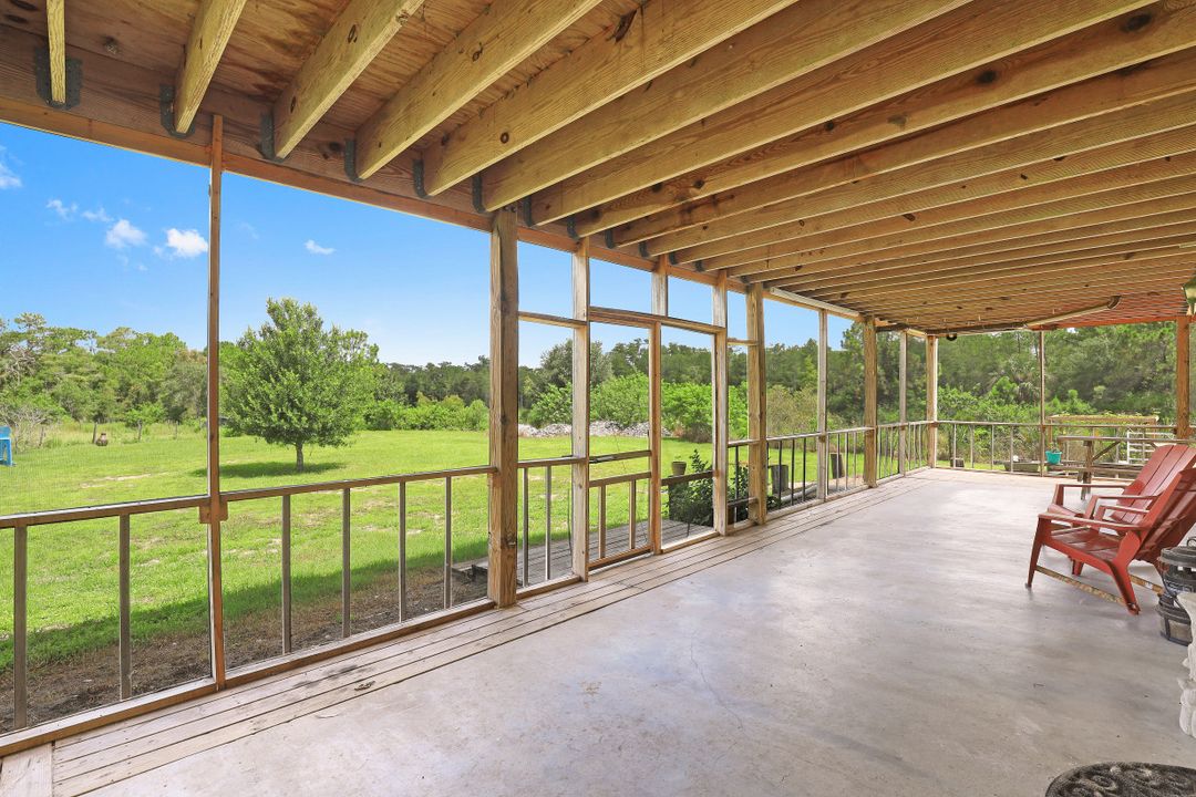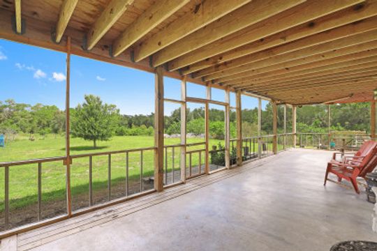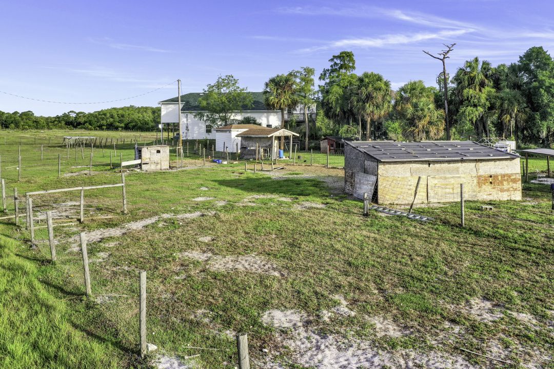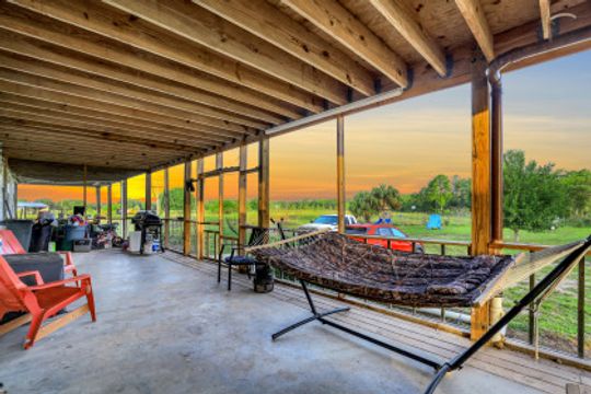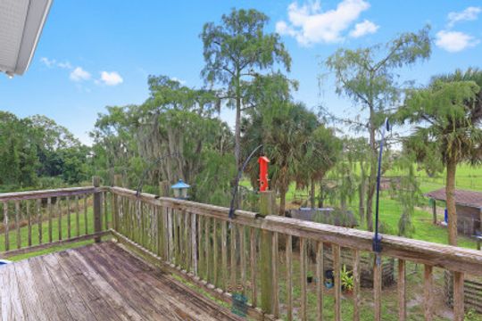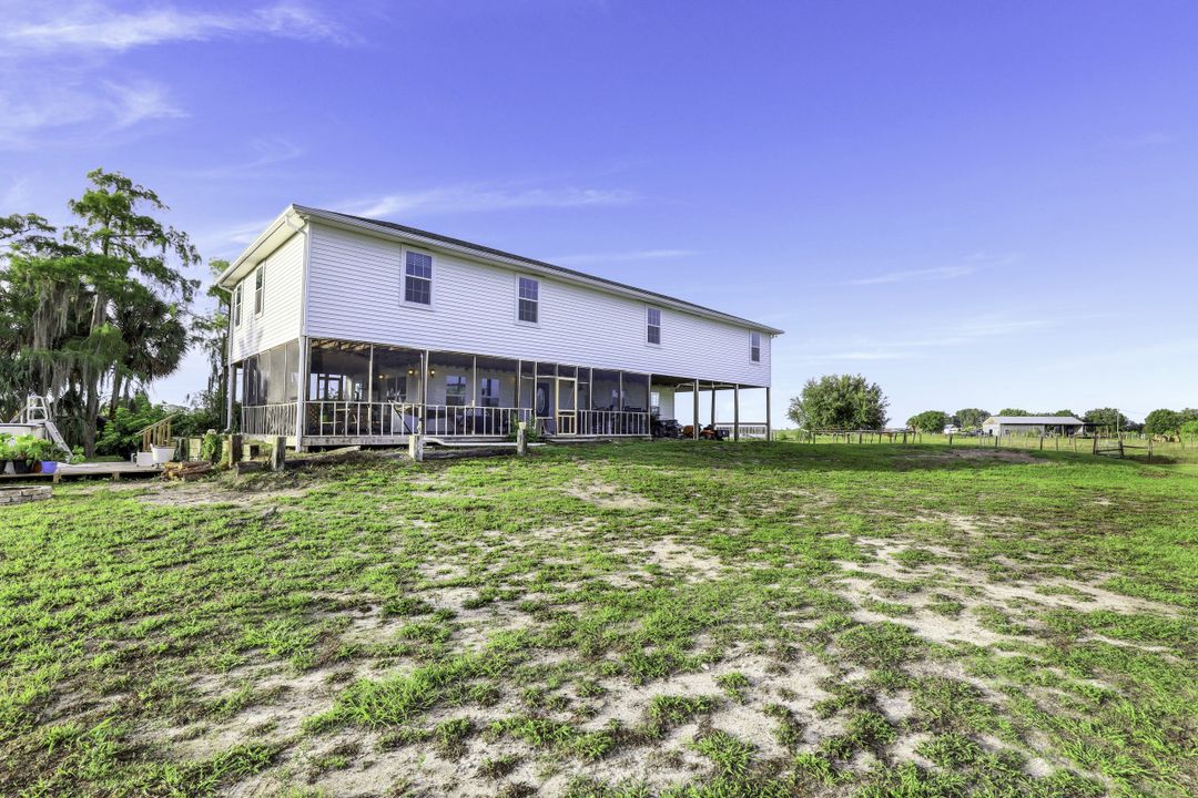 Enjoy breathtaking sunrise views on Misty Morning Lane from this 2 story 3 bed 4 bath home sitting on 8 acres of land in secluded, serene Wildcat Farms. Once known as a citrus grove the mornings sometimes presents an airy light mist capturing the beauty of country/rural living, hence the name Misty Morning. This creative two story floorplan features an expansive under building wrap around porch, half screened providing plenty of room for relaxing & half open, perfect for parking the RTV's or using as additional storage. First floor showcases second story cathedral ceilings, tile throughout the greatroom area & a freshly updated eat-in island kitchen which features plenty of cabinets, double wall ovens, electric cook top surface & double farmhouse sink. The second floor, open to the first, hosts a large newly painted owners suite with private balcony, his & her walk in closets & private bath with walk in shower & dual vanities. Two guest rooms also newly painted each with a private bath. Impact windows & sliders with lifetime warranty throughout. Your own private 10-15' deep pond, above ground pool & plenty of land for gardens, farm animals & the kids to play freely without worry.