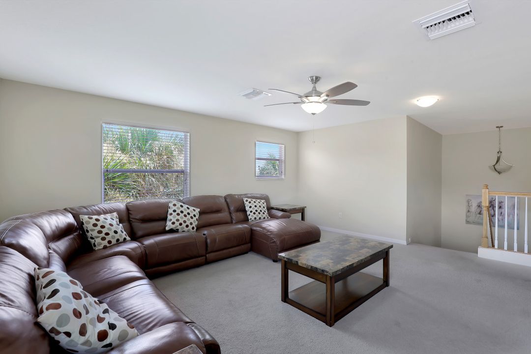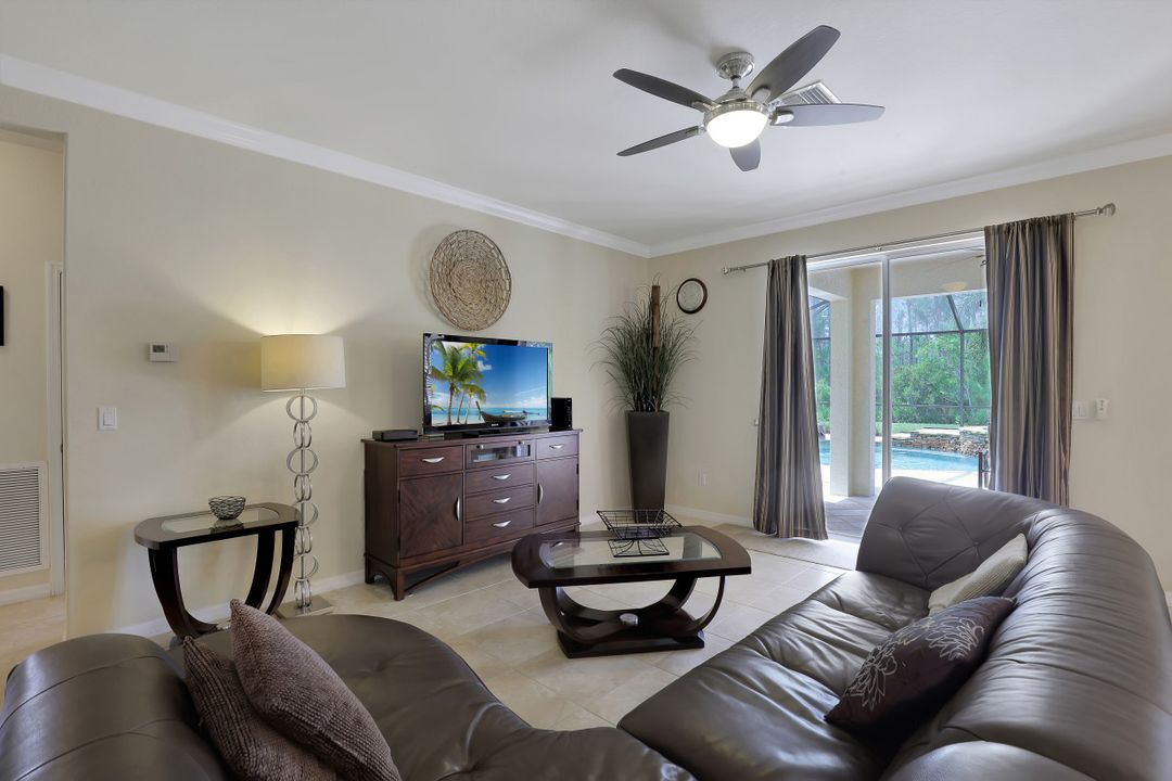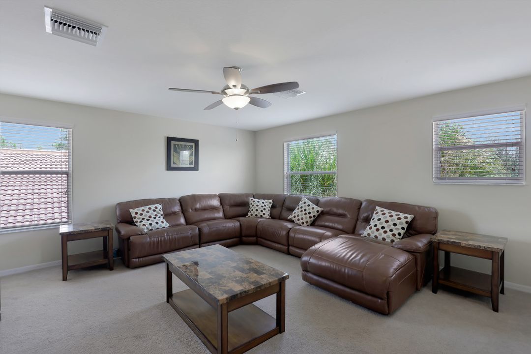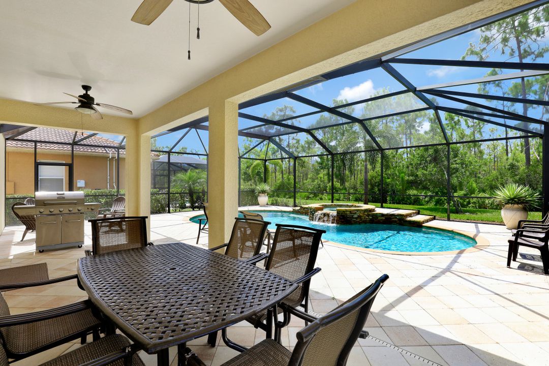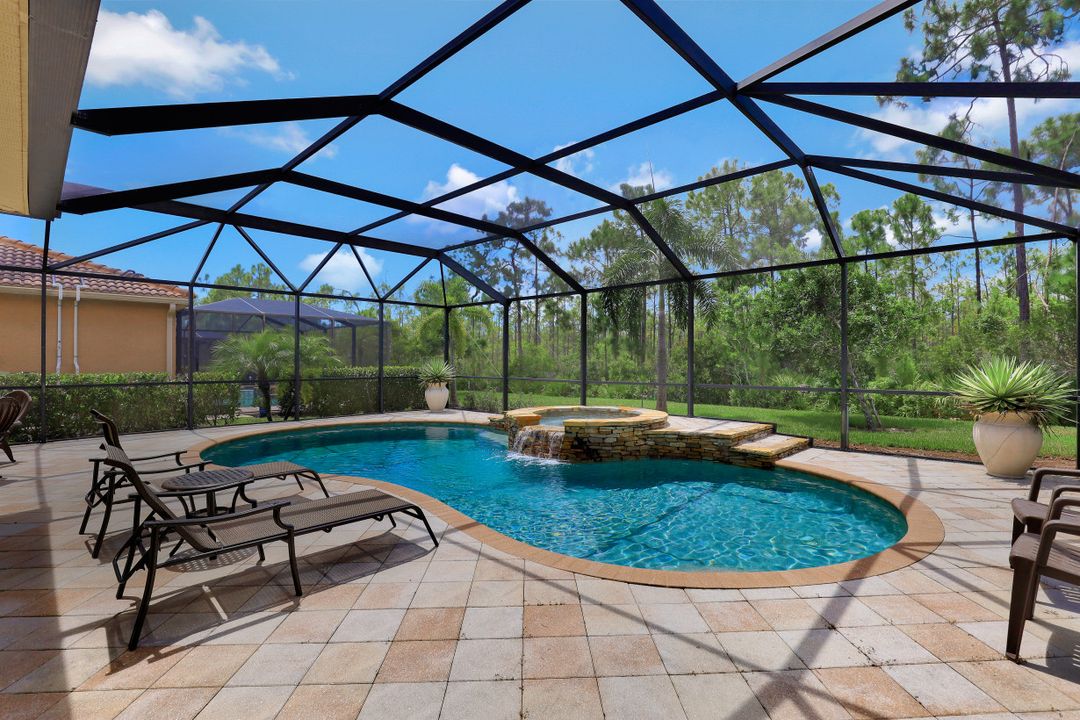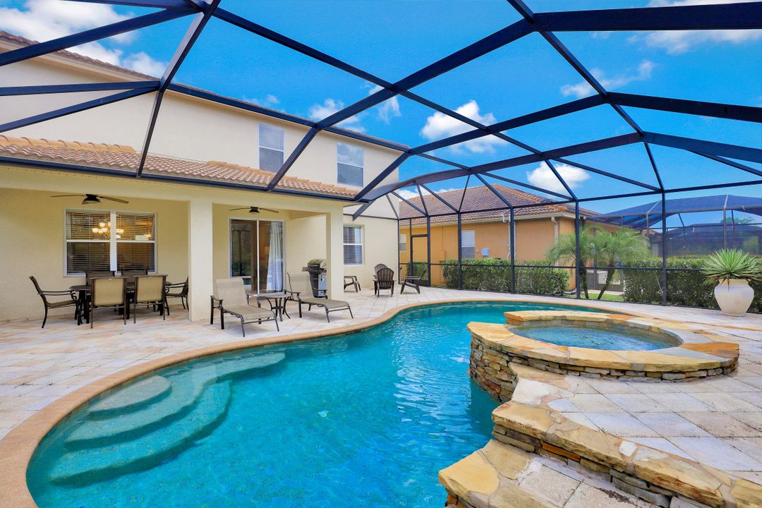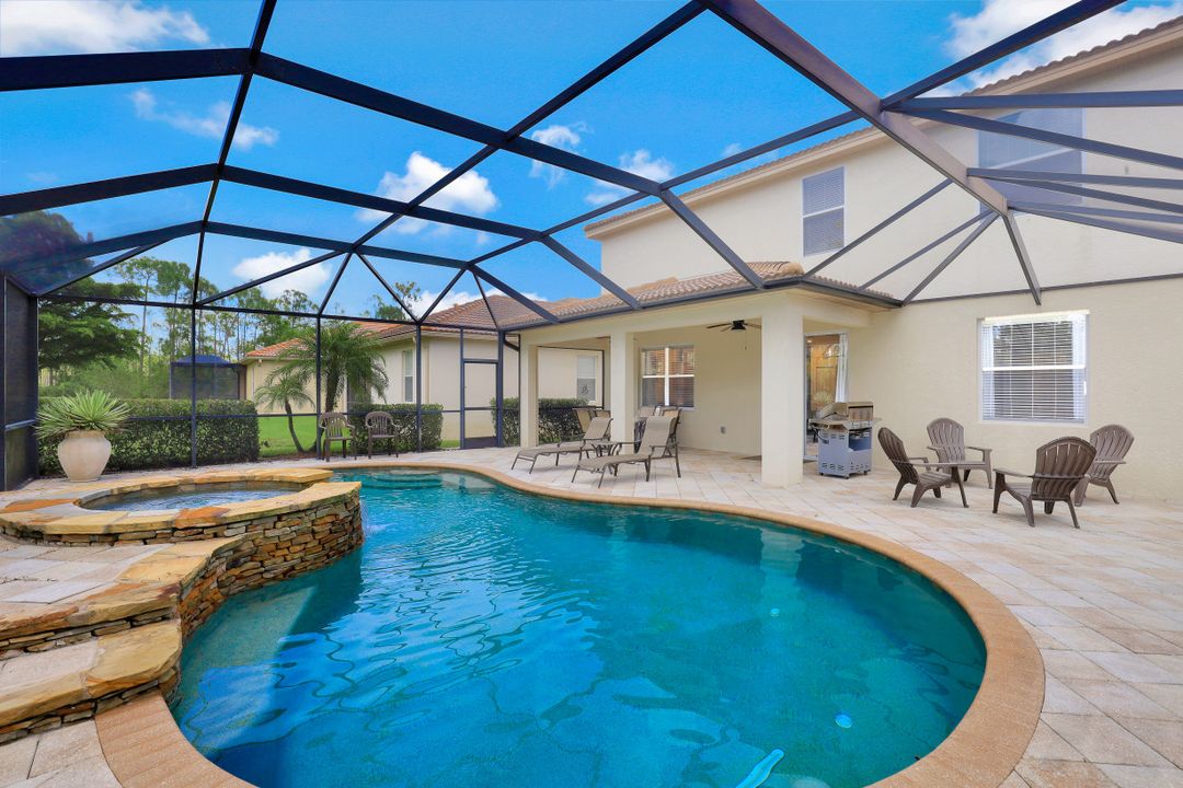 Upgraded Pool Home in Bella Terra. Room for the entire family in this nearly 2,600 sq.ft. home featuring 4 bedrooms + den and 3 full bathrooms. Amazing pool and lanai with natural stone, spa hot tub with waterfall, upgraded saltwater filtration system, and heated. All this overlooking the natural private preserve with no neighbors behind. The ideal pool area for the family! The home is upgraded throughout with tile roof, crown molding, stainless steel appliances, granite counters in the kitchen and bathrooms, a large loft upstairs for a 2nd family room, kids play room, or media area. One bedroom + den on the 1st floor and 3 bedrooms on the 2nd floor. Upstairs loft provides flexibility for almost anything you need like family game night or play room for the kids. Located in Bella Terra, one of Estero's premier communities, there are amenities for all with everything from beach volleyball, a resort style pool and spa, tennis and pickel ball courts, basketball, in-line skating, bocce ball, a flex field for intramural sports, a fitness center, playground, and tons of activities throughout the year. Come check out this phenomenal home in the amenity abundant neighborhood of Bella Terra.