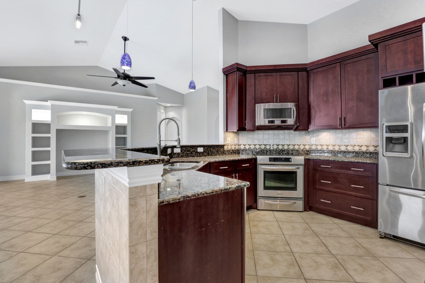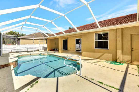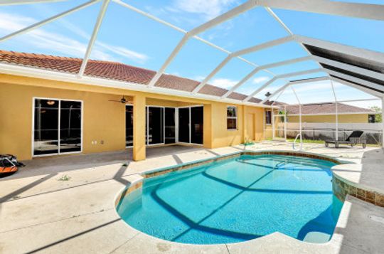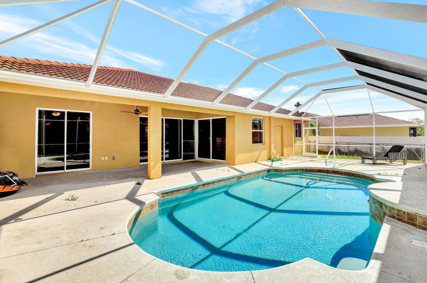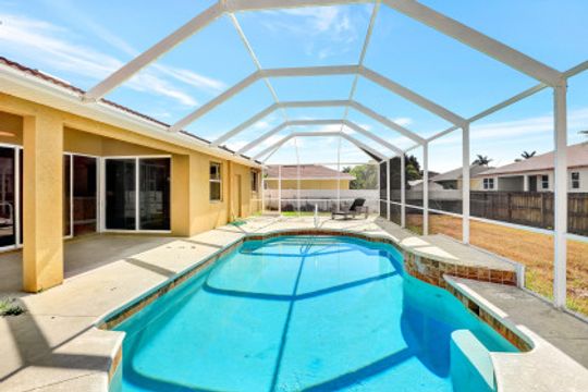SOUTHERN EXPOSURE POOL HOME! Nestled in SW Cape just off Oasis & walking distance to Oasis Elementary, Middle & High school! 3BR+Den, 2BA, 2 Car Garage w/over 2,100 sq ft of living space! Features Include: tile roof, soaring vaulted ceilings, French doors & tile/vinyl flooring throughout. The kitchen offers granite counters, wood cabinets, SS appliances & breakfast bar. The owners suite features tray ceilings, large walk-in closets (In every room), gorgeous bathroom w/matching granite counters, tiled shower, built-in vanity, dual sinks & sliders to the lanai/pool. The outdoor living was designed for relaxation & includes a large screened in lanai- with plenty of room to sun bathe, covered patio, pool bath, outdoor shower & so much more! This home is completely fenced in-perfect for your furry friends! Enjoy everything that SW FL has to offer-boat, sail, kayak, SUP, jet ski, fish or simply take a dip in your private oasis! White sandy beaches & world class fishing can be at your fingertips!
