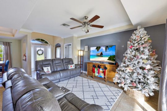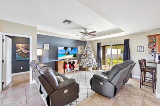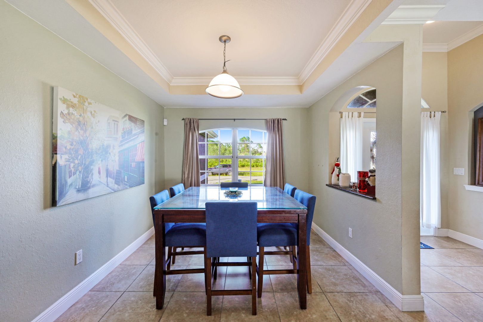 GREAT STARTER HOME, SECOND HOME OR INVESTMENT PROPERTY! You will not want to miss your opportunity to own this bright and airy 3BR, 2BA home with a 2 car garage, over 1,500 sqft of living space and a BRAND NEW ROOF REPLACED IN 2022! Upon entering your new home you will fall in love with the high ceilings and split bedroom, open floor plan layout. The updated kitchen includes granite counters, wood shaker cabinetry and stainless steel appliances. Other features include tray ceilings in the primary suite and both the living and dining rooms, crown molding, tile throughout and much more! The exterior features include mature landscaping and a large fenced in back yard with plenty of room to build your dream pool! For your peace of mind the home also comes with a wireless SimpliSafe security system that includes a sensor on all doors including the lanai, motion sensor and glass break sensor in the living room and open areas as well as a sensor on all bedroom windows and can be operated anywhere from the convenience of your smart phone. On top of all that, this home is IN AN "X" FLOOD ZONE! Schedule your private tour today!
