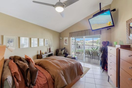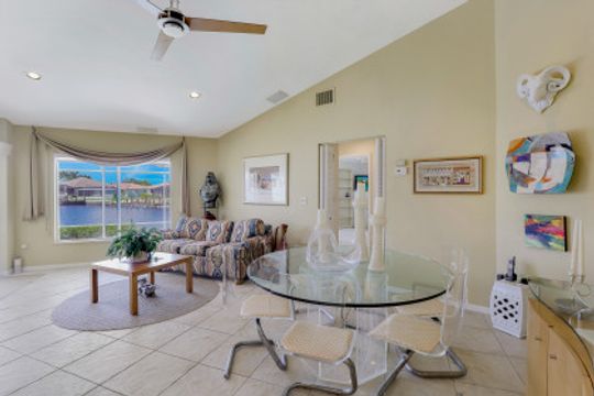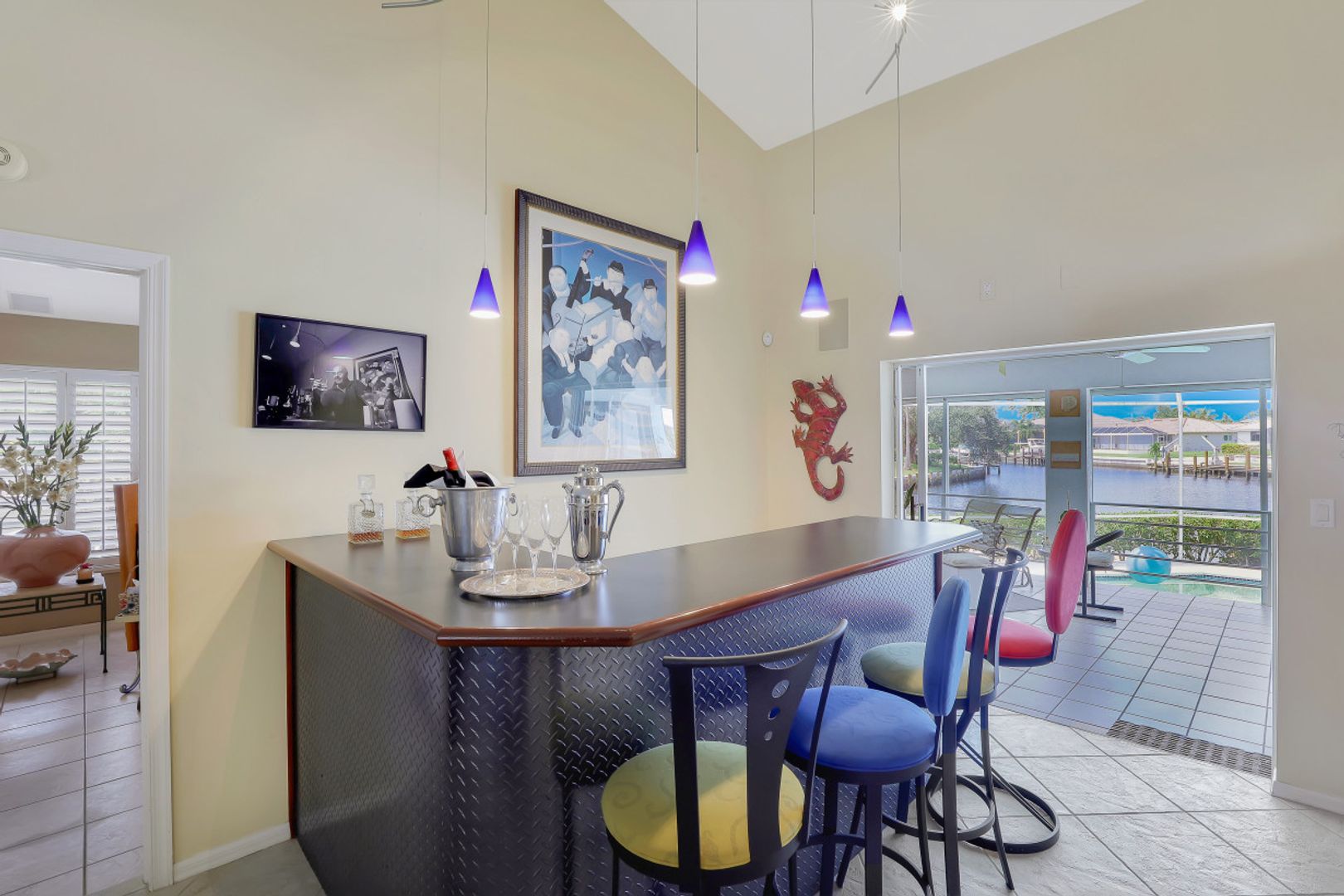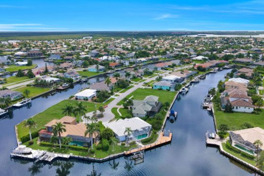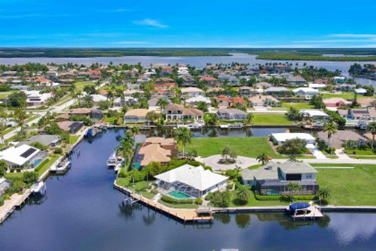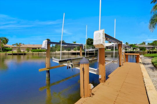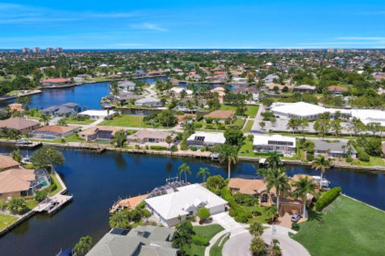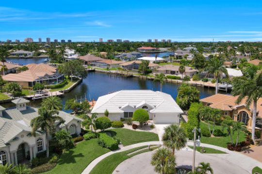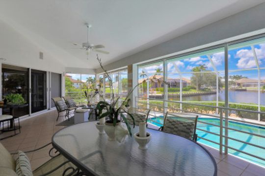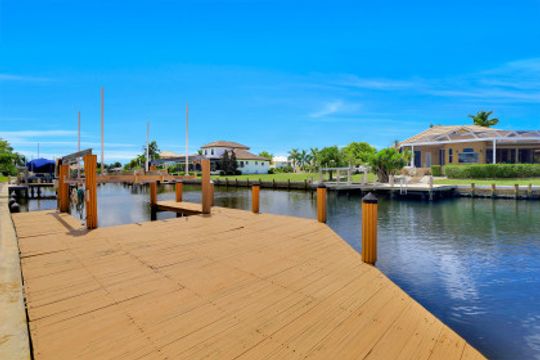This residence is located on an over-sized tip lot on a quiet cul-de-sac with 160 feet of spectacular waterfront and beautiful converging wide water views. Quick indirect access to the Marco River and Gulf of Mexico. Southwest exposure to enjoy breathtaking sunsets all year around. Expansive dock with two lifts to accommodate a larger boat for a great day of boating and fishing. This home features high vaulted ceilings for an open concept with separate living and dining areas. The kitchen comes with stainless steel appliances and counter seating that blends into a spacious family room. A split bedroom floor-plan allows privacy for your guests. Tile throughout for easy maintenance. A large covered deck with screened pool area is a great place for entertaining or enjoying the gorgeous water views. Electric storm shutters, plenty of extra storage and closet space. Great Neighborhood.