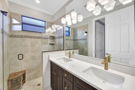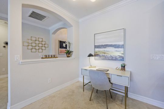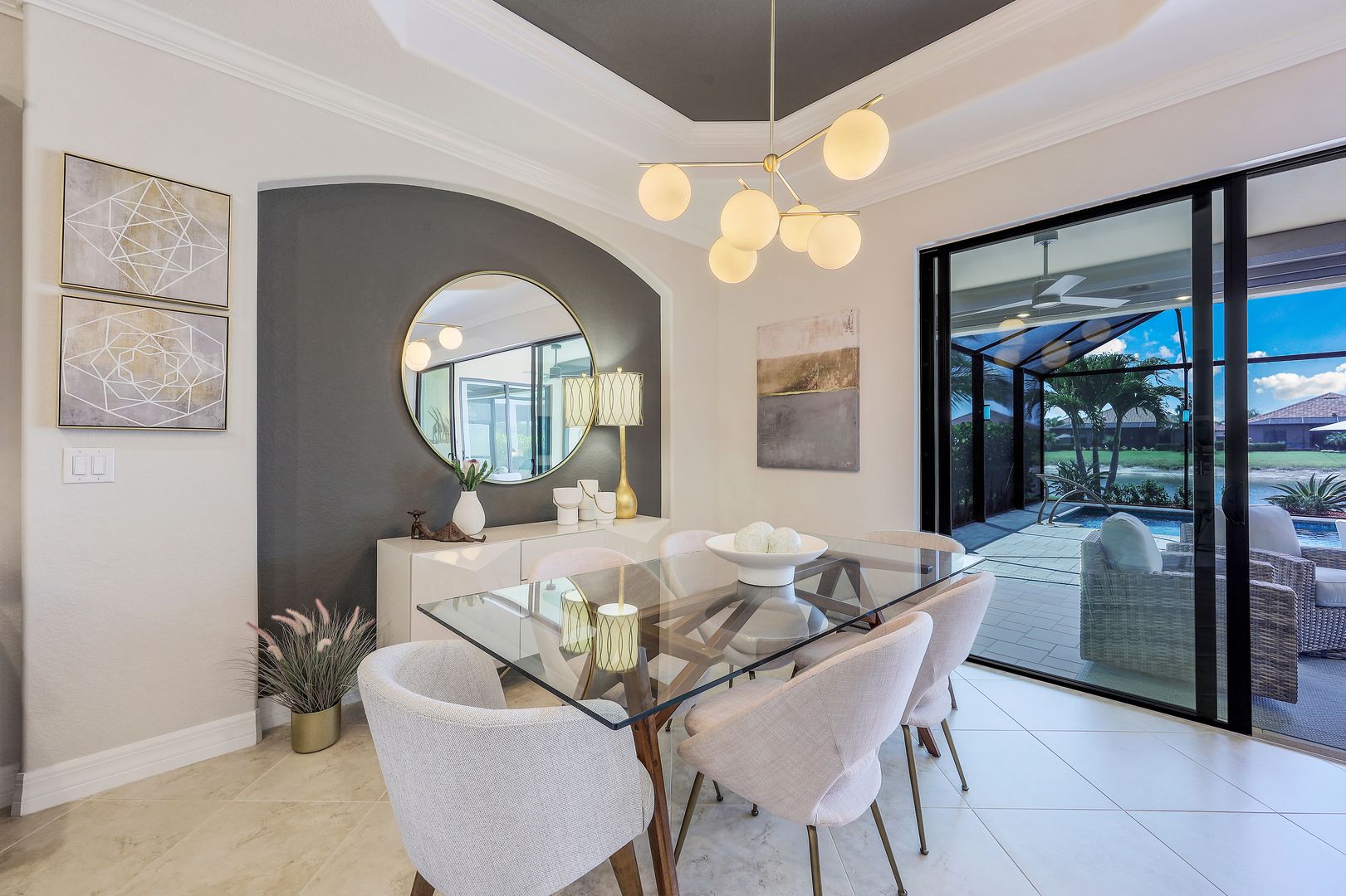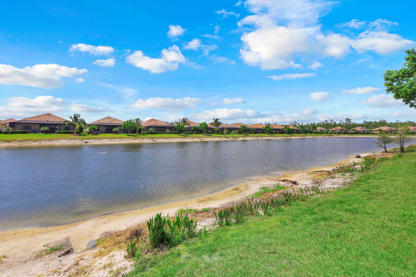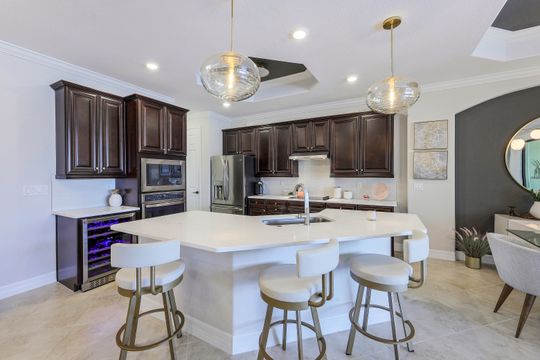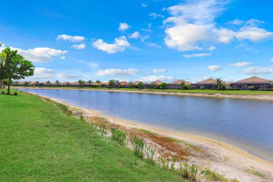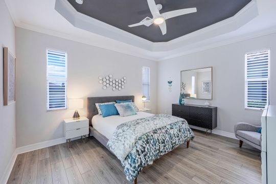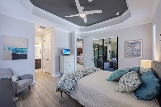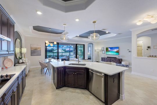 SOCIAL MEMBERSHIP included. This stunning home features a multitude of upgrades including custom paint, designer lighting, wine cooler, and COREtec flooring in the bedrooms, just to name a few! Step into the spacious and bright Great Room where you will be immersed in Modern Coastal elegance from the well-appointed kitchen with gorgeous quartz countertops and large center island for ease in entertaining to the open gathering room, all overlooking a lake and an incredible custom pool. The flex room off the welcoming foyer functions as a den or third bedroom and the "guest wing" offers the ultimate in privacy. Your beautiful master suite opens to the lanai and has two generous walk-in closets. Step out to the screened lanai and feel immersed in luxury! The custom, heated saltwater pool will delight you and your guests offering a sun shelf w bubbler, WiFi controls, color changing lighting and more. A generous covered seating area with Storm Smart hurricane screen is perfect for watching spectacular sunsets. Enjoy the community Lagoon Pool with Café and upscale dining in the Clubhouse. Located central to the sandy gulf beaches, downtown Naples, and RSW.