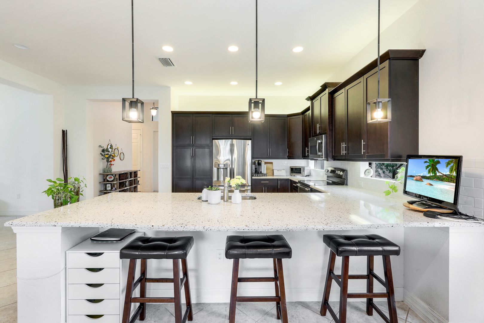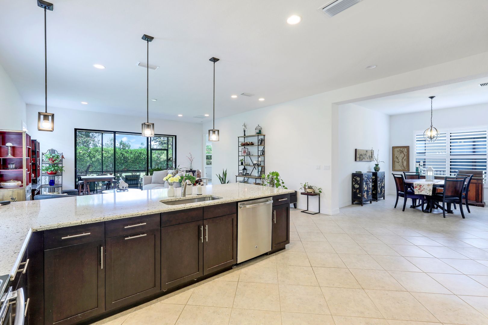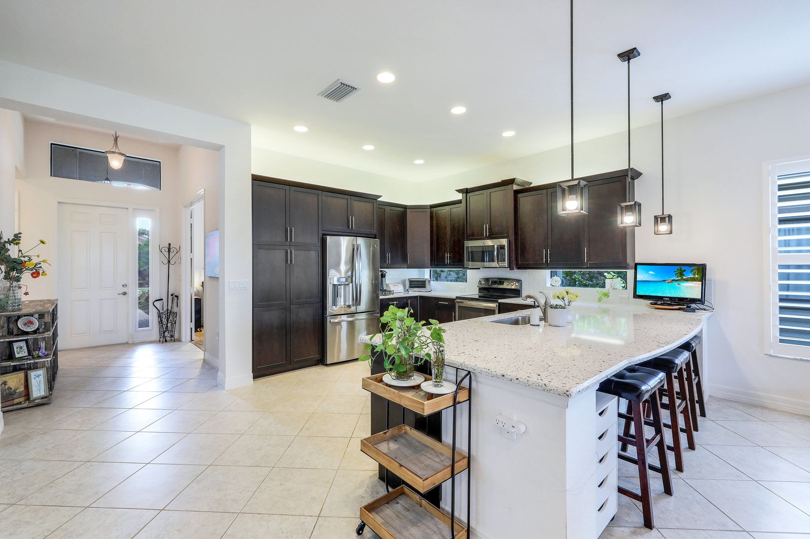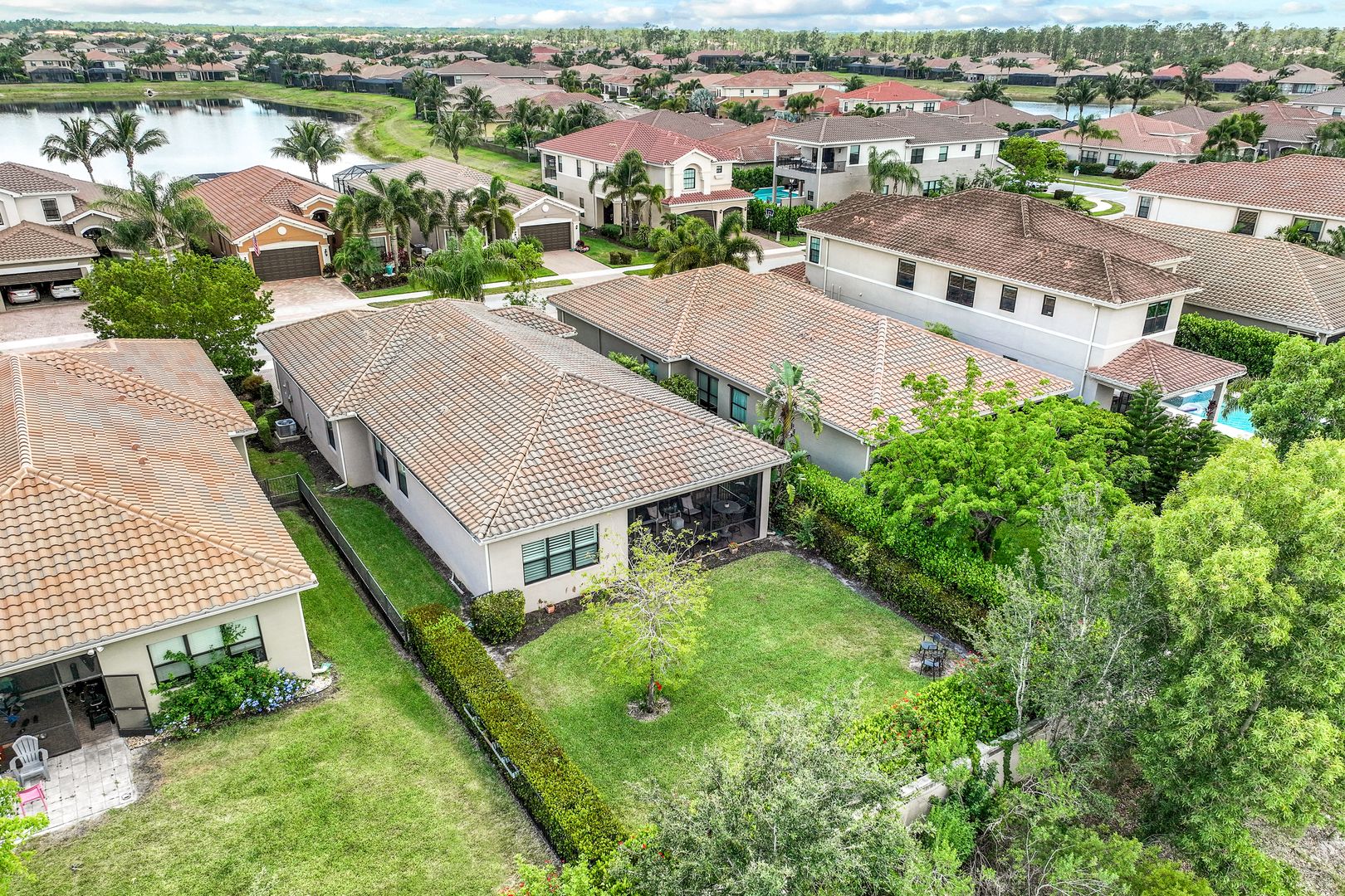 Make this charming Naples home your winter retreat or an easy to care for full-time residence where everyday living feels like a vacation. The open Burgundy floor plan is perfect for entertaining, allowing guests to mingle comfortably between the great room, dining room & kitchen. The light-filled kitchen has an oversized quartz dining counter, transom windows, upgraded cabinetry, ambient lighting & GE appliances. The master is located at the rear of the home overlooking the lawn and has 2 walk-in closets & en suite bath. The large den makes a great office but can be converted to a 3rd bedroom. Finished laundry includes w/d, sink, upper/lower cabinets & oversized storage closet. Out back is a screened covered patio, a fully fenced yard & plenty of space to create your own tropical outdoor oasis. Additional features include plantation shutters, widened driveway, diagonal tile in main areas, luxury laminate in bedrooms/den & pocket closet doors. Riverstone offers a social, vacation-inspired lifestyle for all ages. Including fitness facilities, social hall, resort & lap pools, spa, 5 Har-Tru tennis courts, basketball & pickleball courts, tot lot, & full-time activities director.