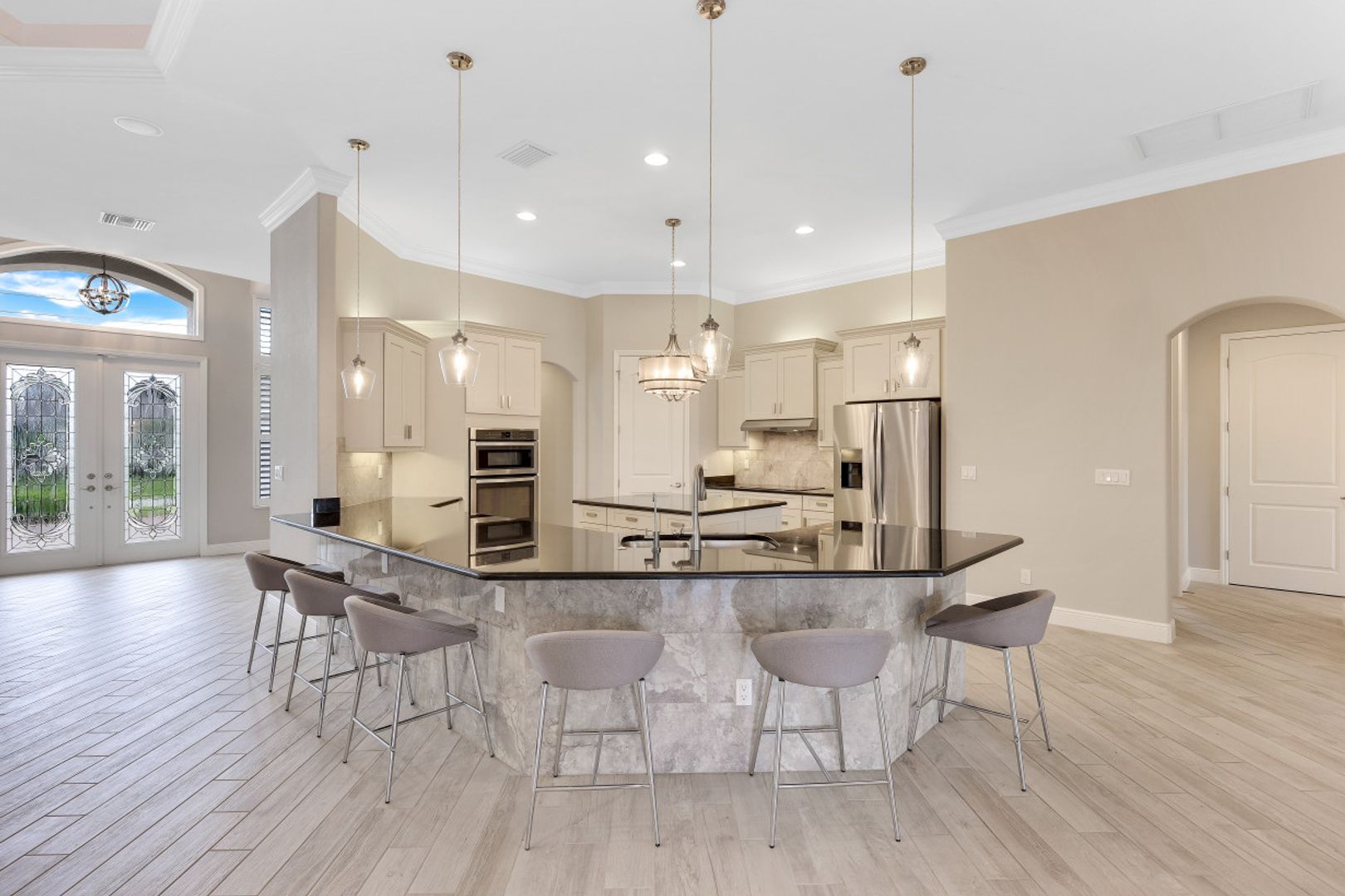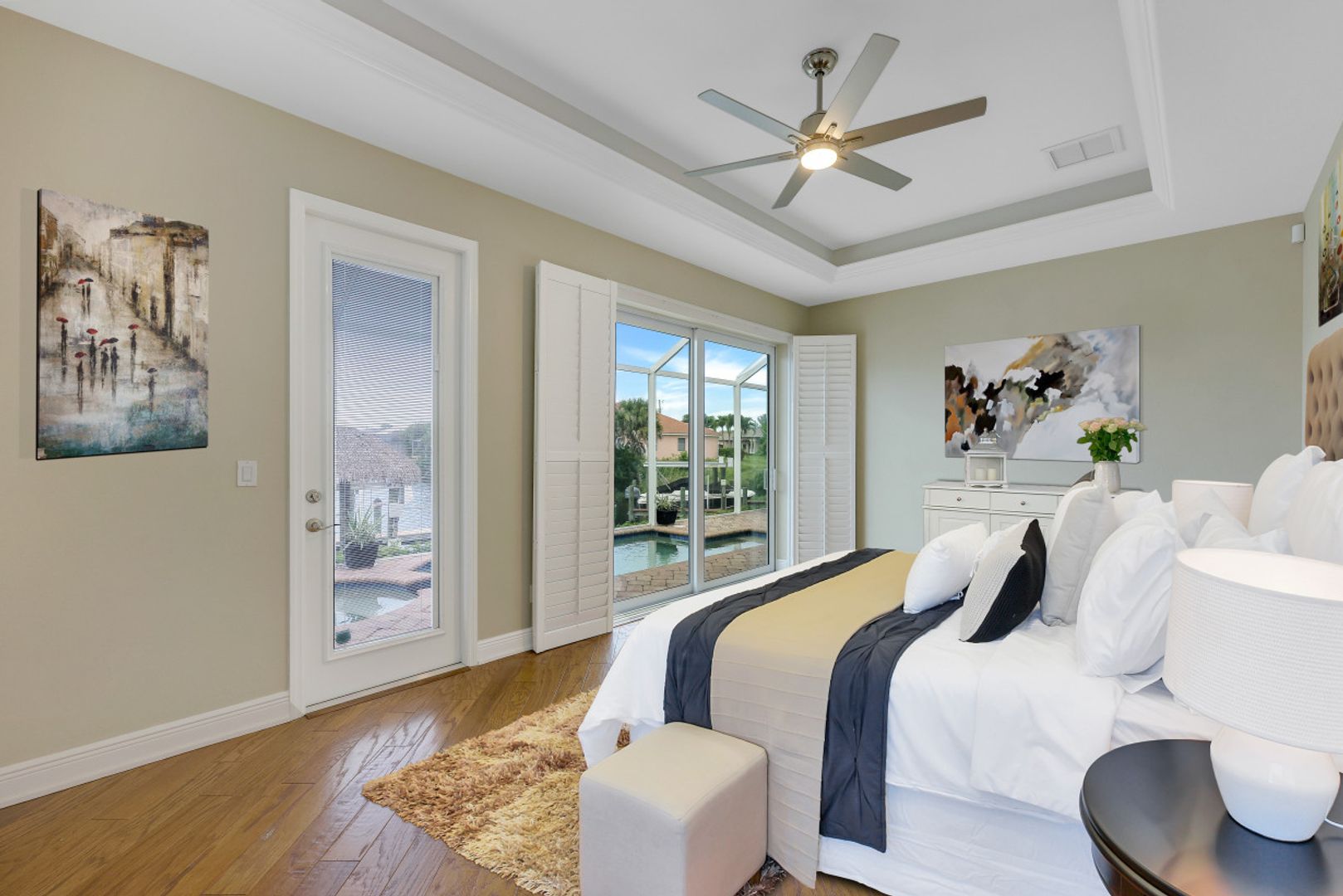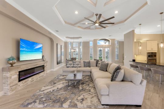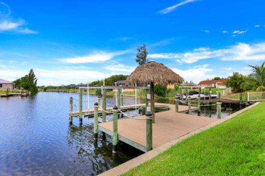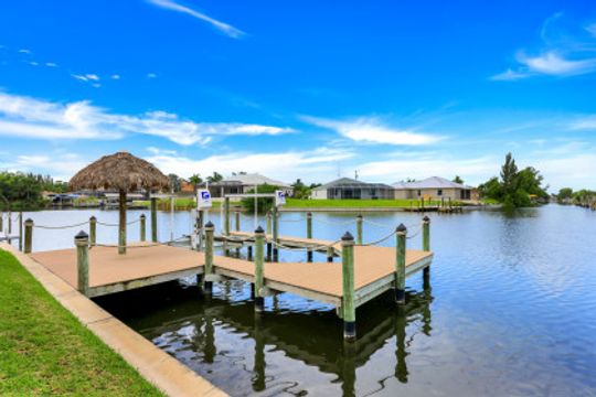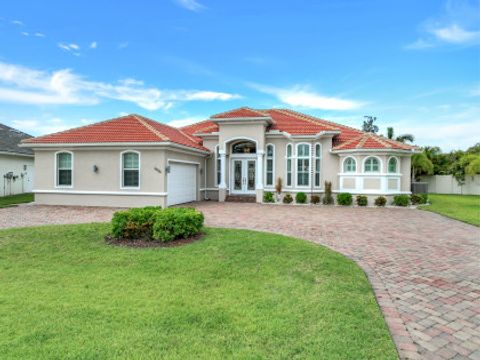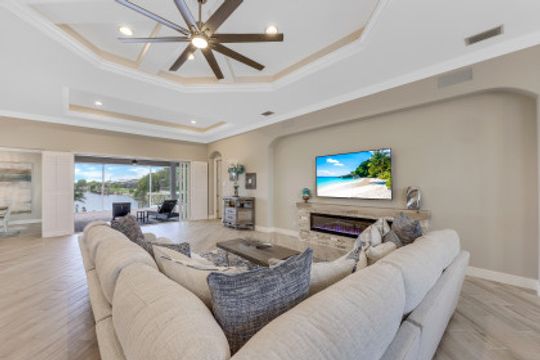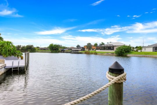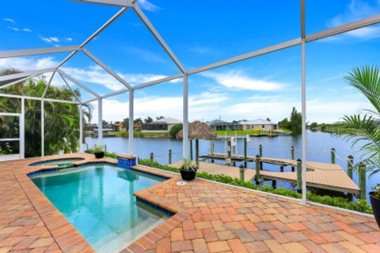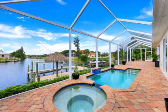 STUNNING SUNSETS WITH WESTERN EXPOSURE ON UNOBSTRUCTED INFINITY CANAL W/LAKEFRONT VIEWS off canal cul-de-sac with GULF ACCESS in SW Cape Coral. Enter a great open room floor plan with an immediate striking water view, 11' tray ceilings, 8' doors, plank tile on diagonal & plenty of natural light. Over 3400 sq ft of living space, formal dining & multiple points of entry onto the extended paver lanai area. The large breakfast bar kitchen with an island features black granite counters, a wall oven, stainless steel appliances, under mount sink, & tankless reverse osmosis system. The entire house is wired for high-speed internet in every room. Owners’ suite with tray ceiling & walk-in closets has a large bath with coffered ceilings, dual vanities, a soaker tub & walk-through shower. Large additional bedrooms plus a large guest room/junior master, each has full baths. Features plantation shutters throughout plus crown molding, newly painted, steam shower, and 6' Napoleon Allure electric fireplace. The pool has a swimming machine for a great workout. NOT IN A FLOOD ZONE! Located on a quiet, low-traffic side street. White sandy beaches & world-class fishing can be at your fingertips.