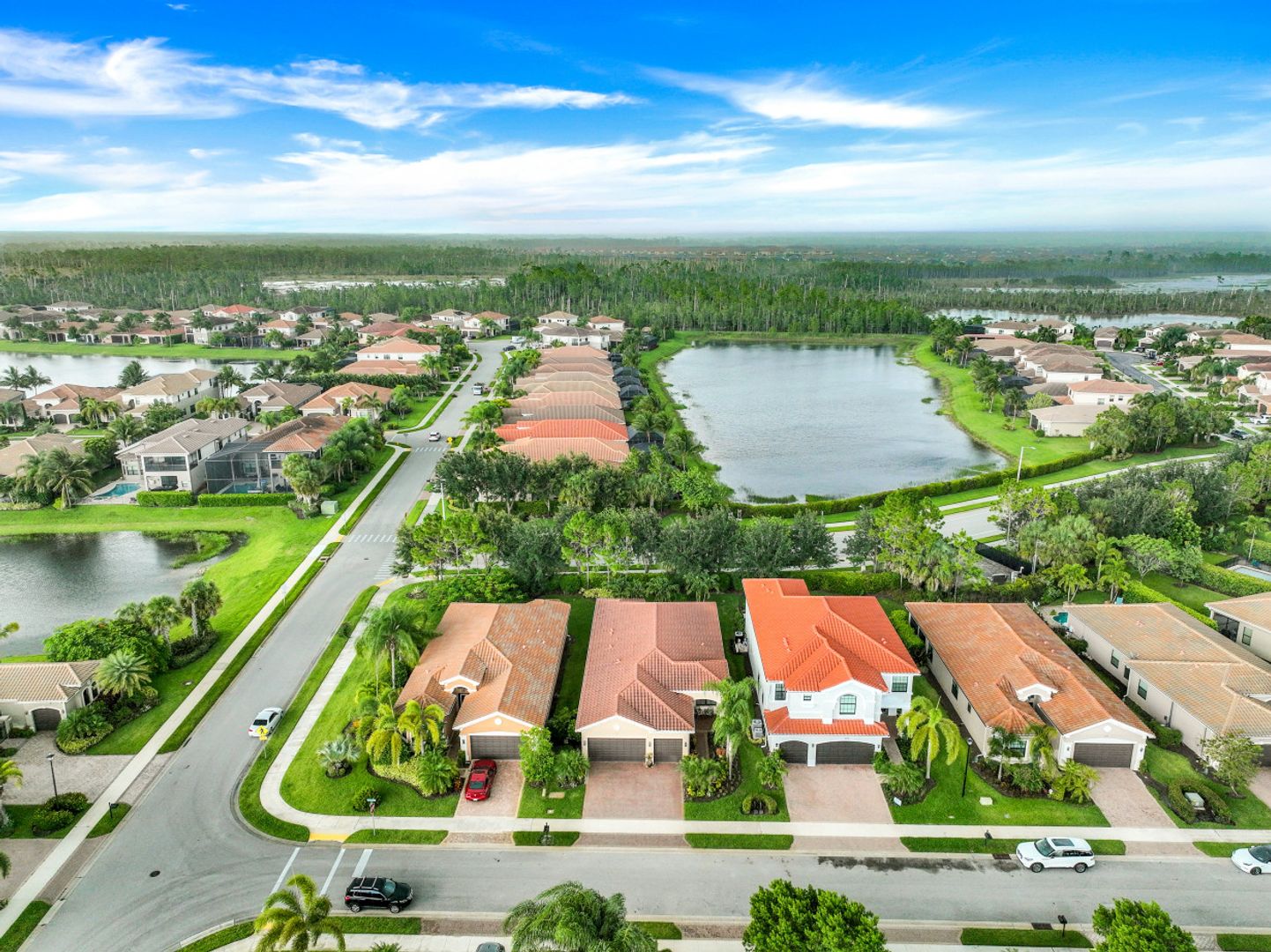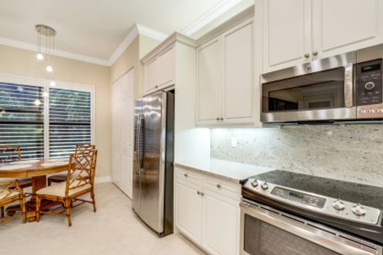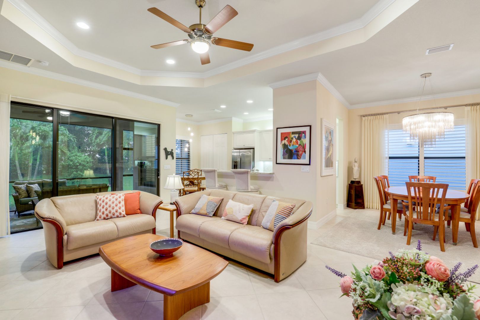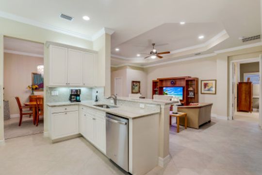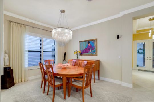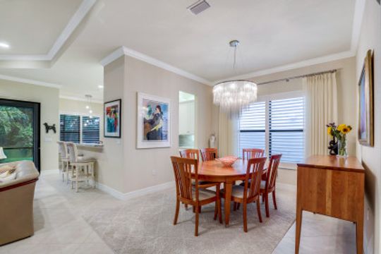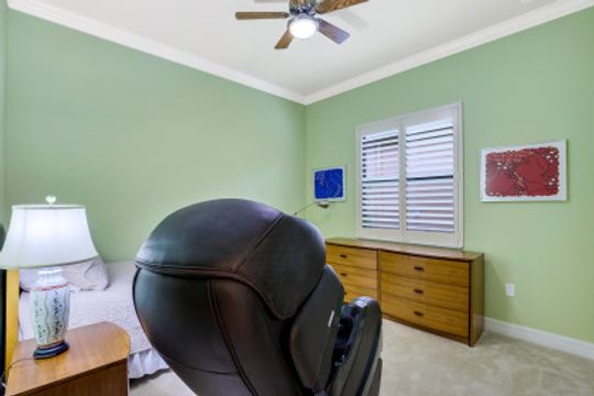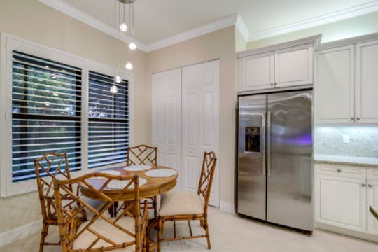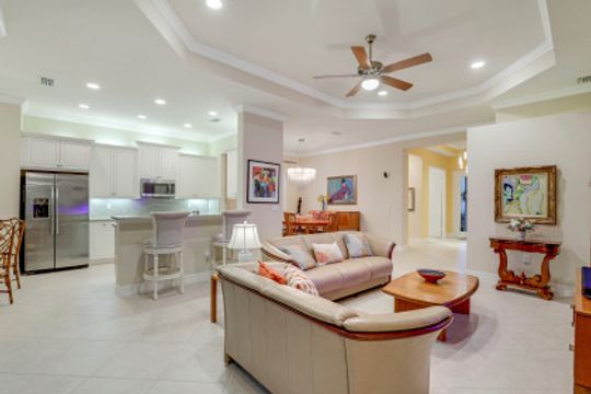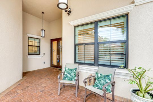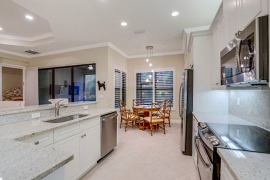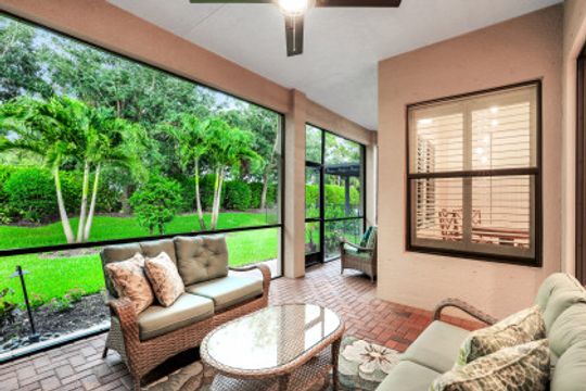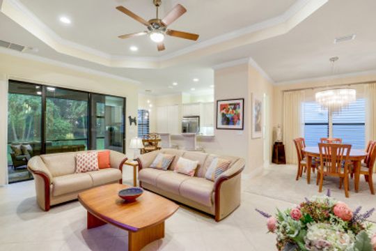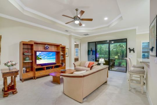 Welcome to this peaceful retreat where you can comfortably live year-round or escape northern winters. Upon entering, the long foyer takes you to the heart of the home with it's light-filled, open-plan living area which includes a great room, dining room, casual dining area & gorgeous kitchen. The kitchen features white cabinetry with gourmet package, accent lighting, granite counters & backsplash. Fantastic storage with the addition of a large closet in great room, custom closets, & garage cabinets. Additional upgrades include plantation shutters, crown molding, framed mirrors, frameless master shower door, lighting & fans. Out back you will find a screened, covered lanai that has electric storm smart hurricane screens providing safety, security & privacy. Enjoy the lushly landscaped backyard or create your own tropical outdoor oasis in the future by adding a pool. Riverstone offers a social, vacation-inspired lifestyle for all ages. Located in in an "A" rated school district. Recreation area includes a fitness, social hall, resort & lap pools, spa, 5 Har-Tru tennis, basketball & pickleball courts and tot lot. With a full-time activities director it is easy to make new friends.