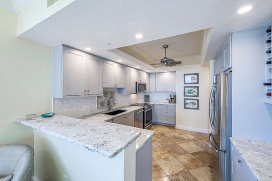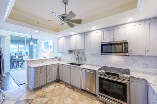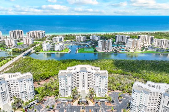 Elevate Your Experience of Sun, Sand and Splendid Sunsets! Panoramic water views of the Gulf of Mexico and Turkey Bay await at this fabulous Penthouse residence at The Dunes, a gated resort-style club community off Vanderbilt Beach in North Naples. Light-filled and luxuriously renovated, the Penthouse can convey turnkey furnished if desired. The spacious floor plan couples a seamless great room flow with the privacy of 3 BR suites and 3 full BAs, and an XL lanai complete with electric storm shutters. Signature features range from travertine stone and wood floors to a granite-topped custom wood Kitchen-by-Clay. The owner's suite with ample closet space incl. custom built-ins showcases a renovated spa bath with walk-in shower and soaking tub. Crown molding and custom lighting are icing on the cake. Impeccably maintained, the tower has a renovated lobby off the porte-cochere, under-the-building garage parking and bike storage, and a tropical pool with spa and poolside BBQ grills. Managed by Troon Prive, The Club at The Dunes offers a 2019 completed coastal-themed amenities center incl. a spectacular poolscape with tiki bar and poolside dining, Royal Palm restaurant, full-service tennis and pickleball center, as well as a fitness and wellness center.