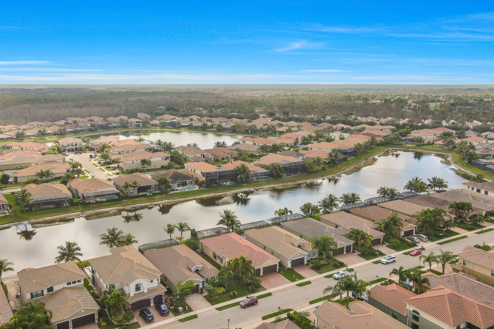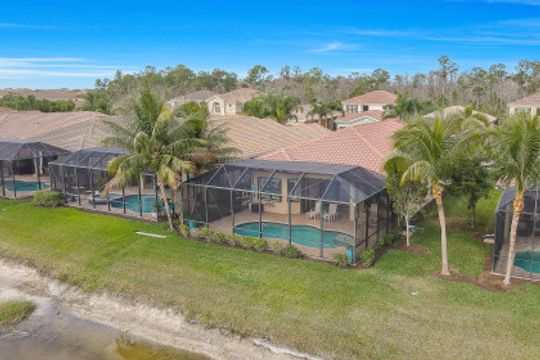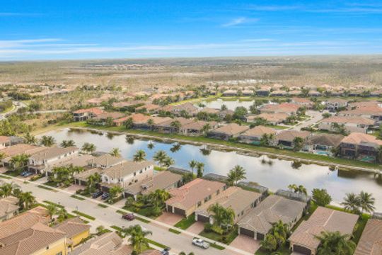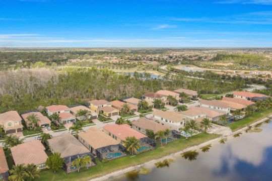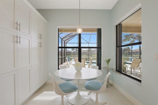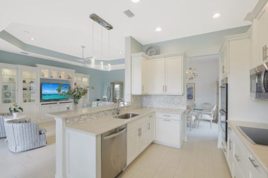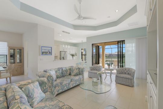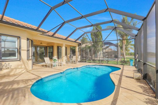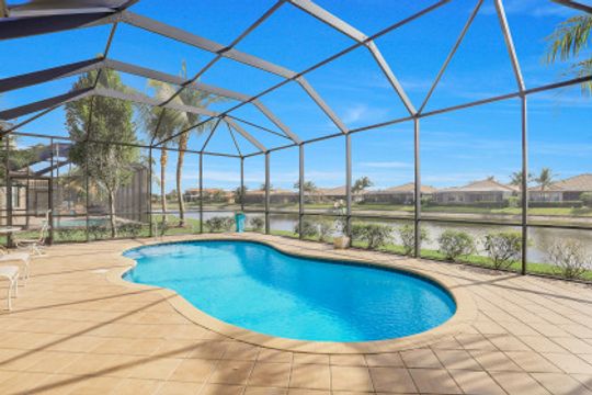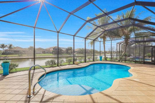 Welcome to this light & bright coastal inspired home where everyday living feels like a vacation. Savor your morning coffee in the large screened lanai watching the sunrise over the sparkling lake & spend the afternoon lounging in the sun after a refreshing dip in your pool. Upon entering the spacious foyer, you will be drawn to the contemporary, easy to care for 12x24 tile floor. There is a fantastic built-in in the great room that is just as beautiful as it is functional. The gourmet kitchen is the crown jewel of the home with Level IV white cabinets (many with pull-outs), cabinet lighting, upgraded appliances including electric cooktop & double oven, quartz counters & backsplash. Work from home is a breeze in the nice sized den. Move-in ready with custom closets throughout, garage storage, ceiling fans, upgraded lighting & window treatments in place. Easy storm prep with impact windows & doors on front & attached shutters on sides & rear. Riverstone offers a social, vacation-inspired lifestyle for all ages. Including fitness facilities, social hall, resort & lap pools, spa, 5 Har-Tru tennis courts, basketball & pickleball courts, tot lot, & full-time activities director.