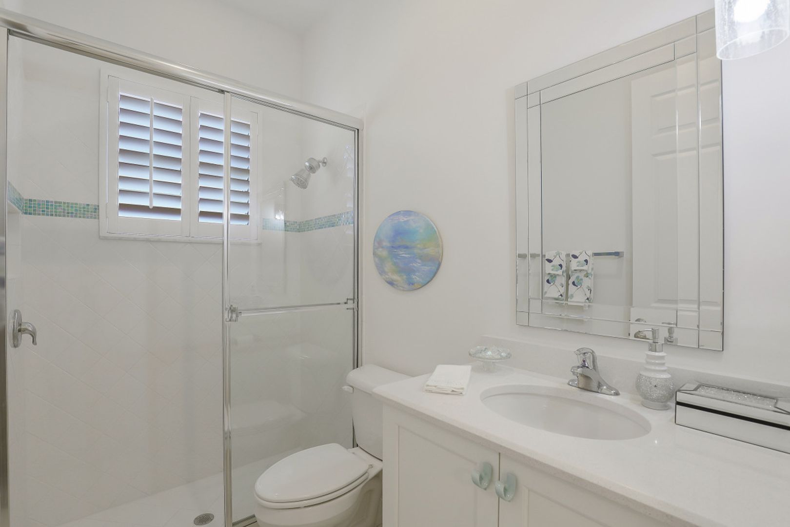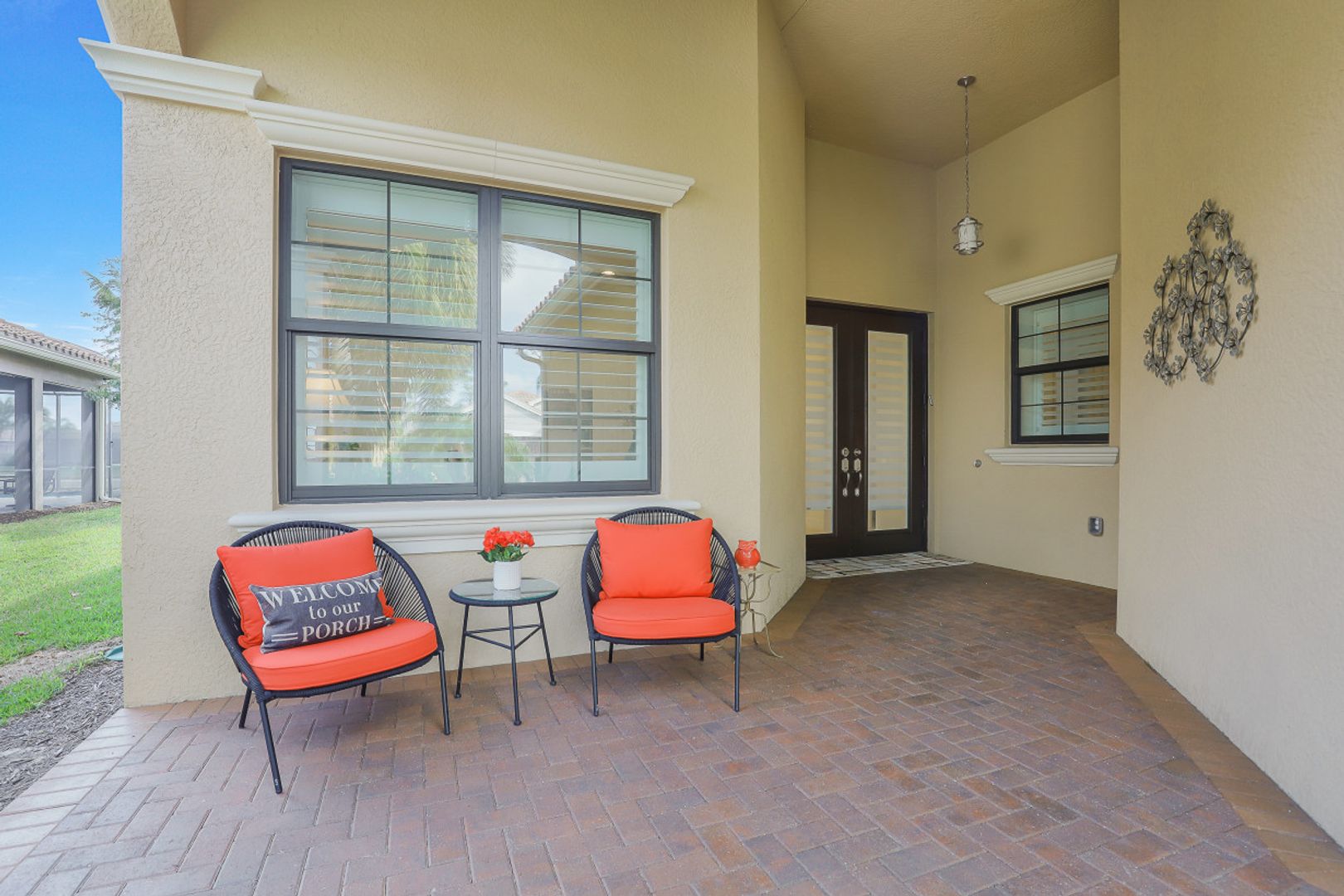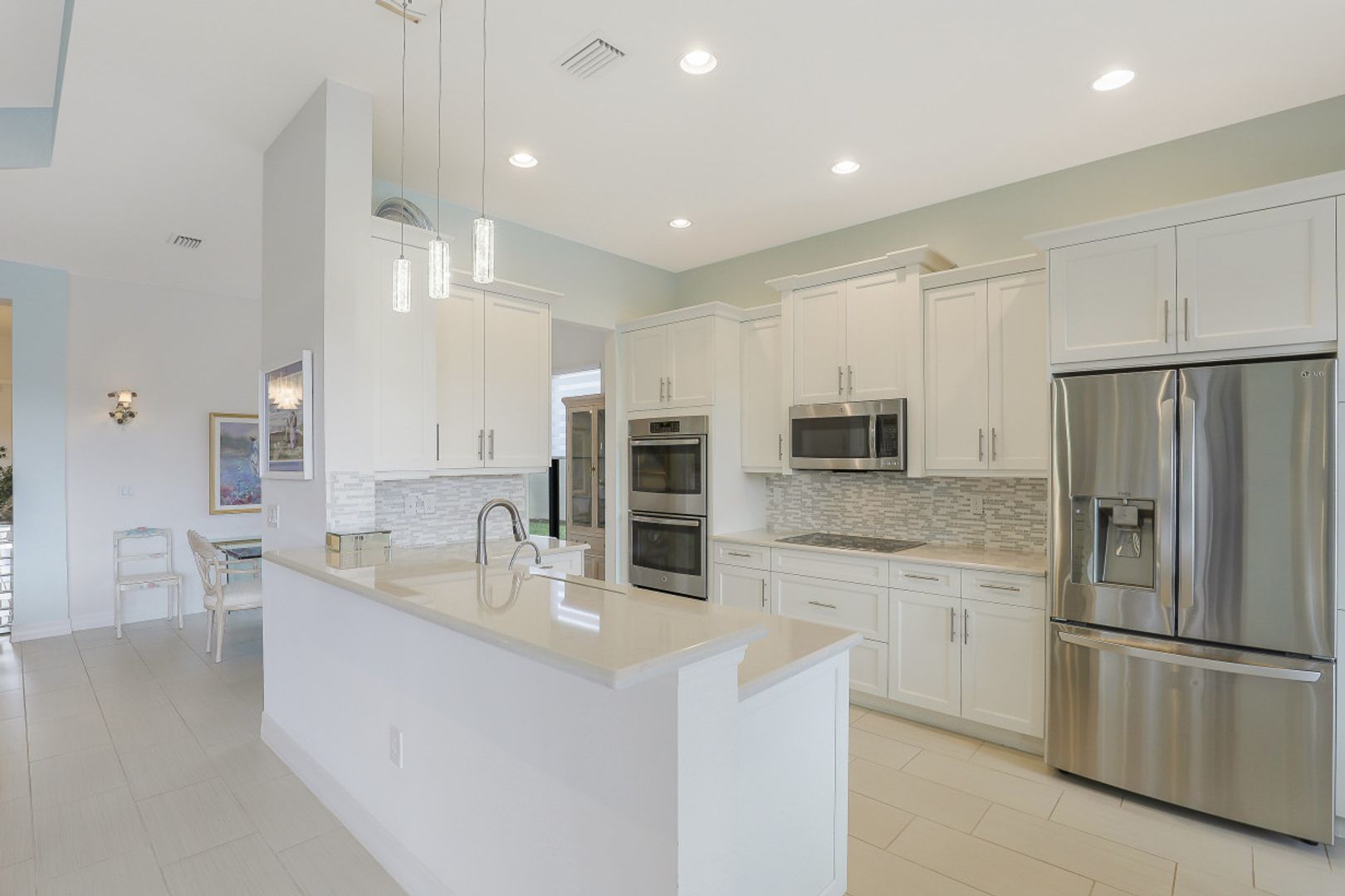 Welcome to this light & bright coastal inspired home where everyday living feels like a vacation. Savor your morning coffee in the large screened lanai watching the sunrise over the sparkling lake & spend the afternoon lounging in the sun after a refreshing dip in your pool. Upon entering the spacious foyer, you will be drawn to the contemporary, easy to care for 12x24 tile floor. There is a fantastic built-in in the great room that is just as beautiful as it is functional. The gourmet kitchen is the crown jewel of the home with Level IV white cabinets (many with pull-outs), cabinet lighting, upgraded appliances including electric cooktop & double oven, quartz counters & backsplash. Work from home is a breeze in the nice sized den. Move-in ready with custom closets throughout, garage storage, ceiling fans, upgraded lighting & window treatments in place. Easy storm prep with impact windows & doors on front & attached shutters on sides & rear. Riverstone offers a social, vacation-inspired lifestyle for all ages. Including fitness facilities, social hall, resort & lap pools, spa, 5 Har-Tru tennis courts, basketball & pickleball courts, tot lot, & full-time activities director.