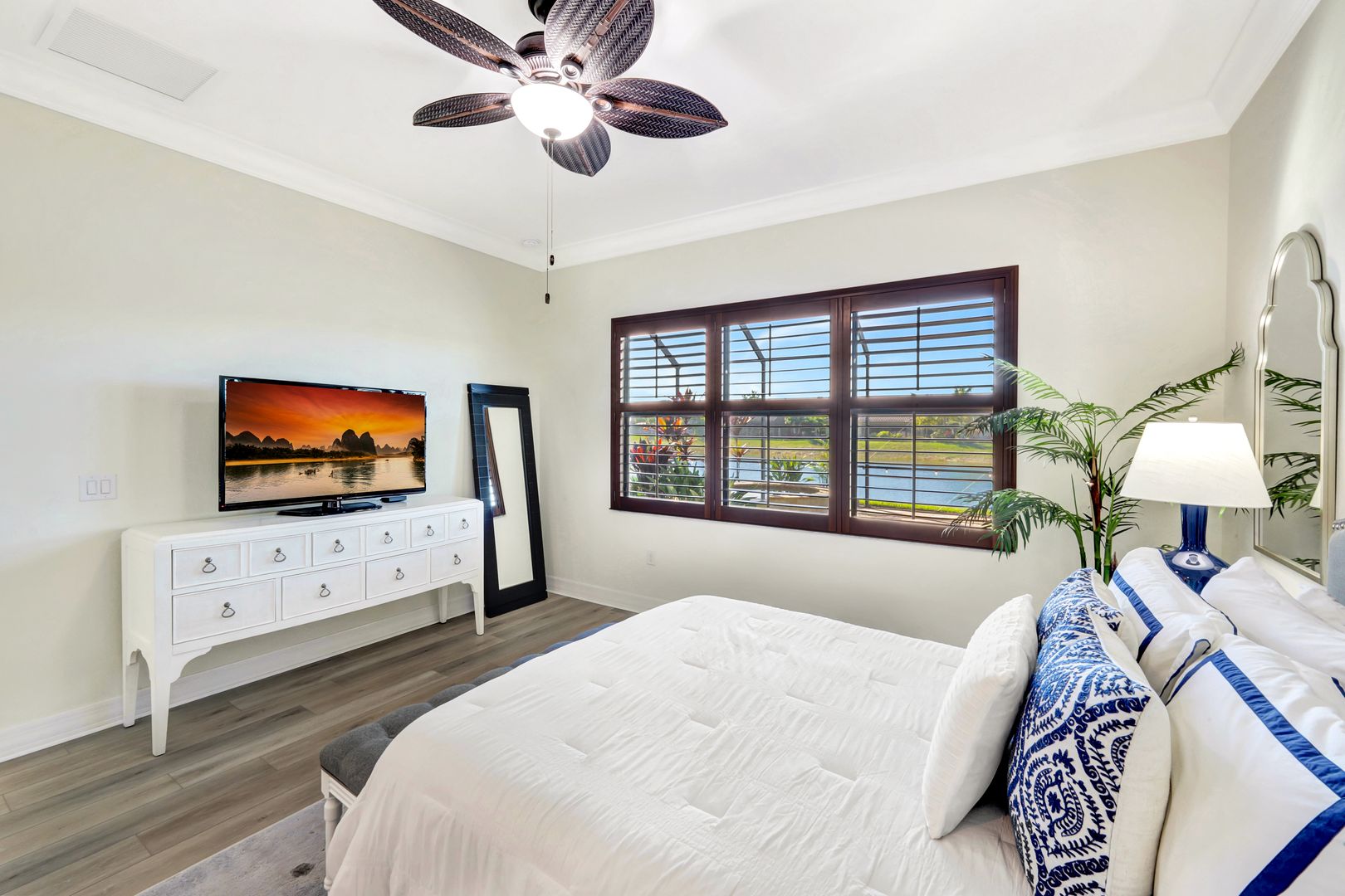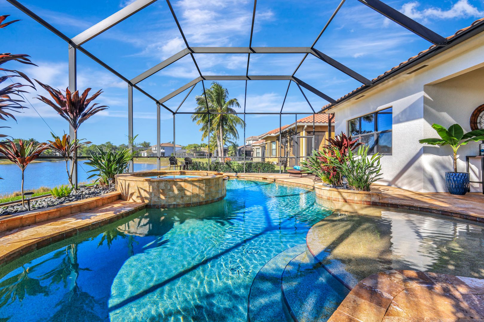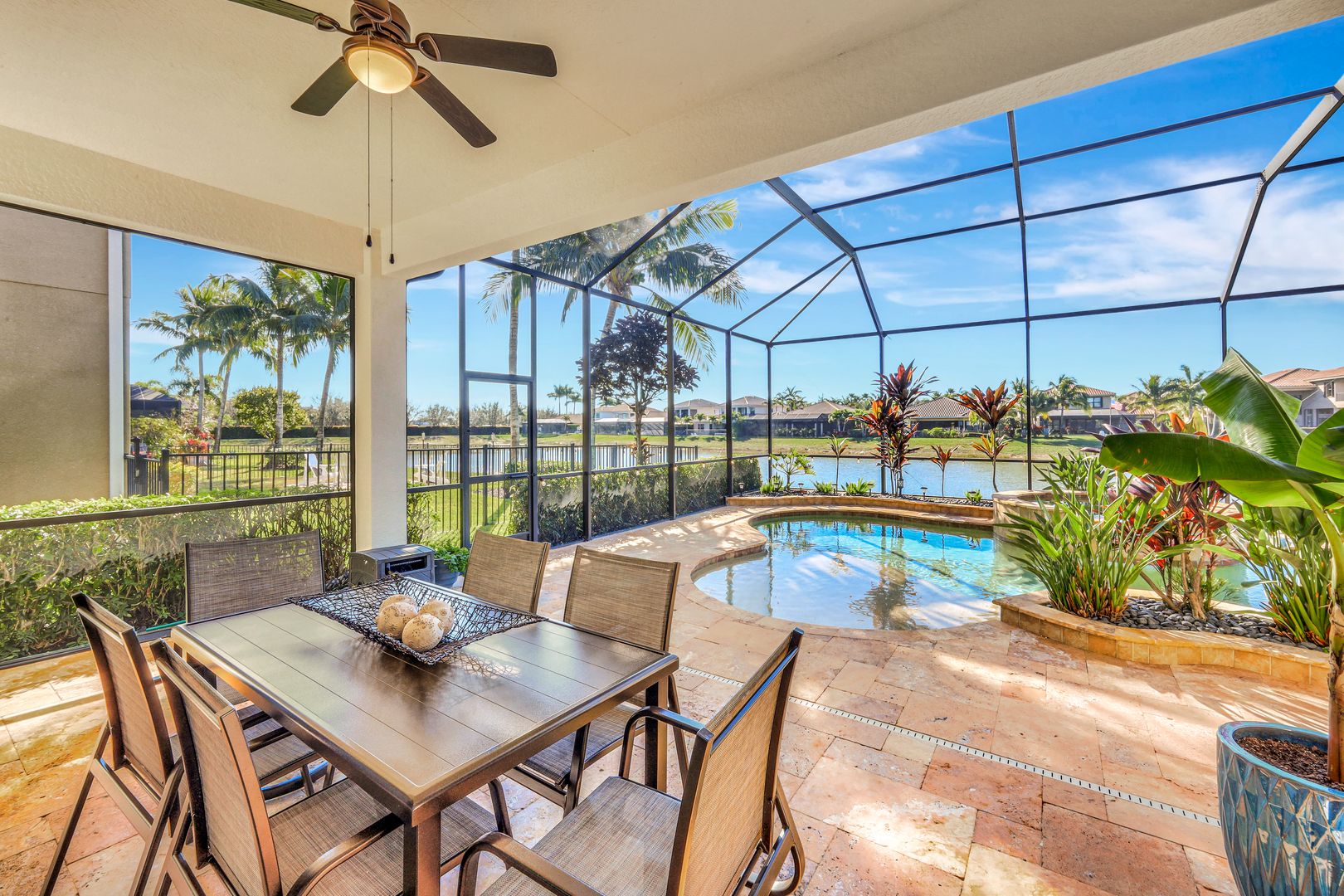 Paradise is calling. Live as though you are on vacation every day in this meticulously maintained, tastefully appointed residence designed to embrace the very best of the Naples lifestyle. Enjoy effortless outdoor living as you comfortably dine alfresco in the screened lanai enhanced by travertine pavers, cool off in your saltwater pool, or soak in the relaxing spa, all while enjoying a sunny southern lake view. Upon entry, the foyer’s soaring 13-foot coffered ceiling immediately draws your eye out to a sparkling water view. The Burgundy floor plan is perfect for entertaining allowing guests to mingle comfortably between the great room, dining room & open kitchen. The light-filled kitchen is truly the heart of the home, featuring stunning new quartz counters that continue up into backsplash, an oversized dining counter, newer dishwasher, new range, new deep sink, new faucet, wood cabinetry with updated hardware & ambient cabinet lighting. The serene primary suite overlooks the lake and offers dual custom finished walk-in closets & well-appointed bath with wood cabinets, new quartz counters and new sinks; echoing the kitchen finishes. Frameless glass shower door, framed mirrors and a soaking tub polish off this calming space. A privately positioned second bedroom includes a custom closet and is adjacent to a full bath updated with new quartz countertops, new sink, and framed mirror. The third bedroom is great for guests or easily functions as a cozy den. Impressive interior details include plantation shutters, decorator lighting and fans, a built-in linen cabinet, decorative glass at the entry door, porcelain tile set on the diagonal, a wood-framed slider, crown molding, and new luxury vinyl plank flooring in the bedrooms. Recent improvements also include fresh exterior paint, built-in shelving and a barn door added to the third bedroom closet, and a new HVAC system to ensure year-round comfort. Finished laundry includes pedestaled washer & dryer, upper & lower cabinetry with folding counter & oversized storage closet. Seller is licensed broker. Located in Riverstone offering a vibrant, vacation-inspired lifestyle for all ages. The community features a fitness center, social hall, resort-style pool, lap pool, spa, five lighted tennis courts, outdoor basketball and pickleball, a full indoor basketball court, tot lot, children’s water play area, game room, and an activities coordinator; making it easy to meet new friends. The North Naples location is just minutes from I-75, with convenient proximity to fabulous beaches, dining, golf and shopping. This is more than a home—it is an invitation to slow down, savor the sunshine, and start living the Naples lifestyle you have been waiting for.