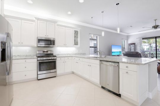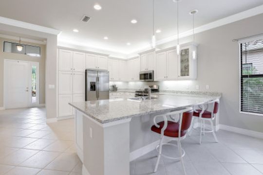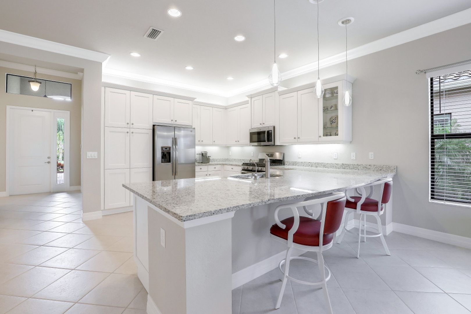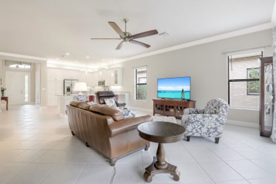 Embrace the best of SWFL in this light, bright & carefree home in the resort community you've been dreaming of. Open Burgundy floor plan features covered entry, welcoming foyer & easy-to-maintain tile flooring throughout. Contemporary kitchen has white cabinets, ambient lighting & oversized dining counter connecting to the light-filled great room & elegant dining room…a fabulous flow for entertaining. Primary suite looks out over the lawn & sparkling lake & has 2 walk-in closets. Large den makes a great office but can be converted to 3rd bedroom. Laundry is easy in a room this big including w/d, sink, upper/lower cabinets & oversized storage closet. Out back you will find a screened covered patio, fenced dog run & plenty of additional space to create your own tropical outdoor oasis. Recent improvements include added landscaping, whole home generator, water softener, reverse osmosis at kitchen sink, fans & light fixtures. Stonecreek located in N. Naples, zoned for "A" rated schools & offers a social, vacation-inspired lifestyle. Including fitness, social hall, resort & lap pools, spa, splash pad, 5 clay tennis courts, basketball & 4 pickleball courts, beach volleyball & tot lot.
