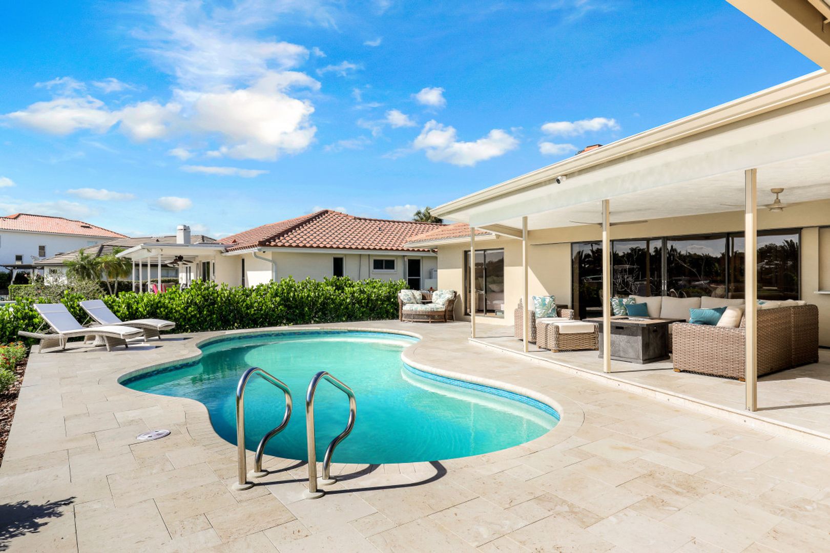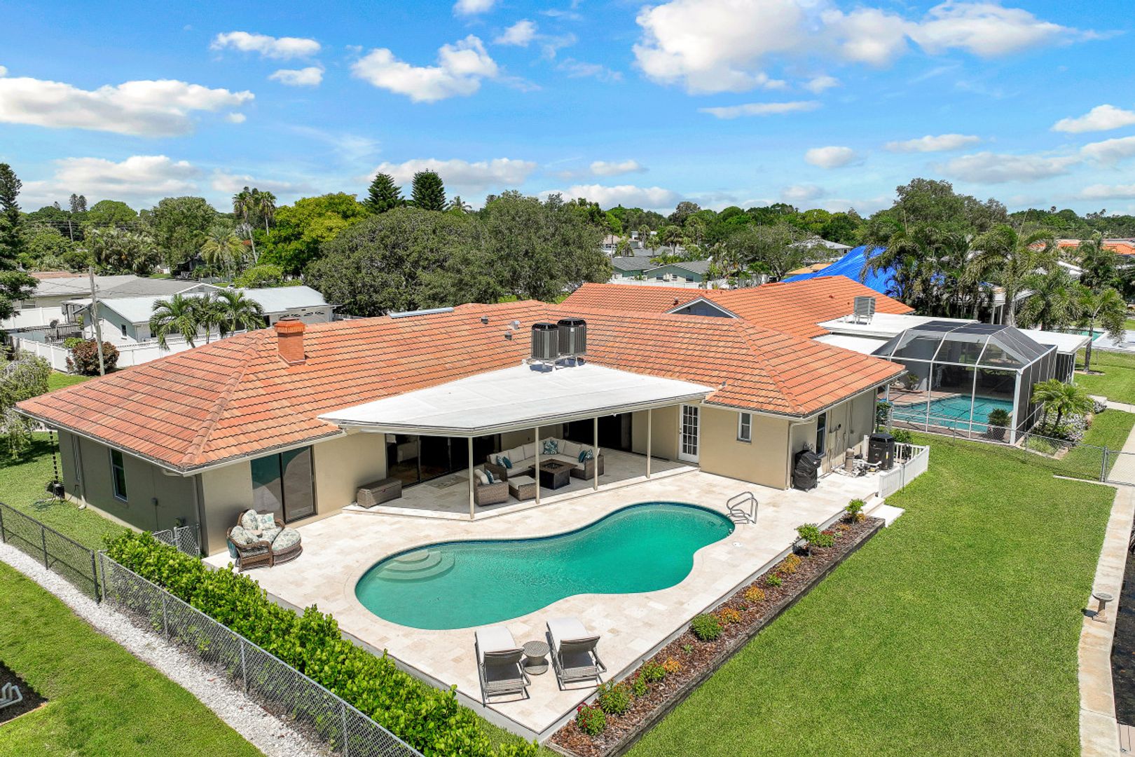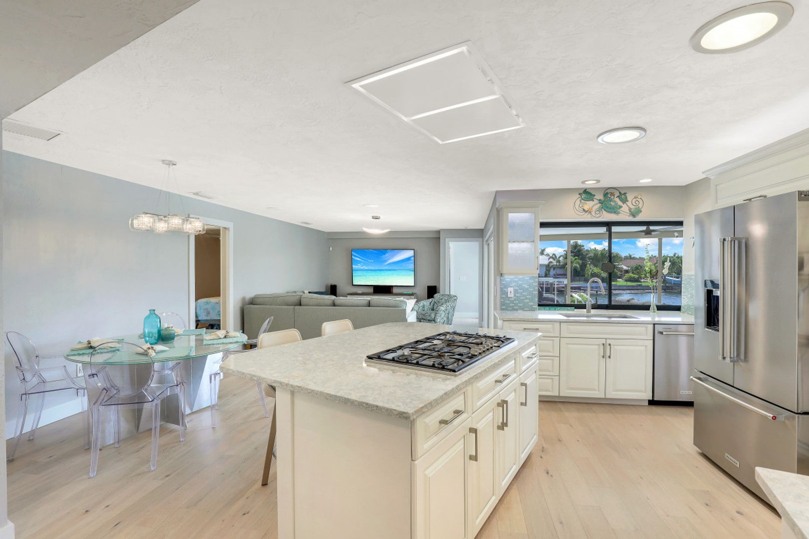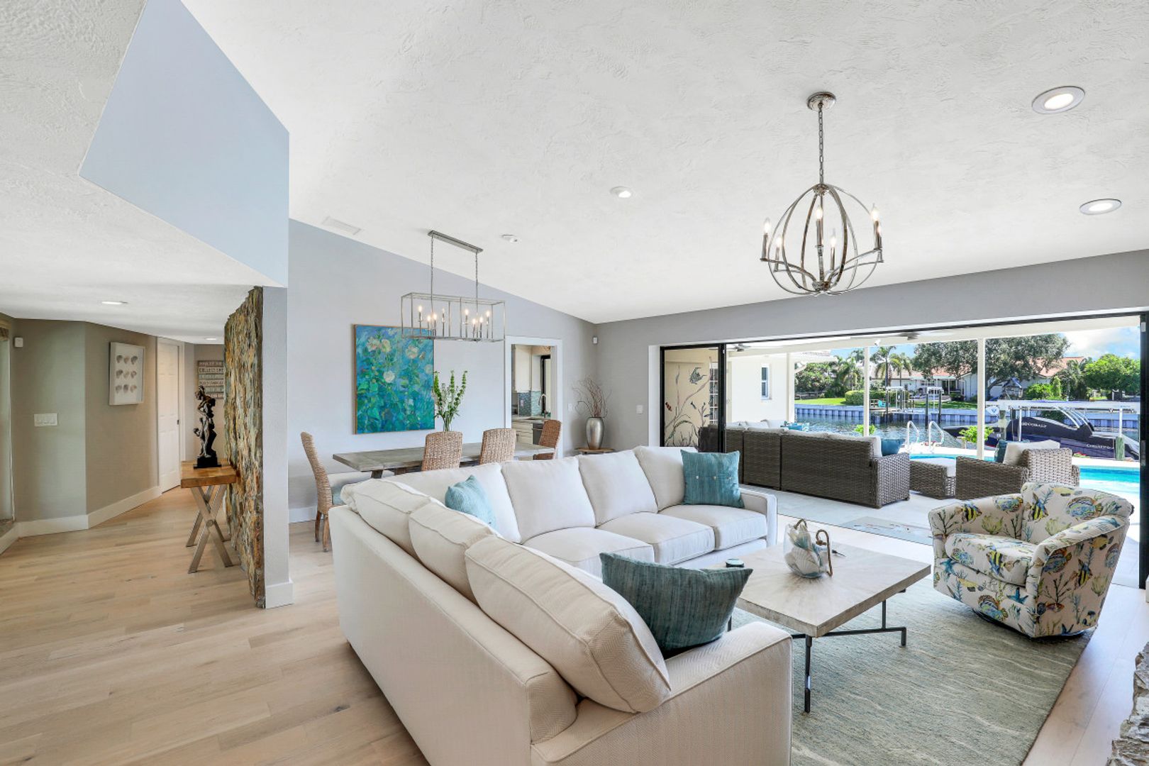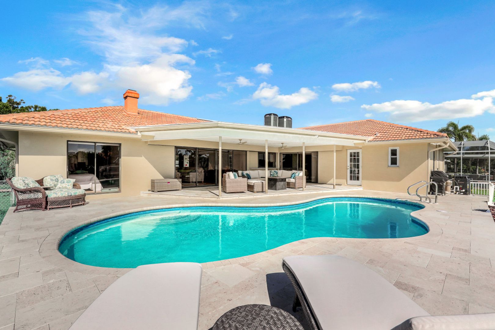 Stunning 4 bedroom 3 bath home remodeled in 2021 and situated on a beautifully landscaped ¼ acre, elevated waterfront lot in Venetian Isles. You’ll love the floor plan that is bright and open with white oak hardwood floors and tile throughout allowing expansive water views from inside the home. Gourmet kitchen with island, featuring stainless appliances, Thermador natural gas cooktop, quartz countertops and decorative glass tile backsplash overlooking the family room. The living room features a vaulted ceiling and stone fireplace framed by custom bookcases and bench seating. All hurricane impact windows (2019) and Category 5 Astro Guard fabric for lanai sliders (2021). Oversized grandfathered boat dock boasts a smart design and catwalk providing access to both sides of your boat. Seawall was replaced in 2016, the dock in 2017 and the 10,000 lb lift in 2021. 8’ deep heated free form pool, updated this summer with pebble interior, glass tile and stunning travertine shell stone pavers added around pool and in lanai. All systems in the home were updated in 2021 including HVAC, plumbing, electrical and natural gas. Navian tankless hot water, water and air purification systems. New irrigation system, Citrablue grass and professionally designed and installed landscape lighting. The front and backyard gardens feature butterfly attracting plants and flowering trees that lure many butterflies. Venetian Isles is a deed restricted community with friendly, social residents and 100’s of golf carts. Assumable flood insurance policy ($1,033) and 2022 4 point inspection available.