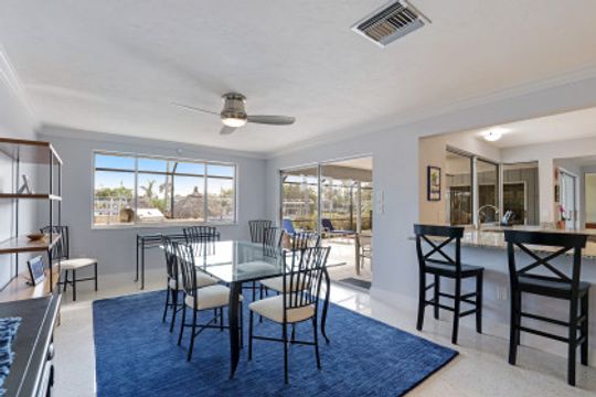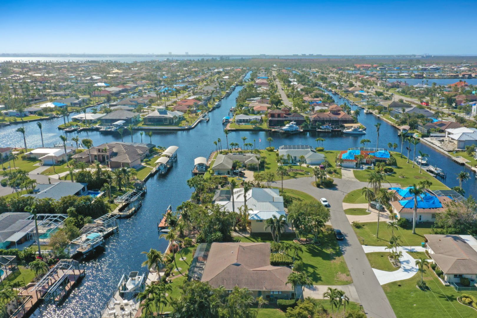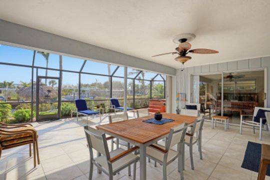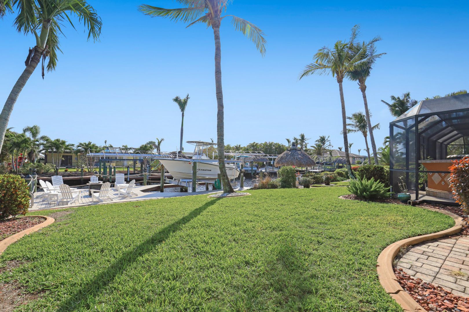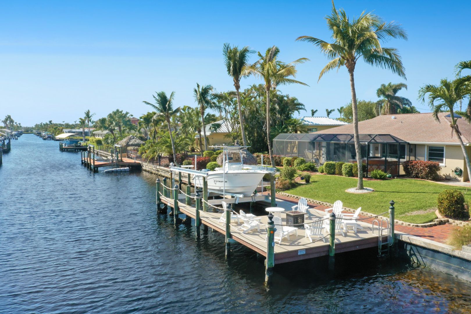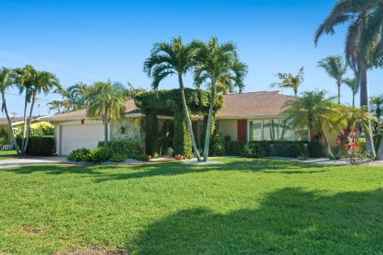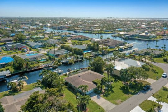 SAILBOAT ACCESS on a TRIPLE LOT- just MINUTES to open water! COMPLETELY REMODELED, MOVE IN READY & partially furnished w/3BR, 2BA & 2 CAR garage w/over 2,200 Sqft of living. Beautifully updated & meticulously maintained. Updates include: Brand new AC, brand new hot water heater, terrazzo flooring, crown molding, plantation shutters, updated fixtures, BRAND NEW solid wood doors, new refrigerator & new dryer. Unique style kitchen overlooking amazing water views! Kitchen also features granite countertops, SS appliances, new dishwasher, new refrigerator & window passthrough. Owner's suite includes: sliders to the outdoor living, completely remodeled bathroom w/dual sinks, custom mirrors & decorative tiled shower. This home comes complete w/10/16K lb BRAND NEW boat lift, captains walk & HD COMPOSITE DOCK w/Trek Dock furniture & ALL outdoor furniture is included. The outdoor area was DESIGNED to entertain w/a fire pit table on the dock & a plethora of seating, tiki hut, fish cleaning station, outdoor kitchen, screened in lanai & above ground spa! Located in SW Cape, close to Cape Harbour, Tarpon Point Marina, Rotary Park, dining, shopping & MORE!