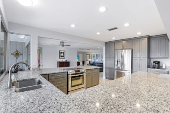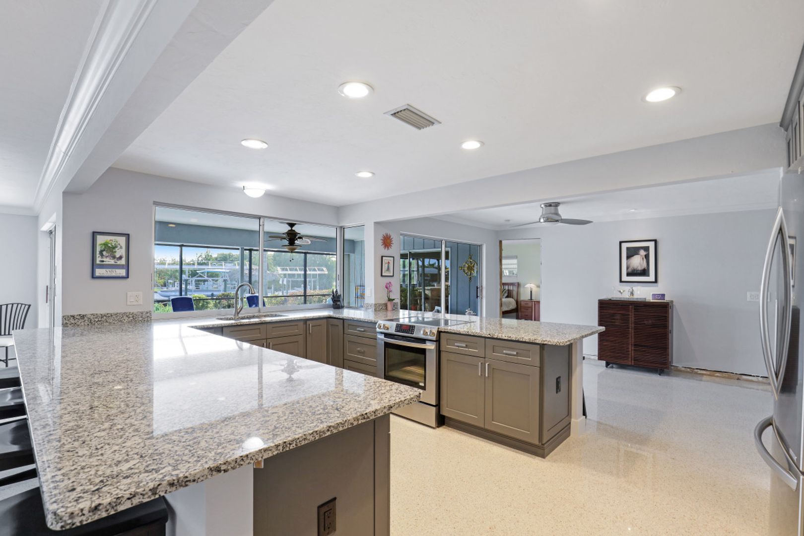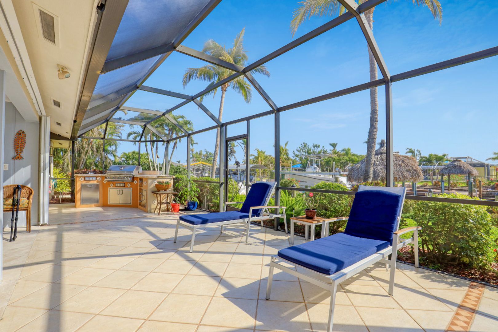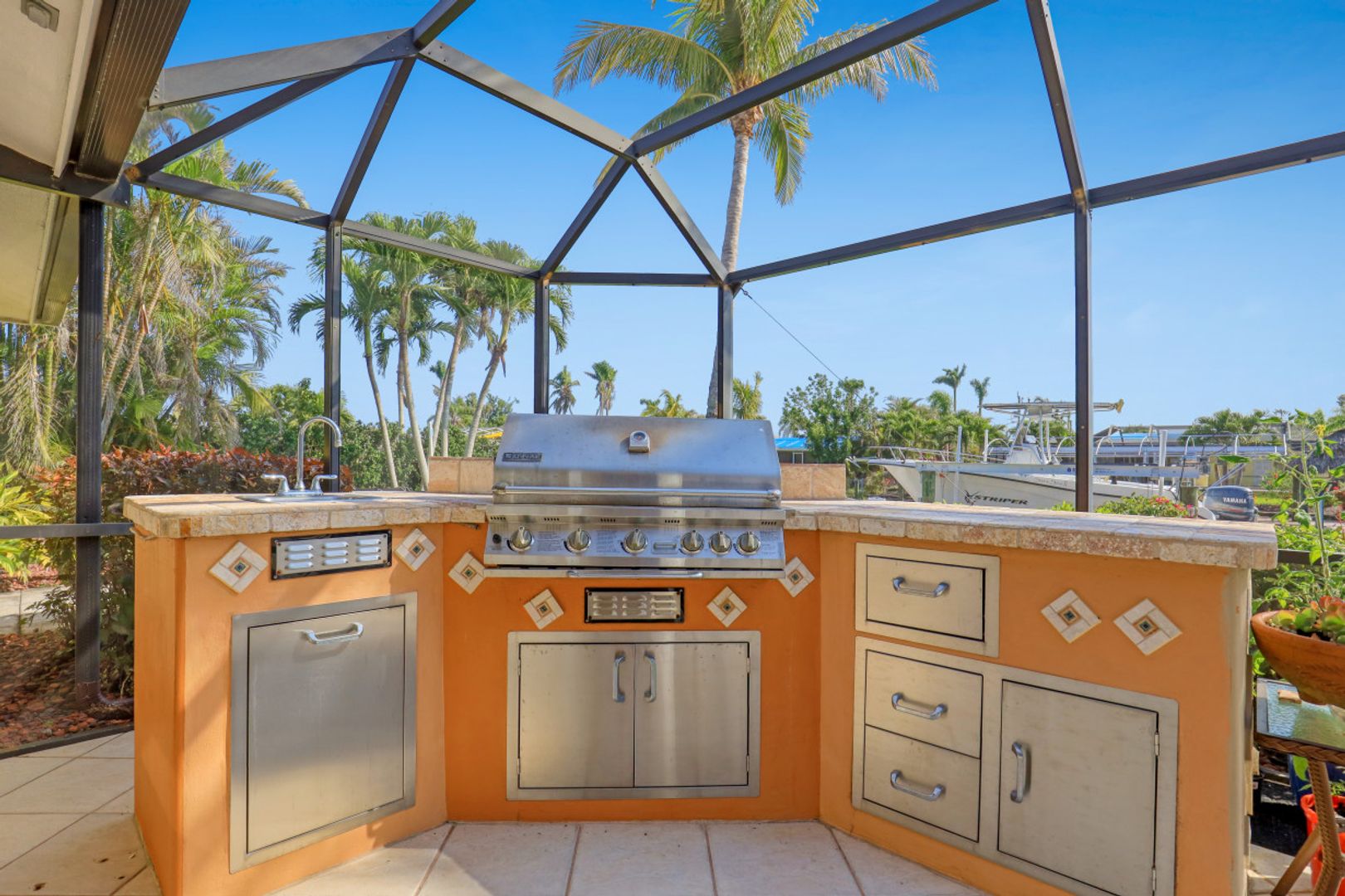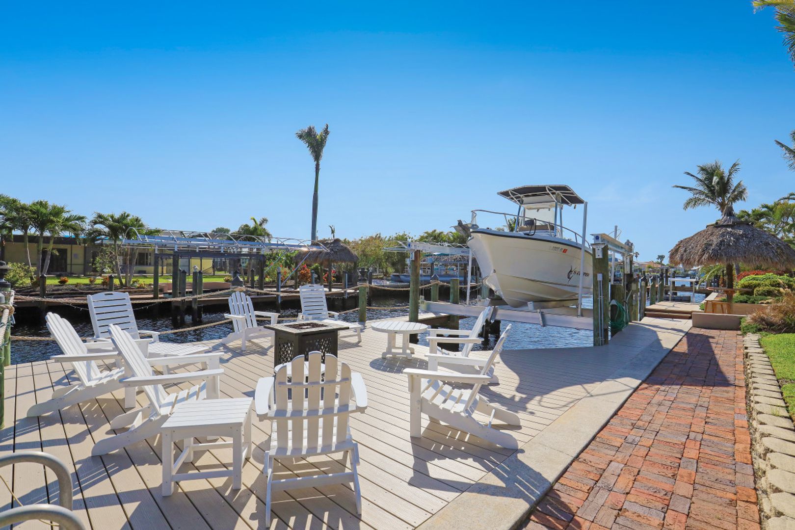 SAILBOAT ACCESS on a TRIPLE LOT- just MINUTES to open water! COMPLETELY REMODELED, MOVE IN READY & partially furnished w/3BR, 2BA & 2 CAR garage w/over 2,200 Sqft of living. Beautifully updated & meticulously maintained. Updates include: Brand new AC, brand new hot water heater, terrazzo flooring, crown molding, plantation shutters, updated fixtures, BRAND NEW solid wood doors, new refrigerator & new dryer. Unique style kitchen overlooking amazing water views! Kitchen also features granite countertops, SS appliances, new dishwasher, new refrigerator & window passthrough. Owner's suite includes: sliders to the outdoor living, completely remodeled bathroom w/dual sinks, custom mirrors & decorative tiled shower. This home comes complete w/10/16K lb BRAND NEW boat lift, captains walk & HD COMPOSITE DOCK w/Trek Dock furniture & ALL outdoor furniture is included. The outdoor area was DESIGNED to entertain w/a fire pit table on the dock & a plethora of seating, tiki hut, fish cleaning station, outdoor kitchen, screened in lanai & above ground spa! Located in SW Cape, close to Cape Harbour, Tarpon Point Marina, Rotary Park, dining, shopping & MORE!