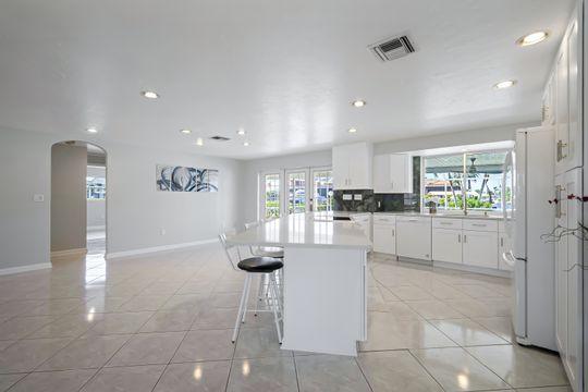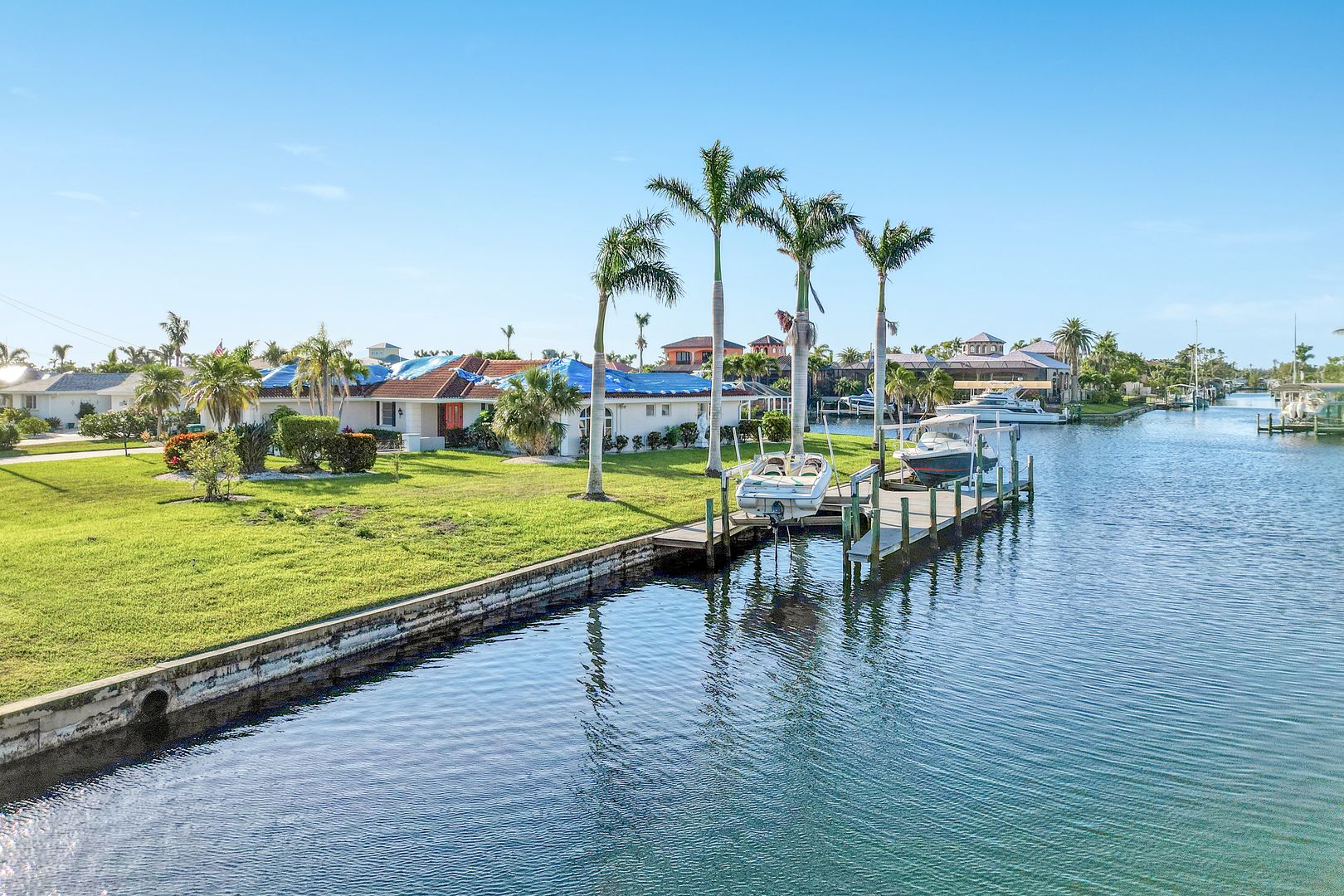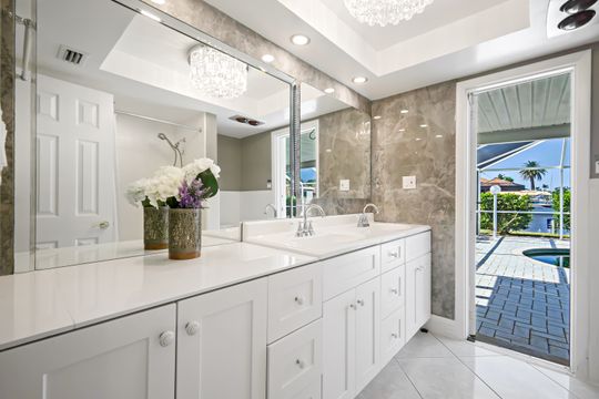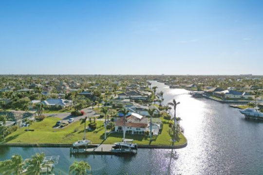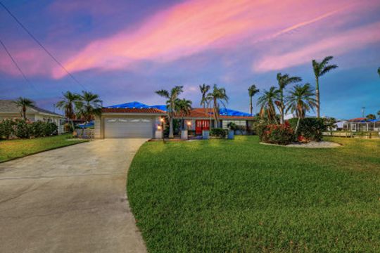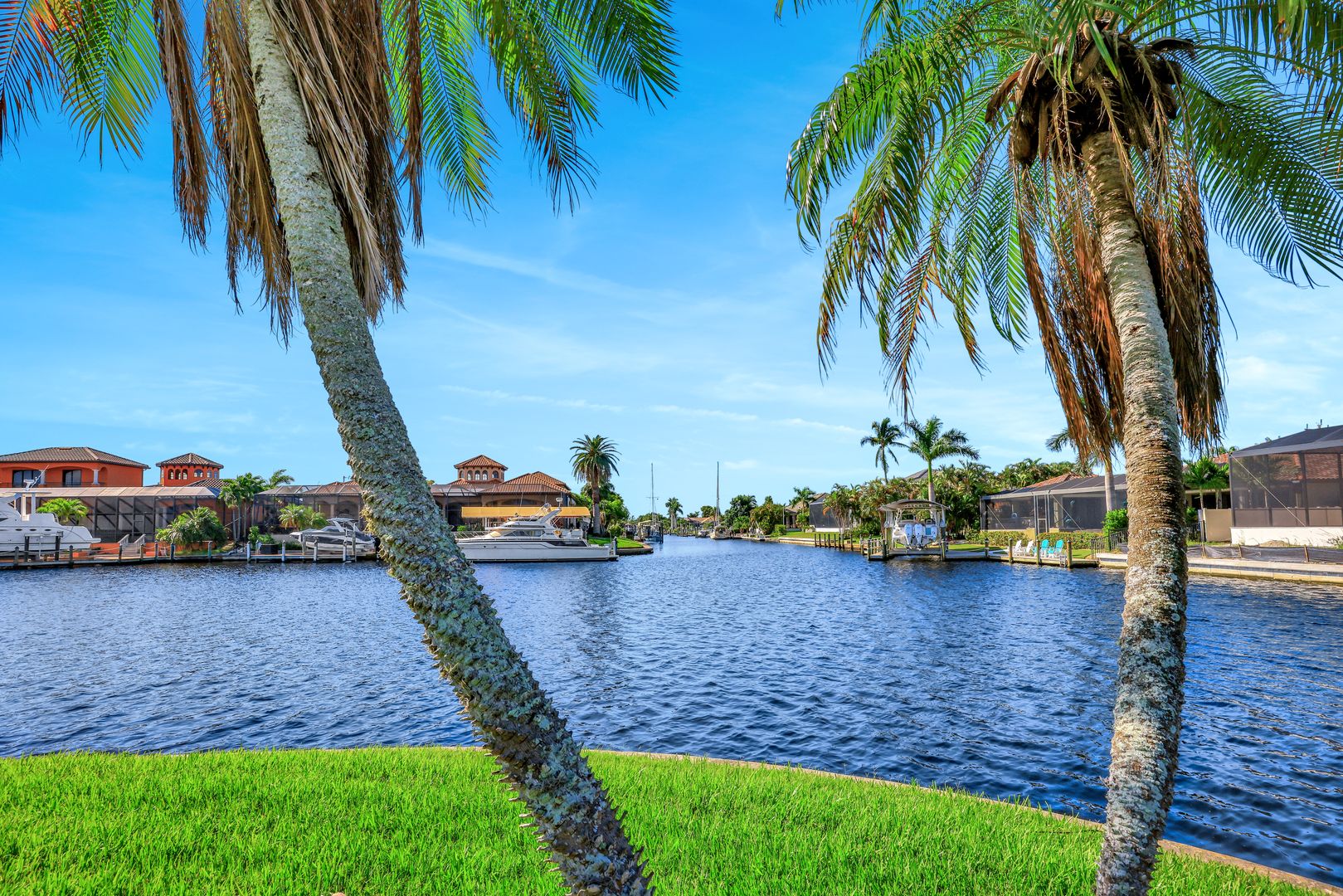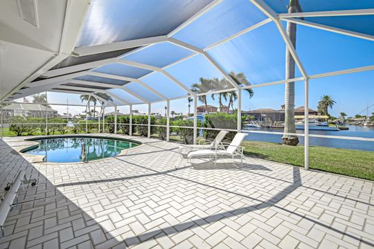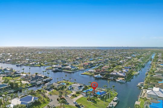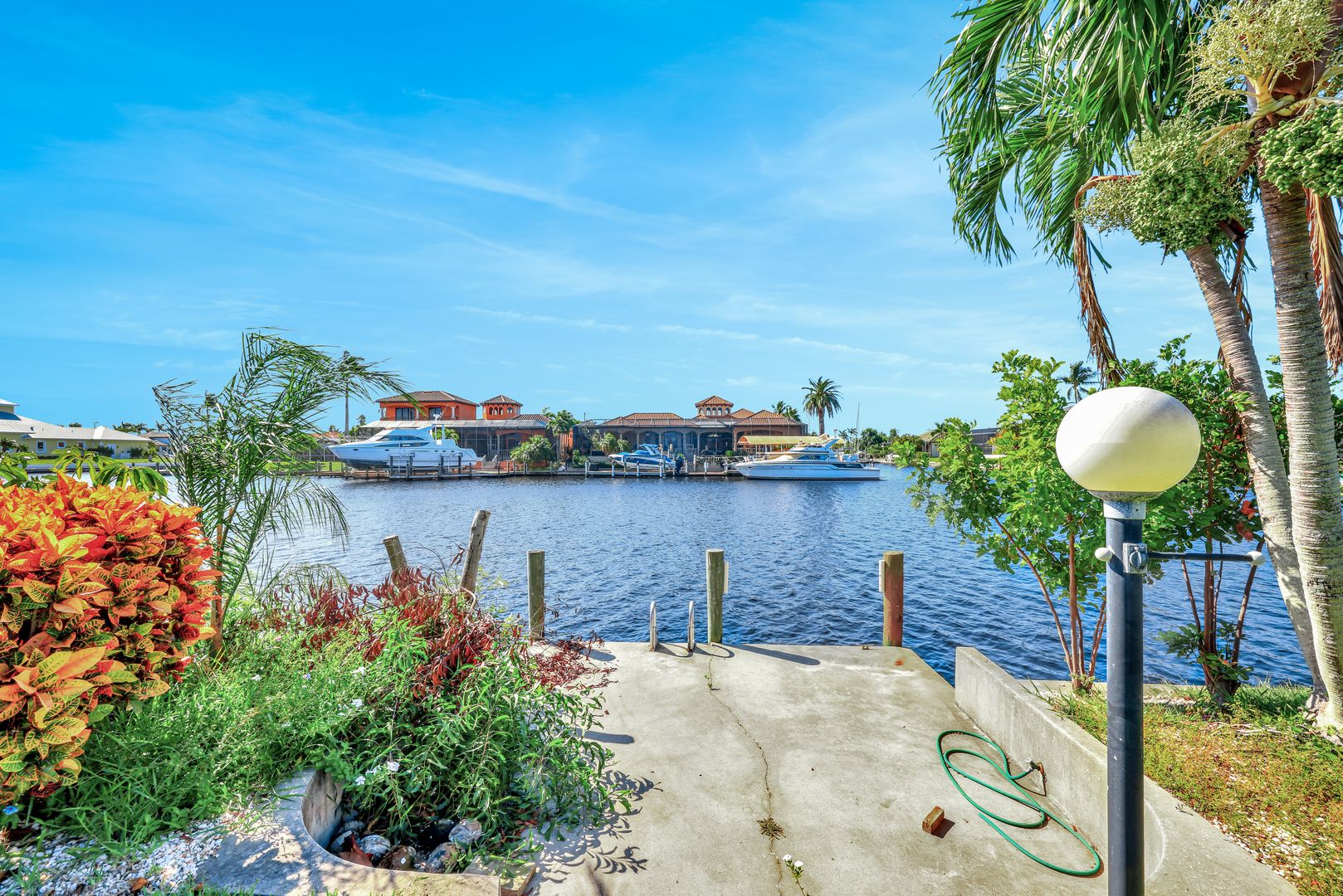 Welcome home to your private waterfront oasis with direct Gulf access—NO BRIDGES! This newly updated pool home is situated on a rarely available triple corner lot at the end of a quiet street in one of the most desirable neighborhoods of Cape Coral. With expansive water views along the 190 foot wide San Jose intersecting canal, you’ll enjoy stunning sunrises and sunsets poolside on your pavered lanai with newly screened pool cage. Ample room under truss allows for year-round outdoor living that can accommodate a lounge area and dining space. Inside the home you’ll enjoy a bright and open floorplan featuring Italian porcelain tile, new light fixtures, recessed lighting, and a freshly painted interior. The newly remodeled kitchen is open to the living space and features quartz countertops, hardwood cabinetry with dovetail construction, and Spanish-style backsplash. The owner’s suite features a private entrance to the pool area, new bathroom vanity with quartz counters, and vented fogless backlit mirror. The split floorplan allows privacy for both guests and owners. The guest bath features a fogless backlit mirror, recessed lighting, and also doubles as a pool bath with access to the lanai. Don’t forget to bring your boats! The nearly 300 feet of seawall includes both a concrete dock on the Southern side and a composite wood dock along the Western side with two boat lifts (10k lb and 20k lb). Boaters will appreciate the quick 10 minute ride to the river and 30 minutes to Fort Myers beach and surrounding islands. The new chestnut brown barrel tile roof is scheduled to be installed in early June. Don’t miss out on your opportunity to live the Florida dream—schedule your private tour today!