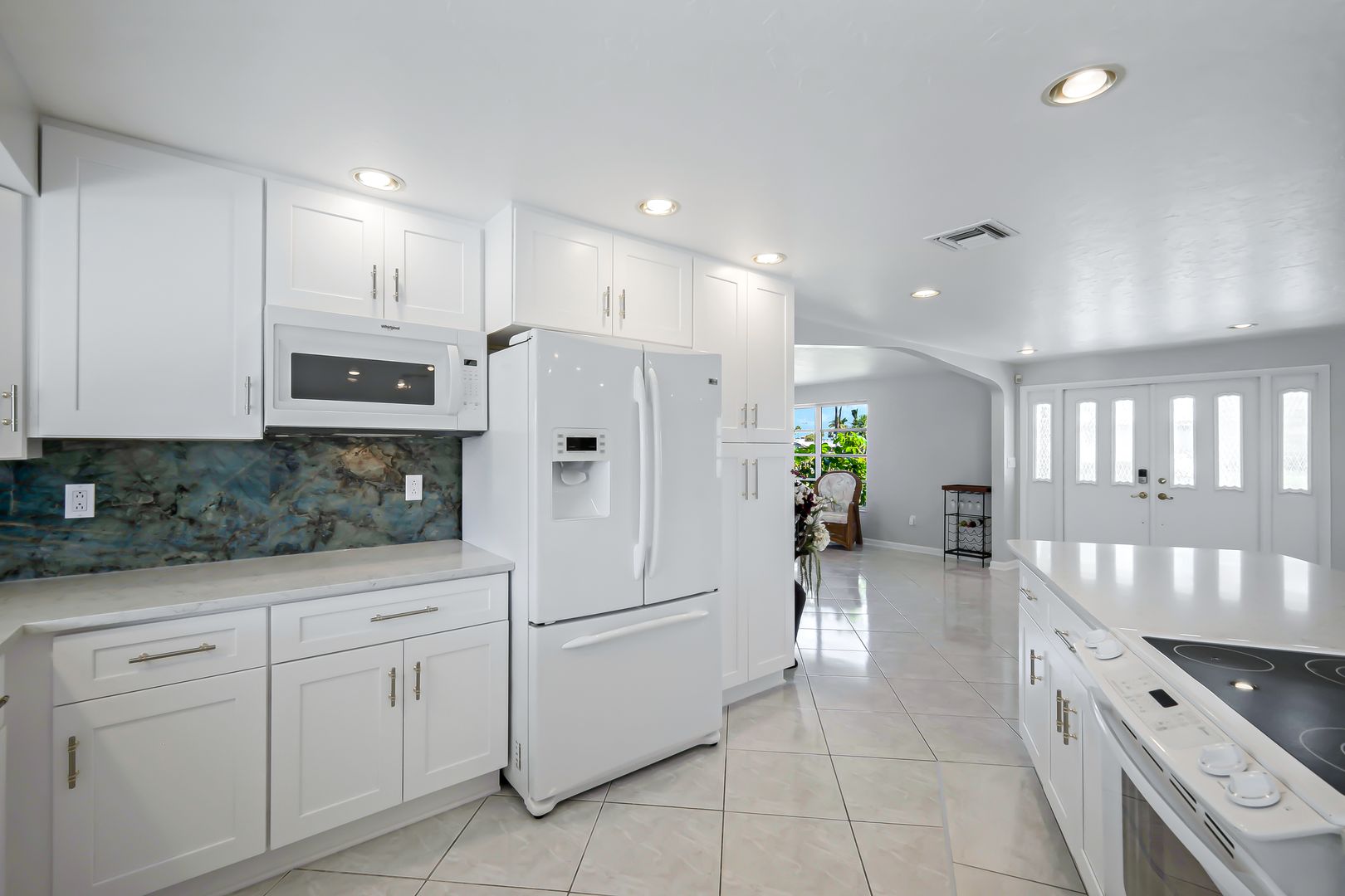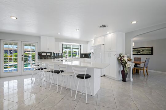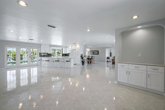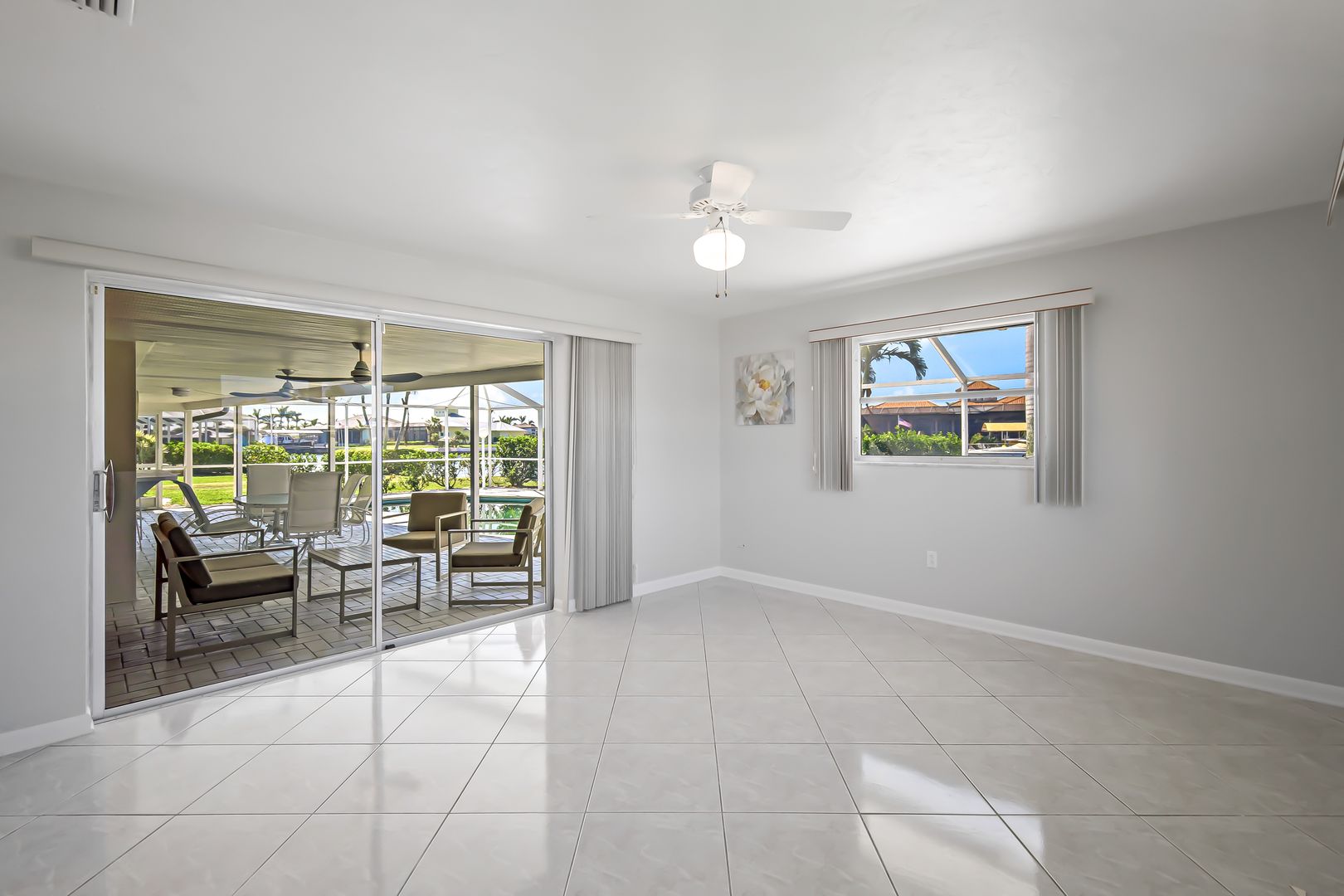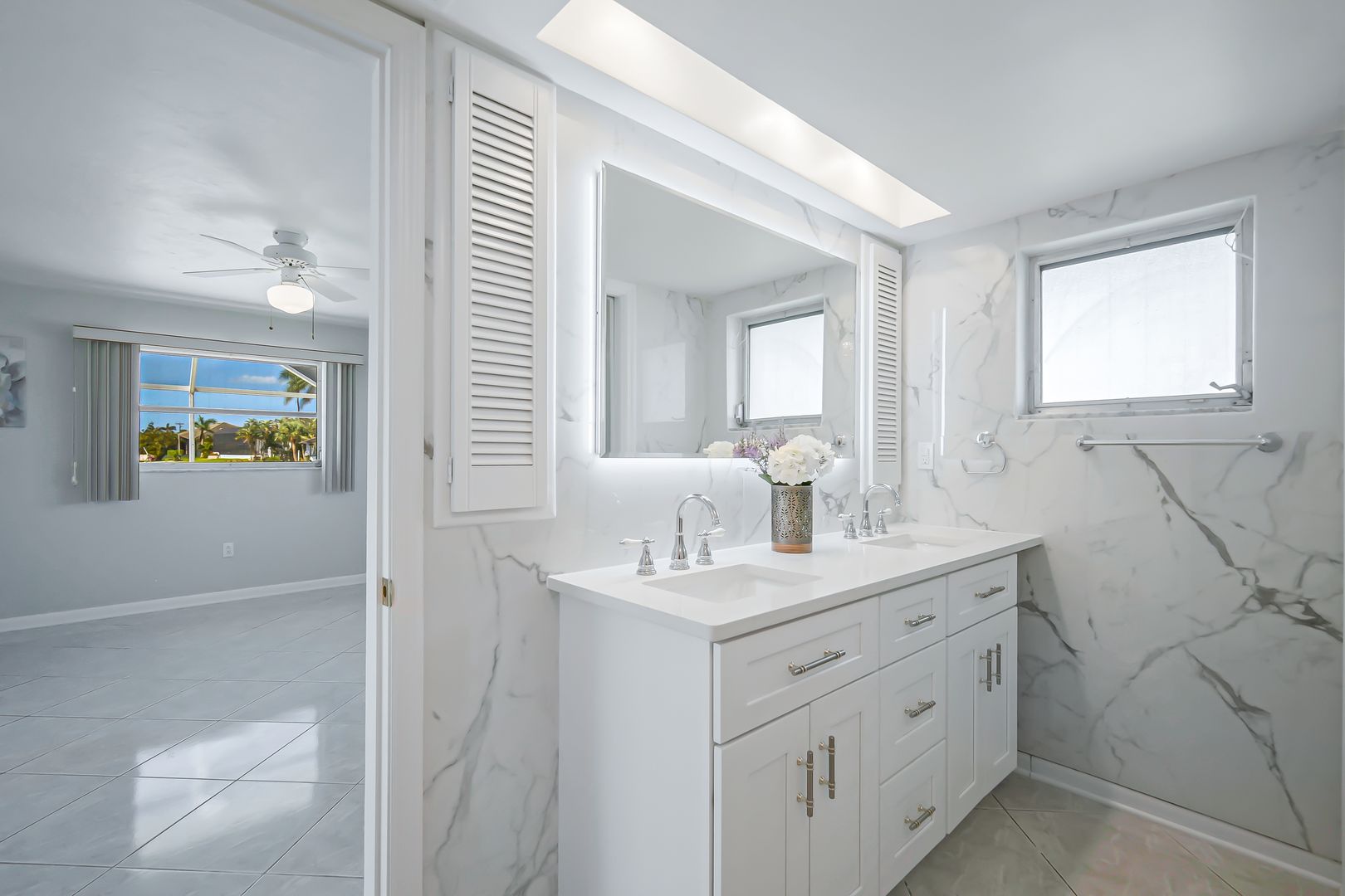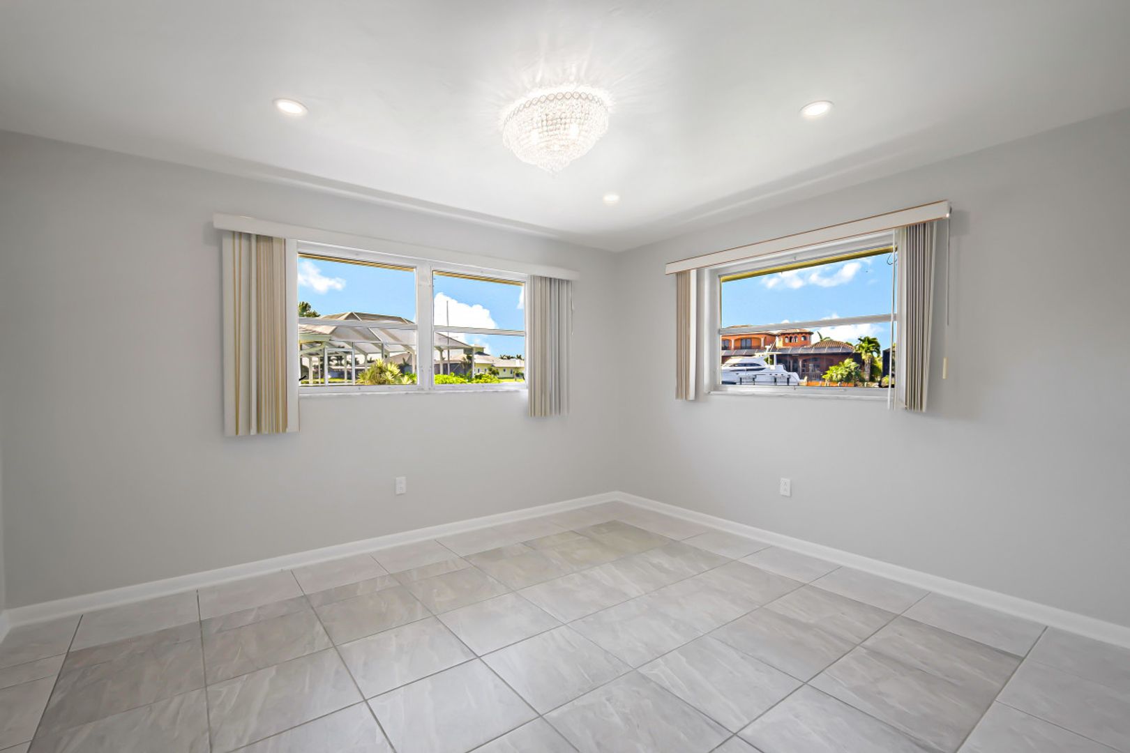Welcome home to your private waterfront oasis with direct Gulf access—NO BRIDGES! This newly updated pool home is situated on a rarely available triple corner lot at the end of a quiet street in one of the most desirable neighborhoods of Cape Coral. With expansive water views along the 190 foot wide San Jose intersecting canal, you’ll enjoy stunning sunrises and sunsets poolside on your pavered lanai with newly screened pool cage. Ample room under truss allows for year-round outdoor living that can accommodate a lounge area and dining space. Inside the home you’ll enjoy a bright and open floorplan featuring Italian porcelain tile, new light fixtures, recessed lighting, and a freshly painted interior. The newly remodeled kitchen is open to the living space and features quartz countertops, hardwood cabinetry with dovetail construction, and Spanish-style backsplash. The owner’s suite features a private entrance to the pool area, new bathroom vanity with quartz counters, and vented fogless backlit mirror. The split floorplan allows privacy for both guests and owners. The guest bath features a fogless backlit mirror, recessed lighting, and also doubles as a pool bath with access to the lanai. Don’t forget to bring your boats! The nearly 300 feet of seawall includes both a concrete dock on the Southern side and a composite wood dock along the Western side with two boat lifts (10k lb and 20k lb). Boaters will appreciate the quick 10 minute ride to the river and 30 minutes to Fort Myers beach and surrounding islands. The new chestnut brown barrel tile roof is scheduled to be installed in early June. Don’t miss out on your opportunity to live the Florida dream—schedule your private tour today!