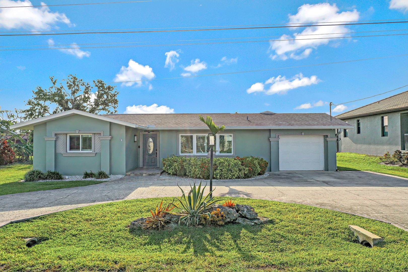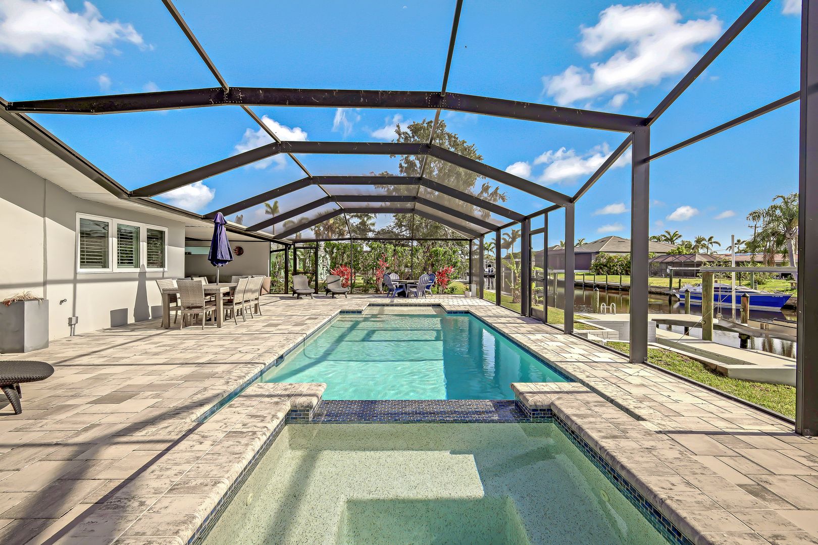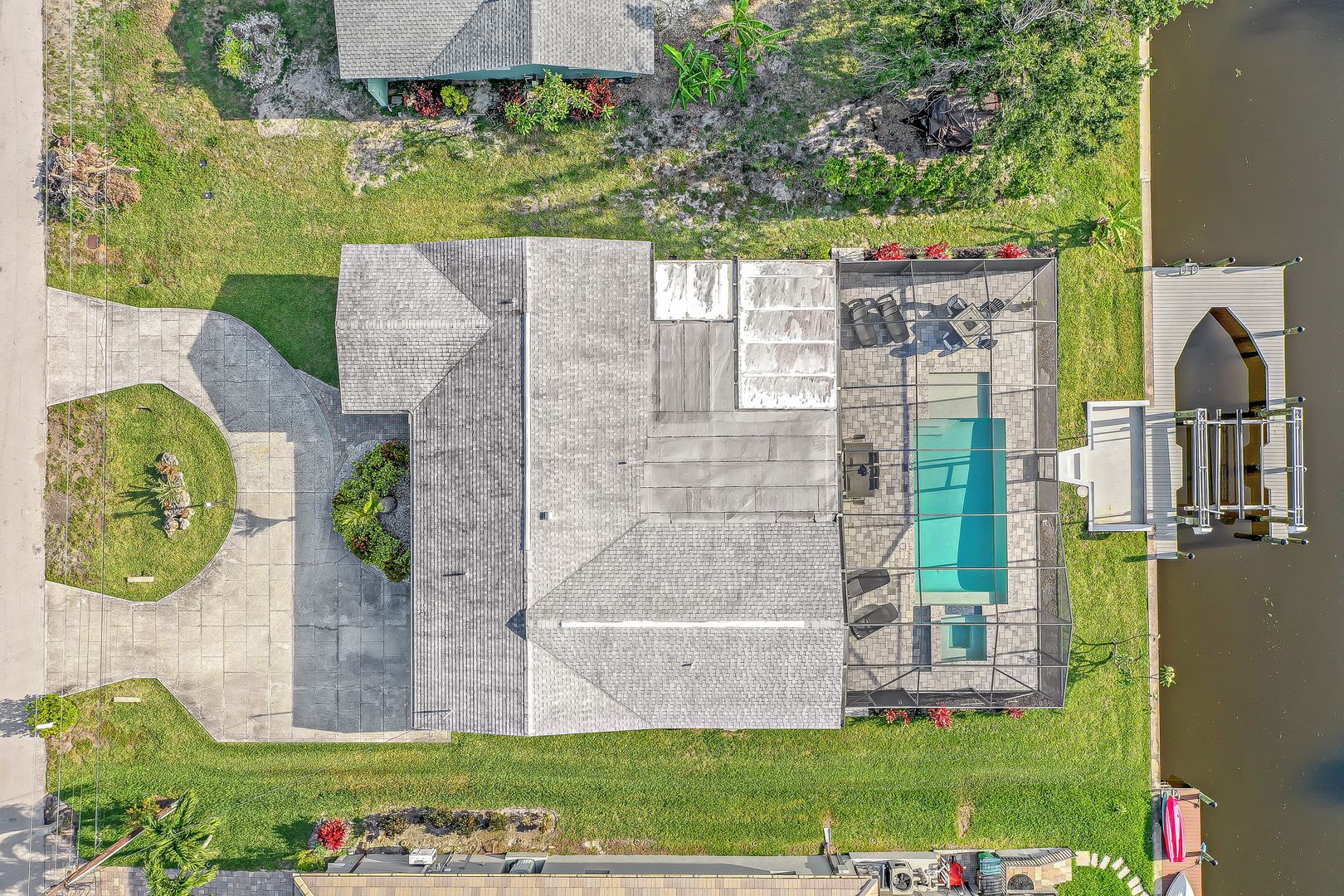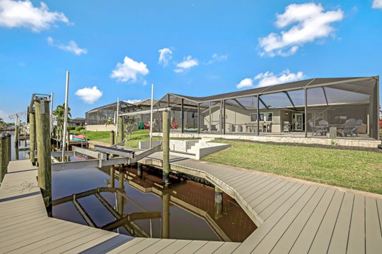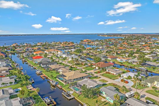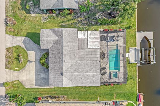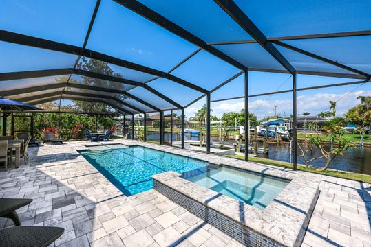 UNIQUE OPPORTUNITY FEATURES DIRECT SAILBOAT ACCESS 5 MINUTES FROM THE CALOOSAHATCHEE RIVER AND THE GULF OF MEXICO LOCATED IN THE EXCLUSIVE YACHT CLUB NEIGHBORHOOD. As soon as you pull into the circle drive you are greeted by this inviting open floor plan and you'll know this is the right place to call home! You'll enjoy this resort-style living with this beautiful, fabulously, updated split floor plan with 3 bedrooms, and 2 1/2 baths featuring the open great room giving you a spacious feel. Many updates with solid wood cabinetry, beautiful granite, sensor faucet, tiled backsplash, and pendant lighting. Once outside, you'll appreciate the elegant heated saltwater spa (2018) flowing into the pool you always dreamed of owning featuring a relaxing sun ledge, lanai, and specious paver pool deck. Boaters will enjoy this 10,000# boat lift (2020) with a composite captain's walk. Many other updates including the owner's suite remodel with a shiplap ceiling that walks out to the pool area. This home was properly remediated after the hurricane with all cabinetry, counters, and appliances saved! Just needs the lower walls and some flooring replaced and the cabinetry reinstalled!!! This is one of the most desirable areas in Cape Coral. Come see this piece of paradise today and start living the Florida Dream!