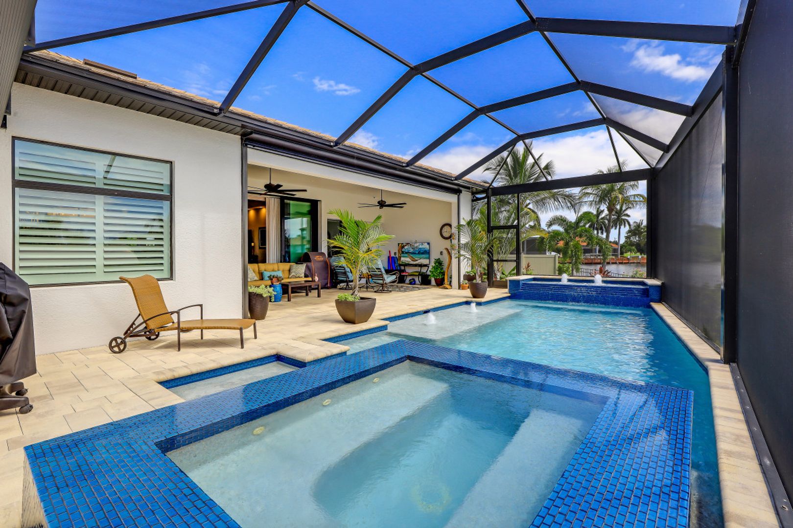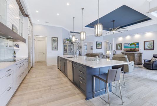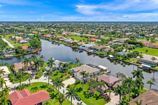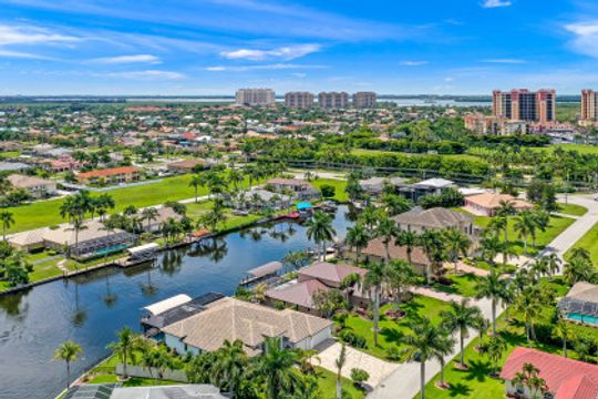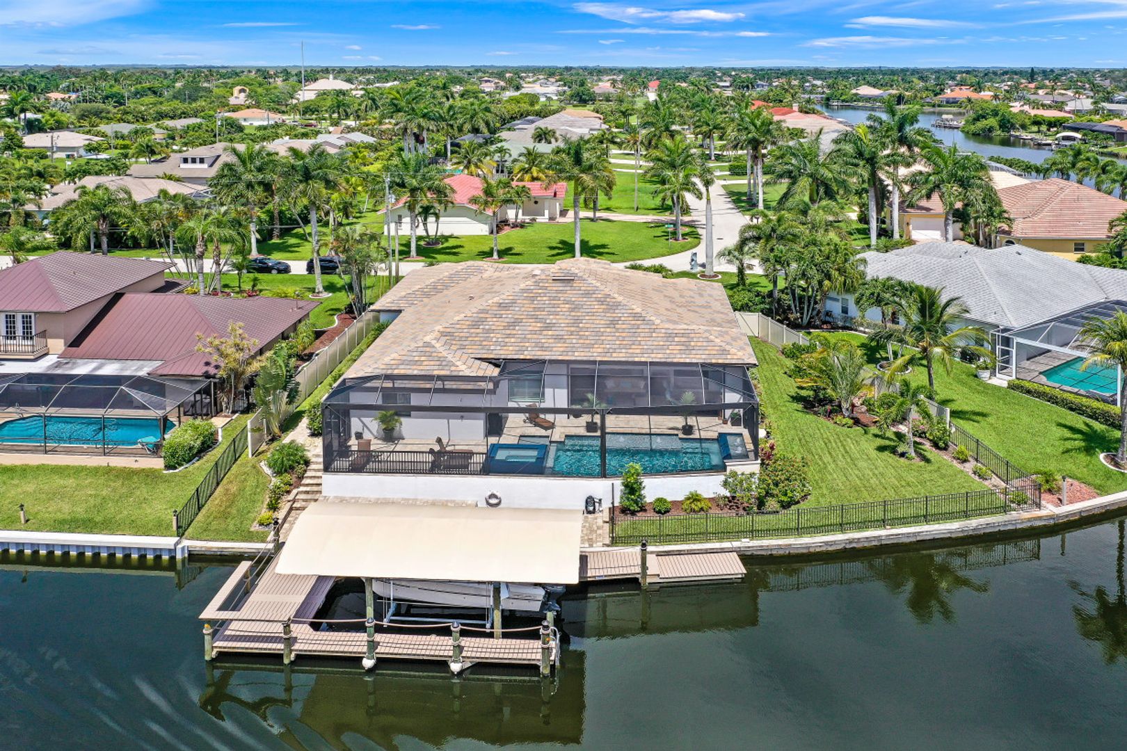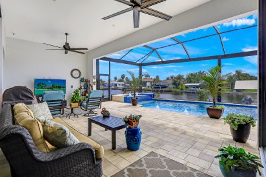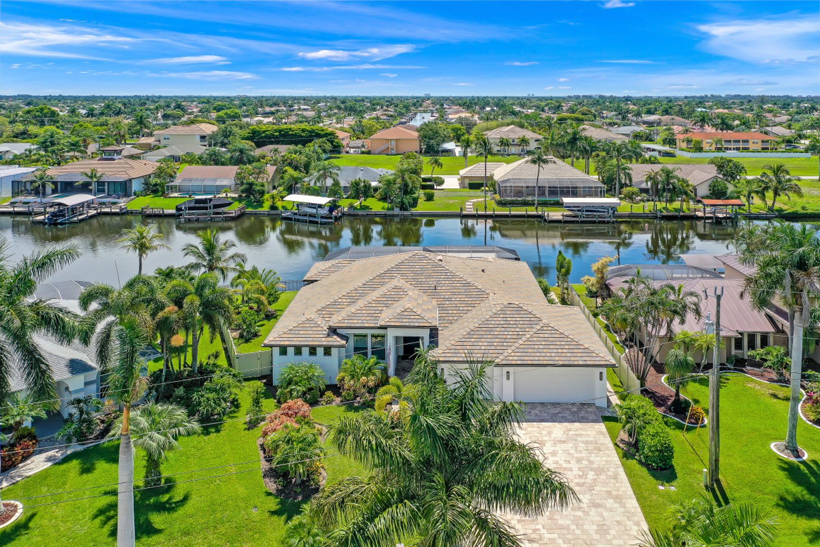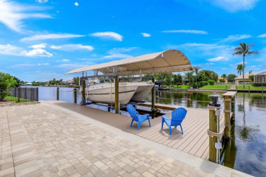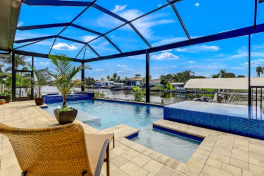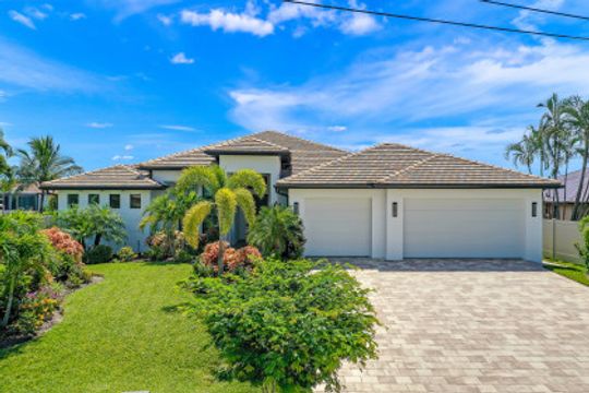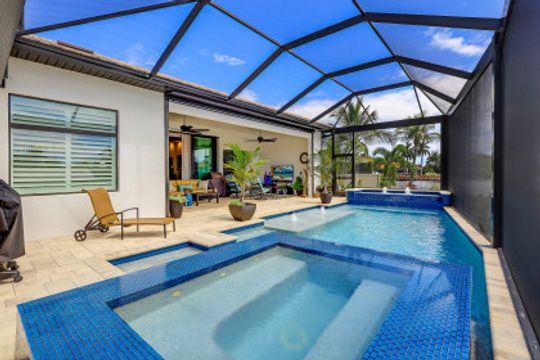 WIDE INTERSECTING CANAL VIEWS, WALKING DISTANCE TO CAPE HARBOUR SHOPS, RESTAURANTS & ENTERTAINMENT! 2-Year Old Modern Contemporary Home 5BR, 4BA, 3 Car Garage w/Workshop. 12ft ceilings, floating cabinets, IMPACT WINDOWS/DOORS, 12x28 porcelain tile, upgraded ceiling fans/LED lighting & coffered ceilings. Gourmet kitchen showcases high end appliances like Sub Zero refrigeration & GE Monogram wine/bev fridge, huge 13x4 quartz countertop island & so many gorgeous cabinets! Video surveillance system, whole house surge protection & generator transfer switch. Outdoor living exceeds expectations in this safe & convenient walking, biking & boating community. Beautiful landscaping, FENCED yard, heated saltwater pool include 4 tranquil fountains, cascading waterfall, spa & sun shelves all surrounded by picture window bug-free screening. Boaters will be pleased by the Captains Walk, HUGE wrap around composite dock, 10K boat lift & kayak launch. Perfect for the entertainer or for quiet personal enjoyment nestled in SW Cape Coral boating community. You deserve to enjoy everything that SW FL has to offer: boat, kayak, jet ski, fish; or take a dip in your private oasis! Furnishings negotiable!