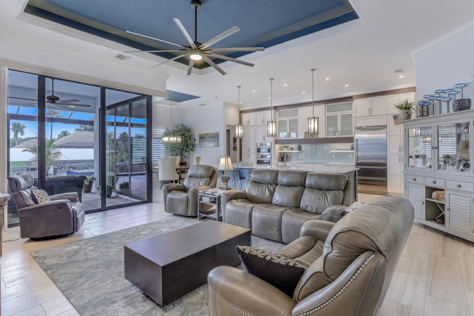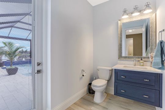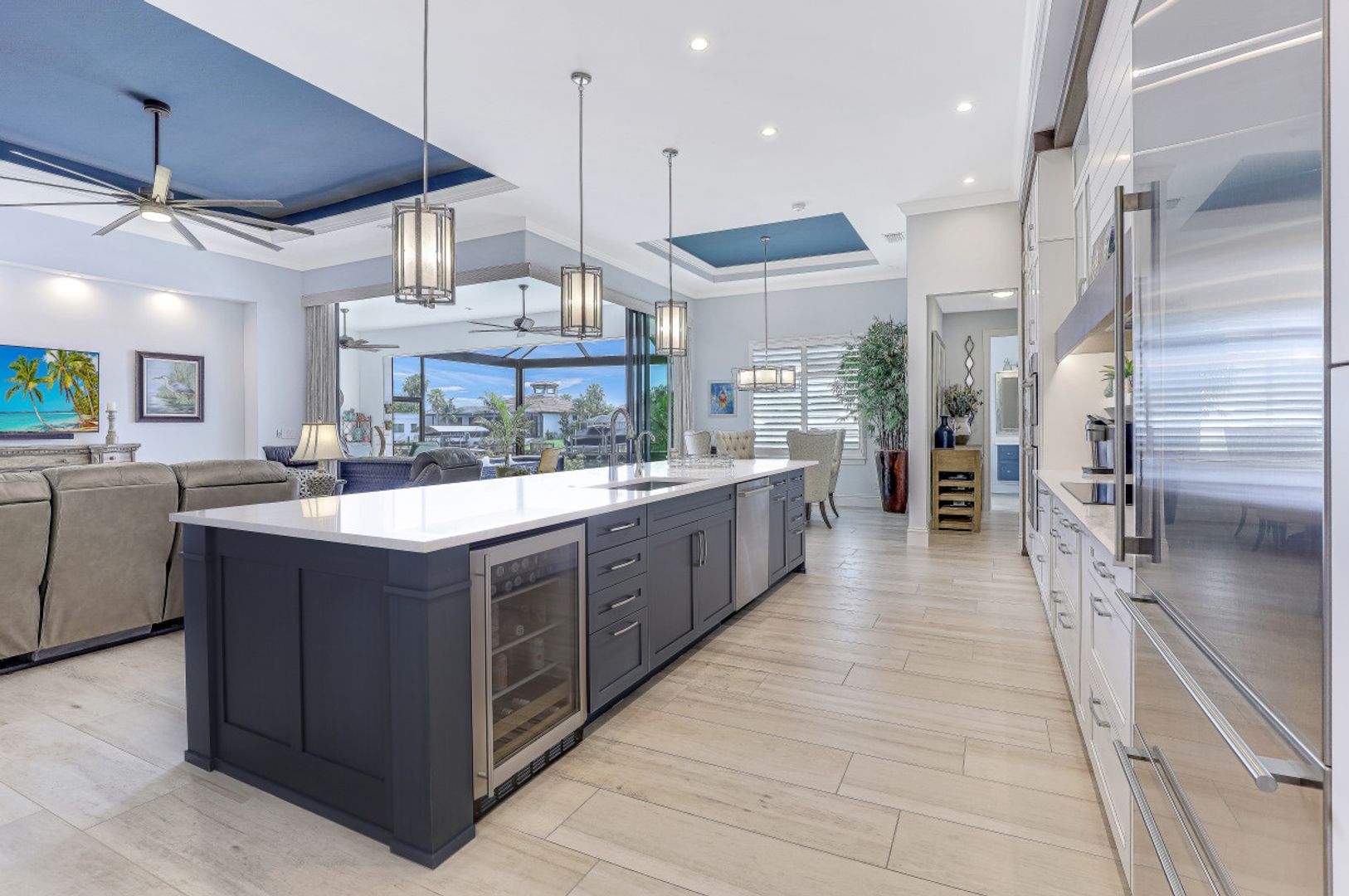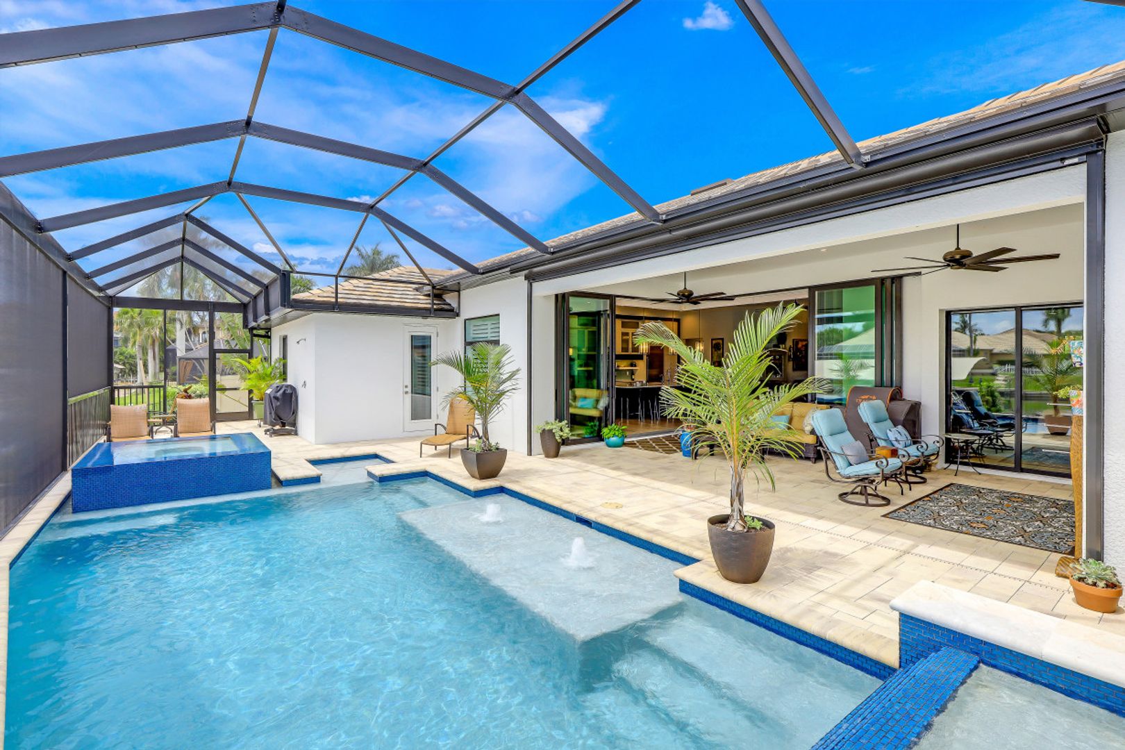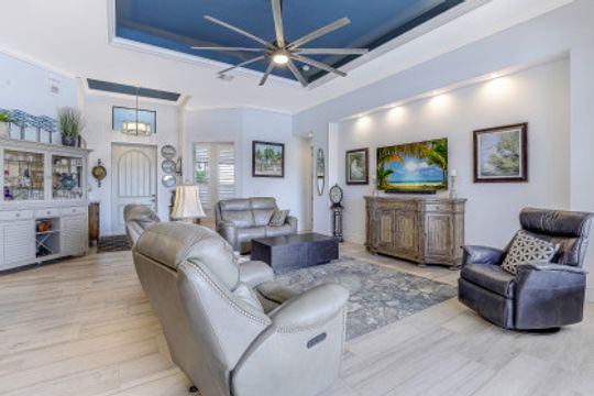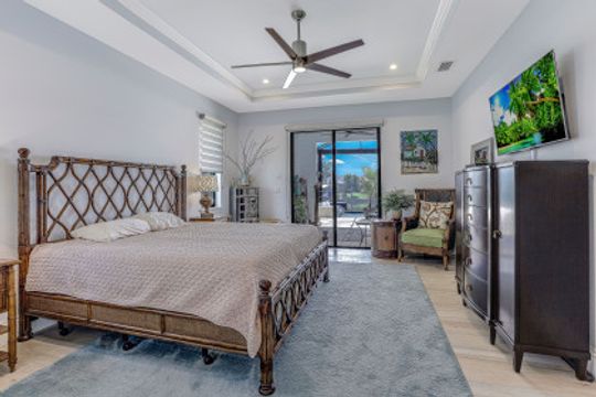 WIDE INTERSECTING CANAL VIEWS, WALKING DISTANCE TO CAPE HARBOUR SHOPS, RESTAURANTS & ENTERTAINMENT! 2-Year Old Modern Contemporary Home 5BR, 4BA, 3 Car Garage w/Workshop. 12ft ceilings, floating cabinets, IMPACT WINDOWS/DOORS, 12x28 porcelain tile, upgraded ceiling fans/LED lighting & coffered ceilings. Gourmet kitchen showcases high end appliances like Sub Zero refrigeration & GE Monogram wine/bev fridge, huge 13x4 quartz countertop island & so many gorgeous cabinets! Video surveillance system, whole house surge protection & generator transfer switch. Outdoor living exceeds expectations in this safe & convenient walking, biking & boating community. Beautiful landscaping, FENCED yard, heated saltwater pool include 4 tranquil fountains, cascading waterfall, spa & sun shelves all surrounded by picture window bug-free screening. Boaters will be pleased by the Captains Walk, HUGE wrap around composite dock, 10K boat lift & kayak launch. Perfect for the entertainer or for quiet personal enjoyment nestled in SW Cape Coral boating community. You deserve to enjoy everything that SW FL has to offer: boat, kayak, jet ski, fish; or take a dip in your private oasis! Furnishings negotiable!